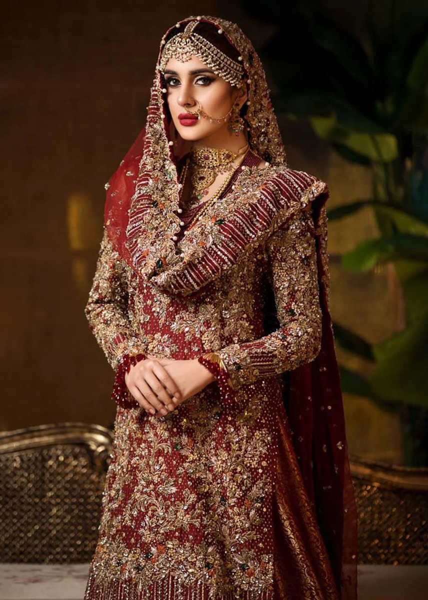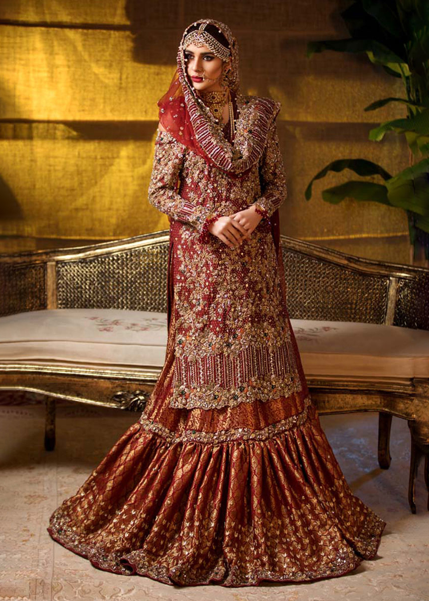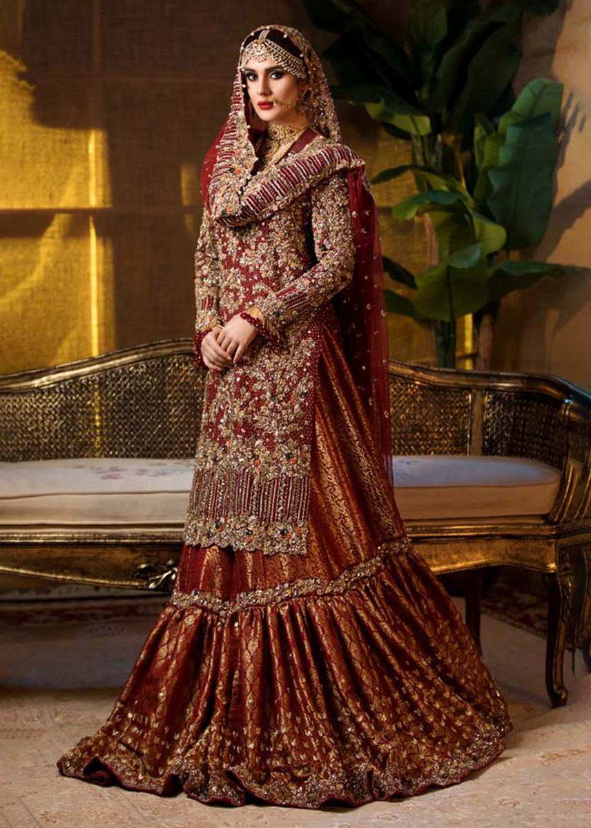 Timelessly hand embellished pure raw silk shirt paired with a jamawar farshi sharara and hand embellished tulle dupatta crafted meticulously for a royal bride.
