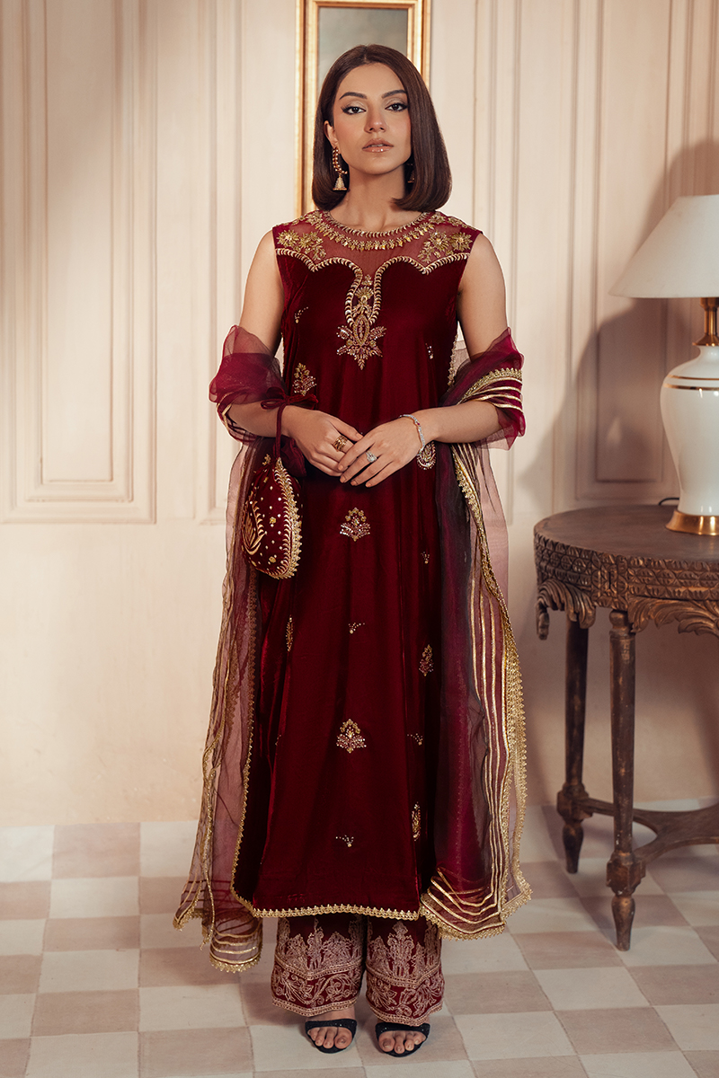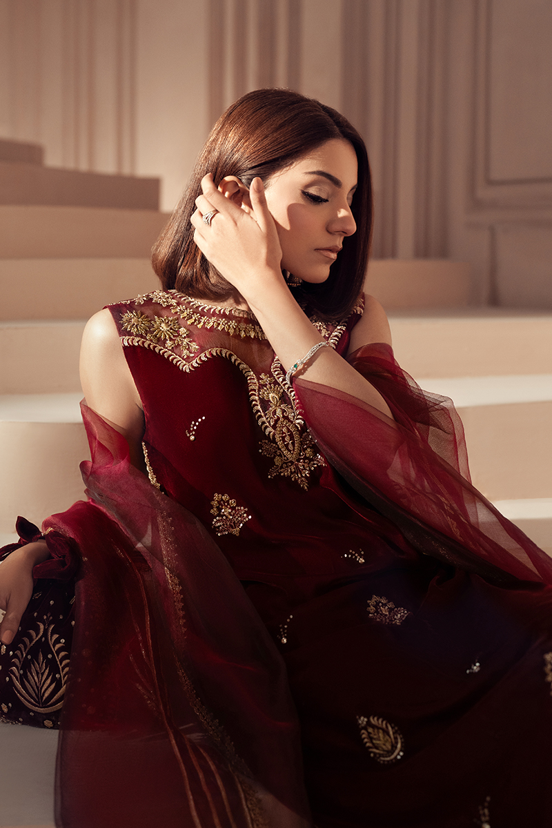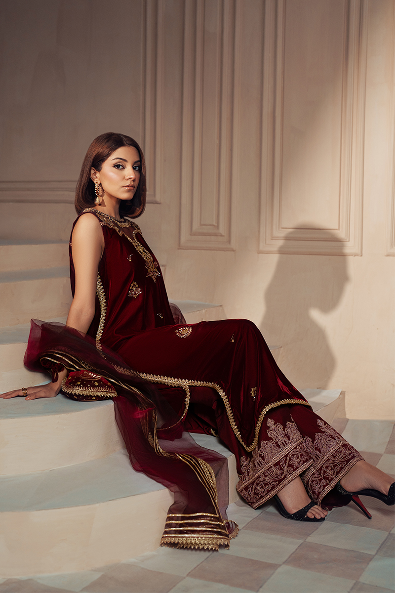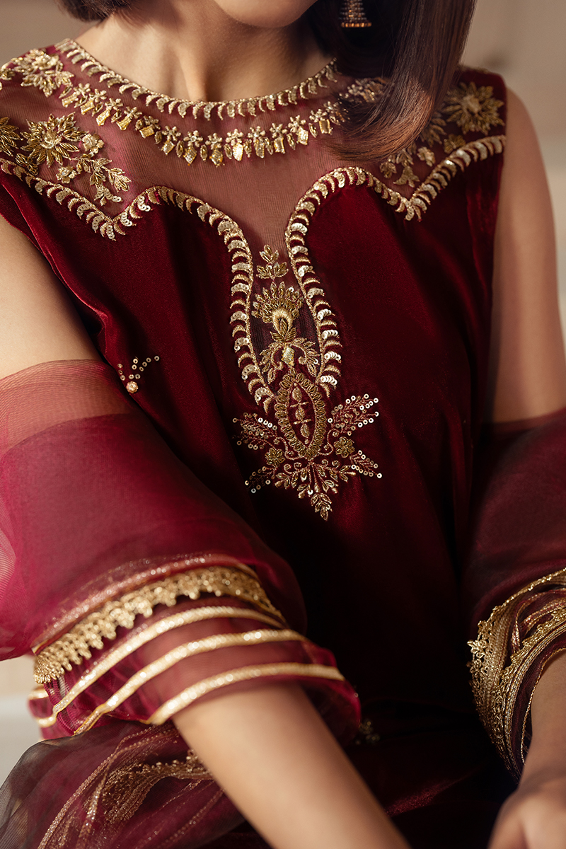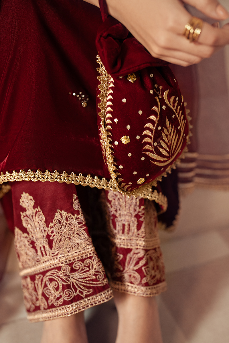 A luxurious maroon velvet shirt featuring organza detailing on the front and back neckline for a hint of sheer elegance. The front is adorned with a delicate motif spray, hand-embellished with dabka, gota, and sequins, creating a subtle yet captivating look. Paired with an organza dupatta, this ensemble is both stylish and refined. A matching pouch, hand-embellished with dabka, gota, and sequins, and a trouser can be added as optional accessories.