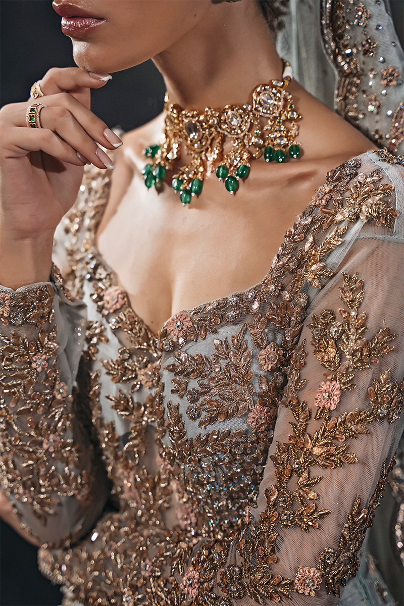 Radiate elegance and sophistication in this breathtaking, hand-embellished Raw Silk morning sky blue bridal. The stunning bodice and neckline are adorned with intricate zari, sequins, resham, cut dana, and gotta work on a serene cool blue canvas. Paired with a heavy hand-embellished bridal dupatta, showcasing gorgeous heavy pallu details and scallops all around. Perfect blend of traditional craftsmanship and modern elegance.