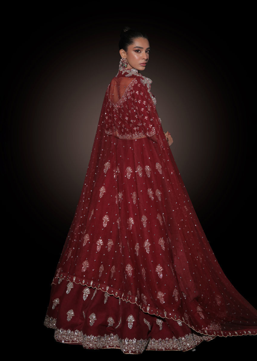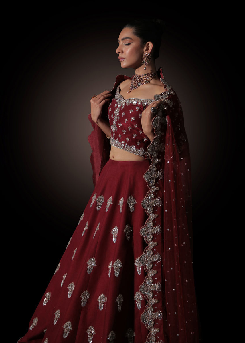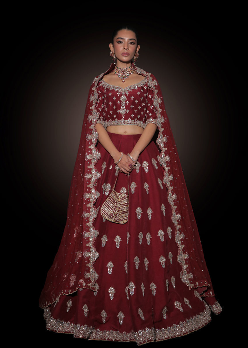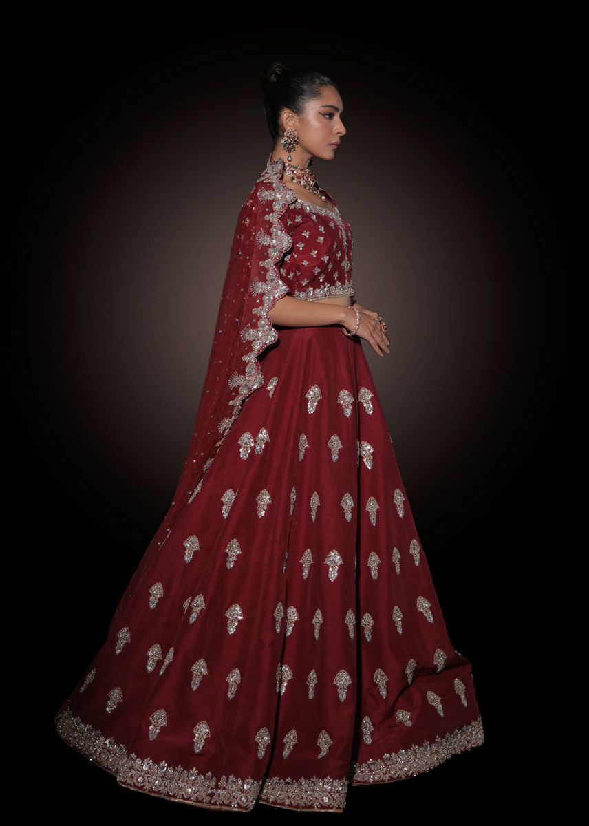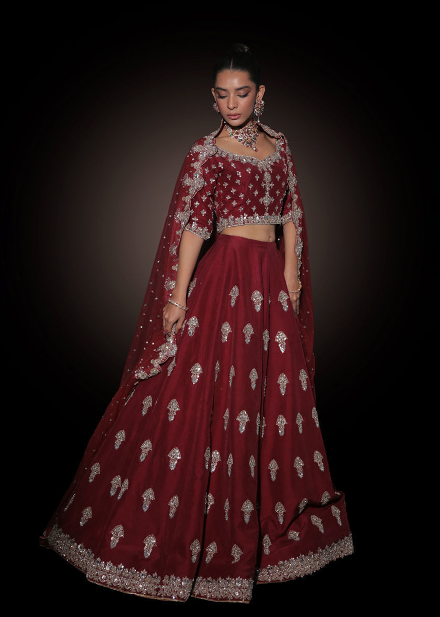 Crimson hand embellished lehnga choli with exquisite hand embellishment detailing all over with dabka, zardozi, naqshi and gota work all over. The sweetheart neckline with half sleeves blouse has delicate detailing all over. The geometric border on the silk canvas for the lehnga seem perfect for a contemporary fusion look.