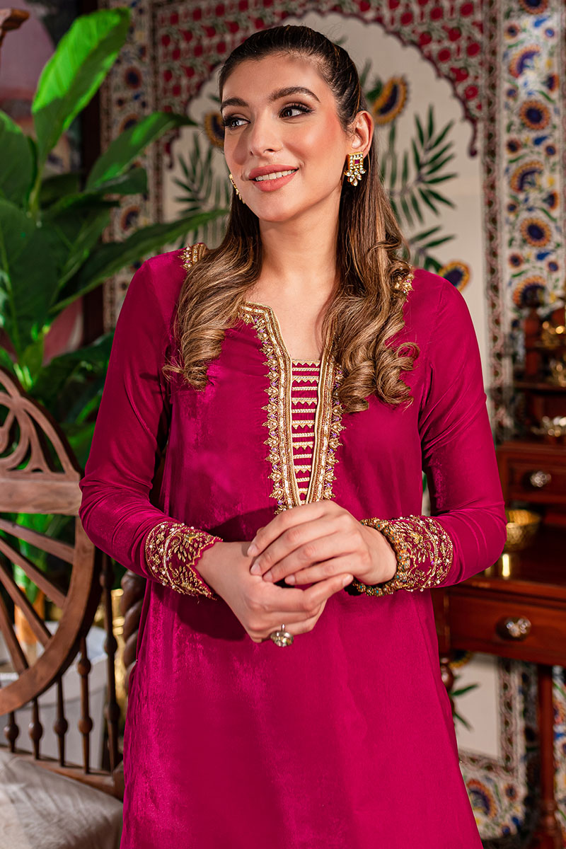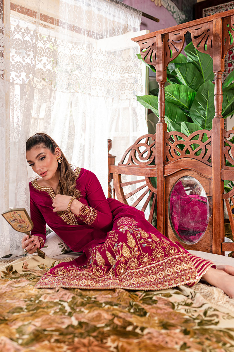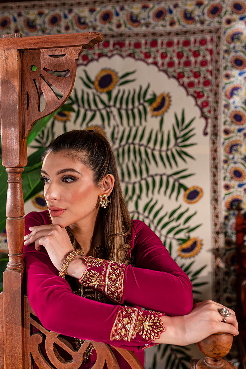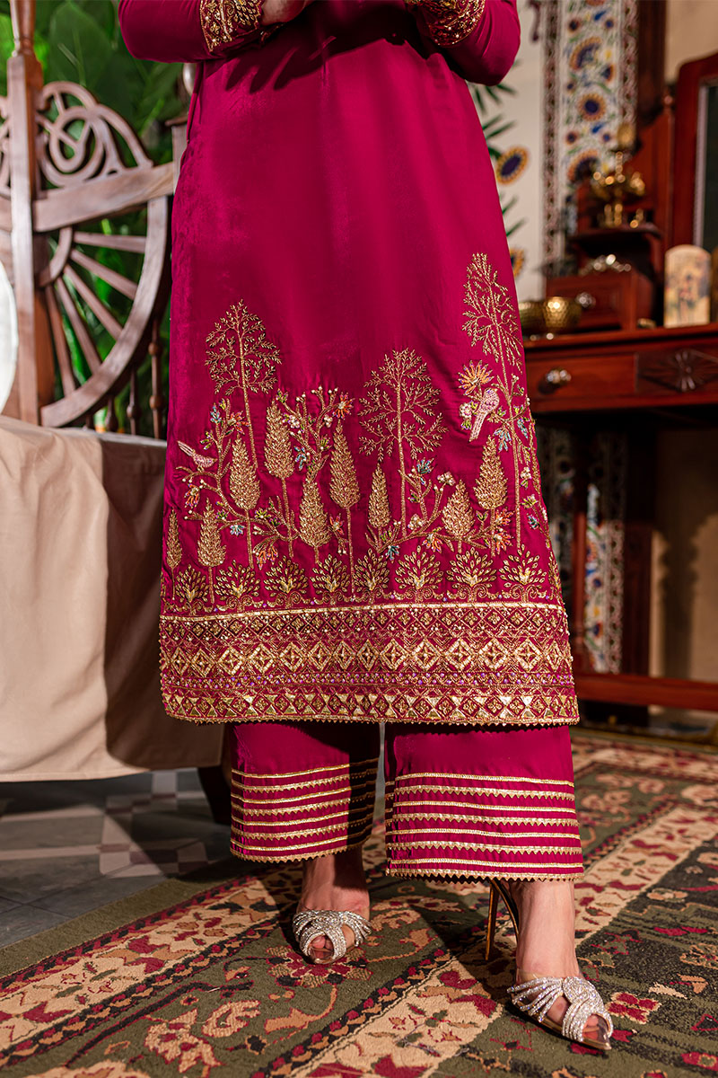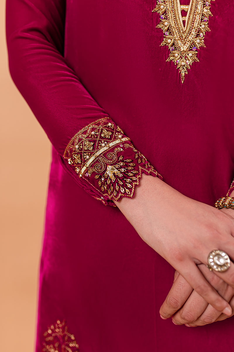 The ultimate hot pink must-have color for this winter’s festivities, to ensure that all eyes are on you at any special occasion. This forever flattering silhouette is cut from a plush velvet in the most popular shade of season, a striking pink hue. Adorned with intricate gold gota, zardozi, pearl and sequin embellishments on the neckline and fully hand embellished sleeves with a beautiful cut-worked sleeve hem and a heavily embellished hand resham, silk french knots, gota, pearl, sequin and zardozi worked persian inspired tree of life ghera. This outfit is going to be your immediate choice for an unforgettable wedding look. It can be paired with a crushed gold duppata, and lavishly gota embellished wide leg velvet pants as shown bringing out the whole outfit together enviable aplomb.