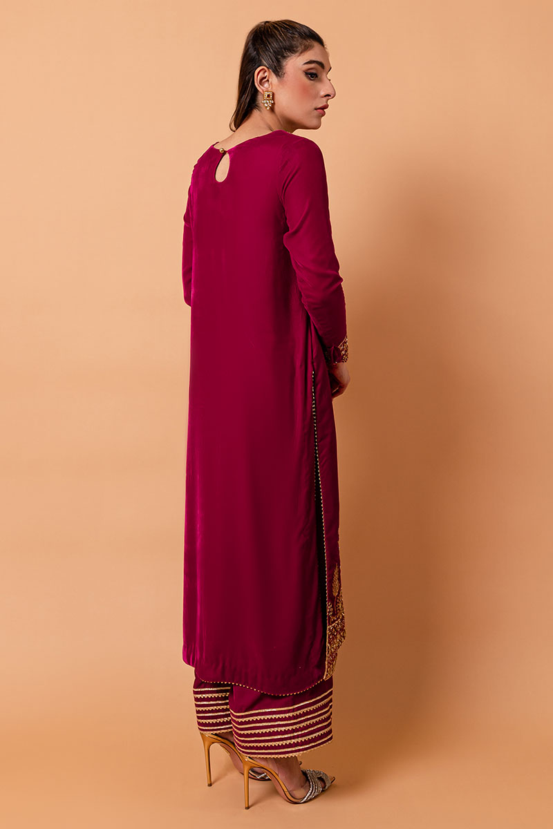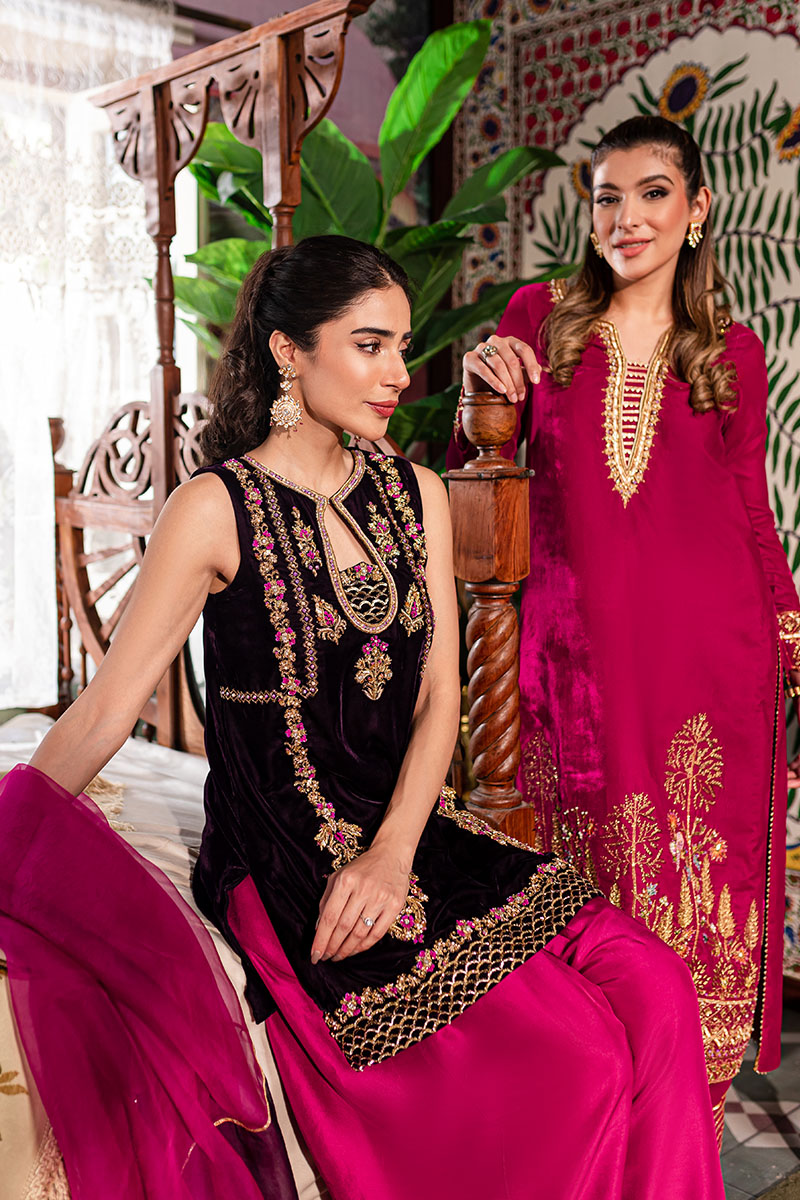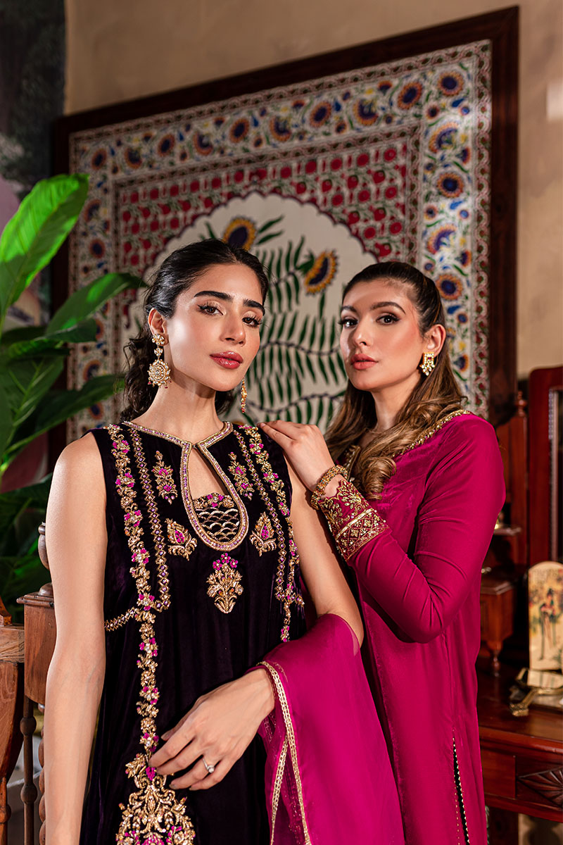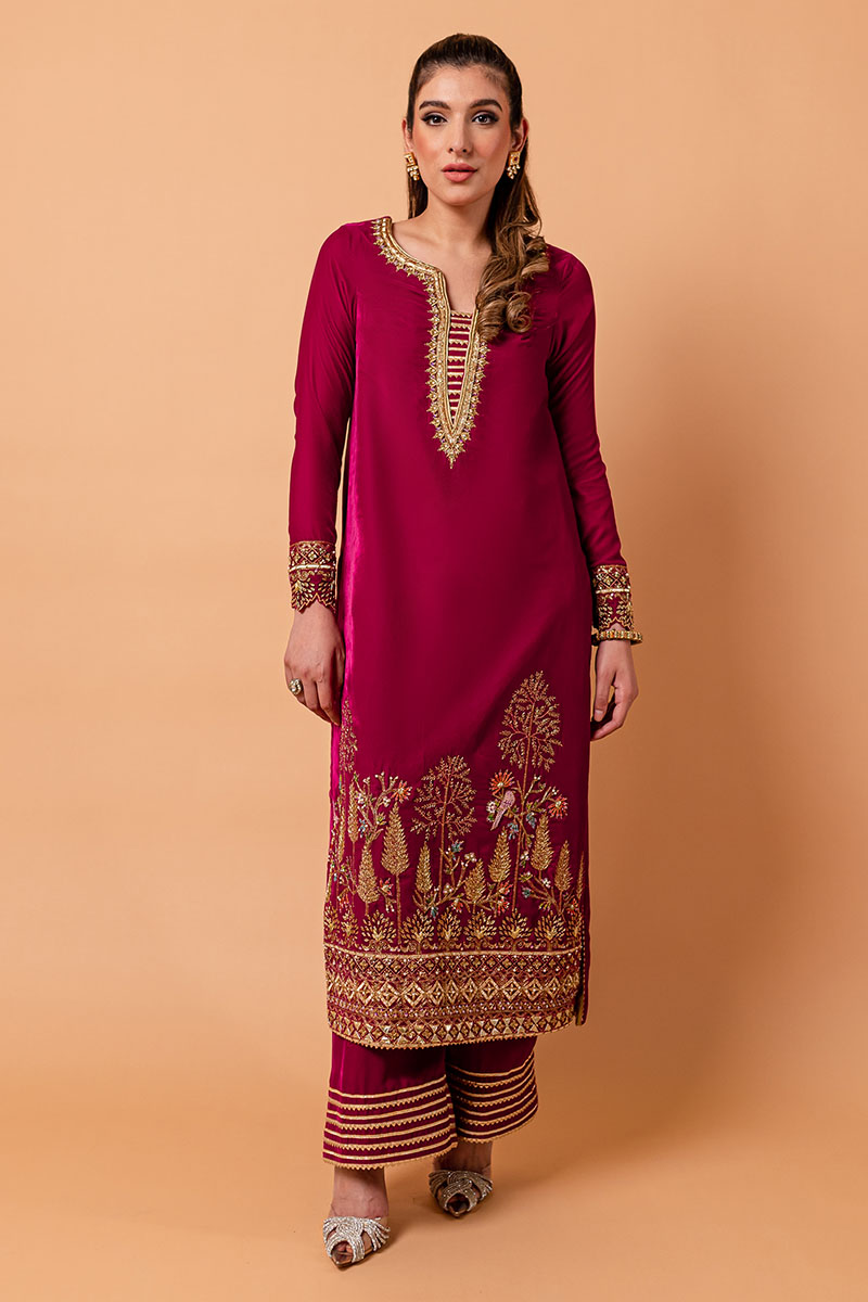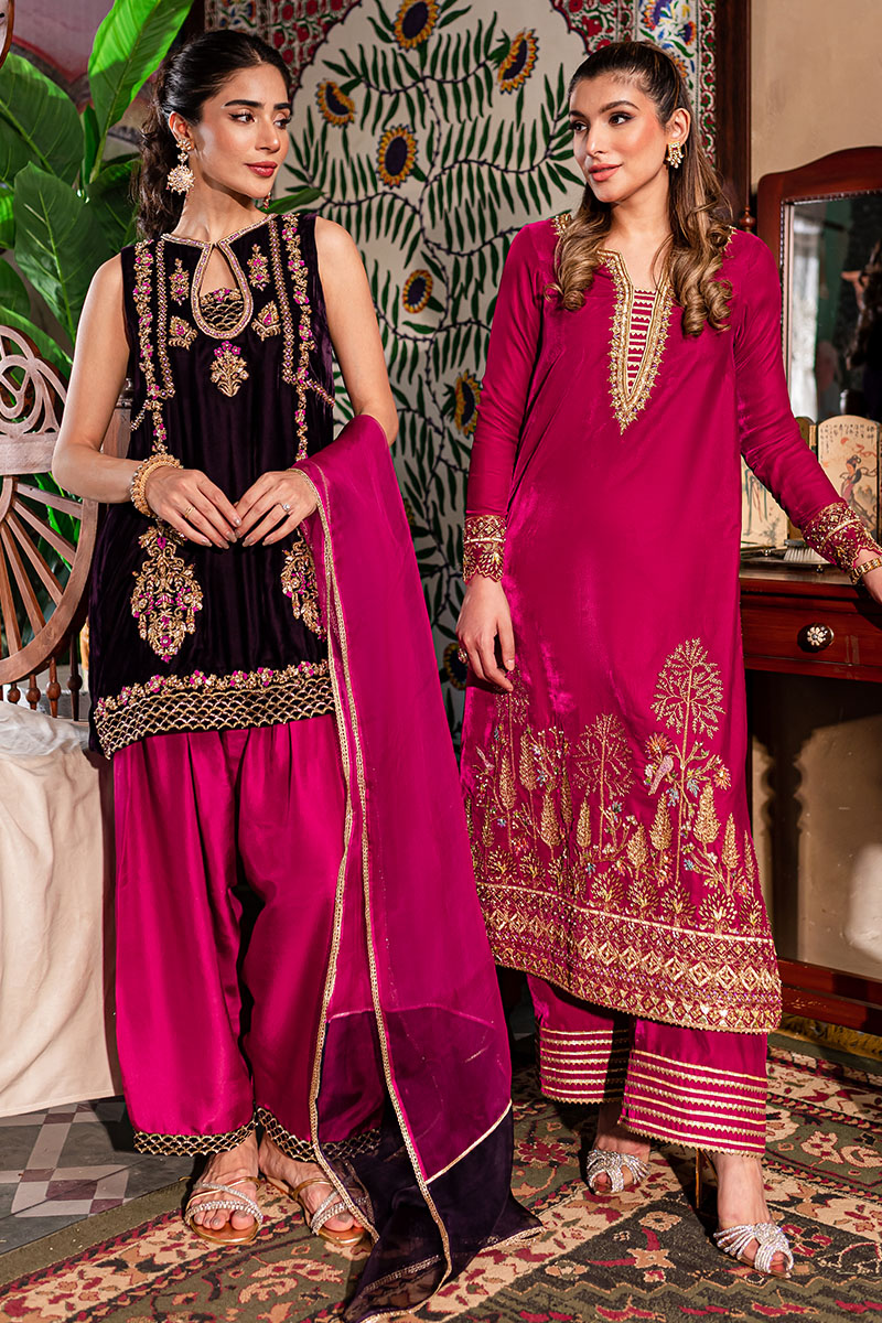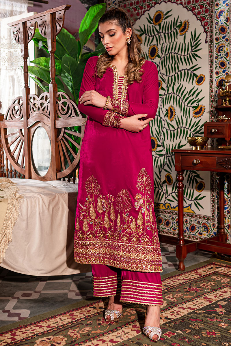 The ultimate hot pink must-have color for this winter’s festivities, to ensure that all eyes are on you at any special occasion. This forever flattering silhouette is cut from a plush velvet in the most popular shade of season, a striking pink hue. Adorned with intricate gold gota, zardozi, pearl and sequin embellishments on the neckline and fully hand embellished sleeves with a beautiful cut-worked sleeve hem and a heavily embellished hand resham, silk french knots, gota, pearl, sequin and zardozi worked persian inspired tree of life ghera. This outfit is going to be your immediate choice for an unforgettable wedding look. It can be paired with a crushed gold duppata, and lavishly gota embellished wide leg velvet pants as shown bringing out the whole outfit together enviable aplomb.