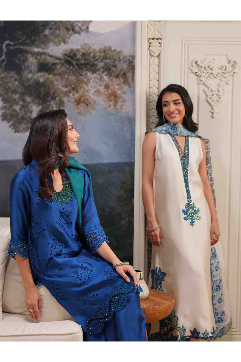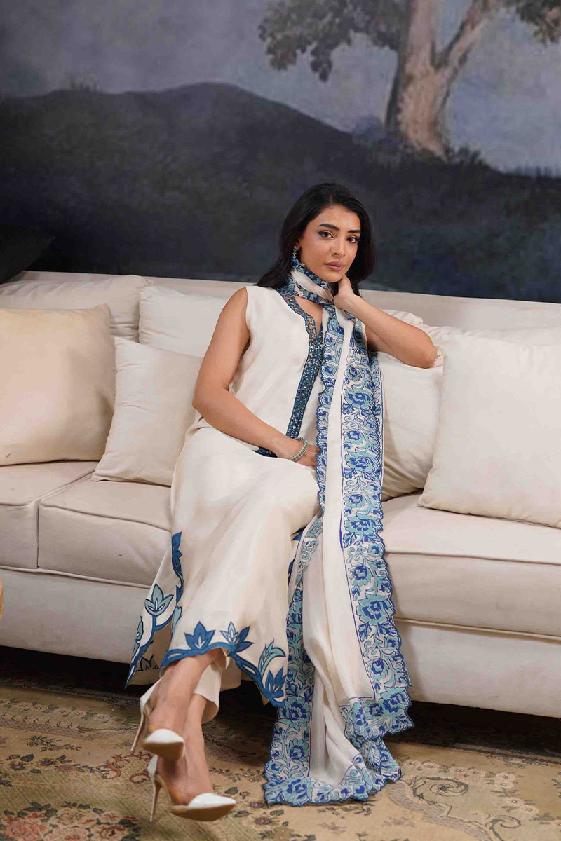 Step into an aura of refined sophistication with this meticulously crafted ivory ensemble, gracefully adorned with intricate azure embroidery. This sleeveless, A-line silhouette dress features a striking V-neckline, intricately embellished with latticework and glistening beads, drawing the eye to its artful craftsmanship.
