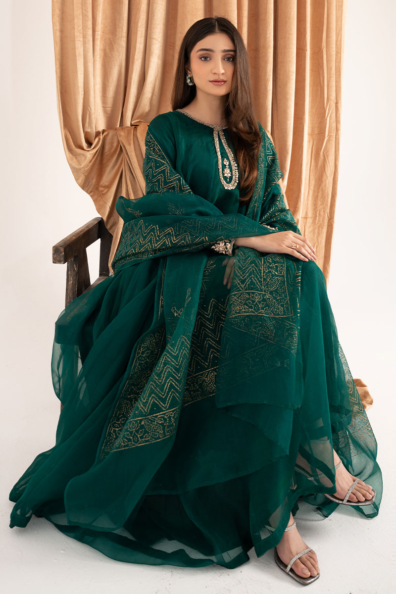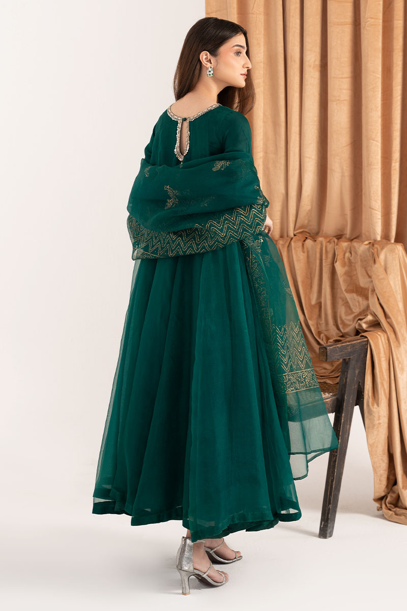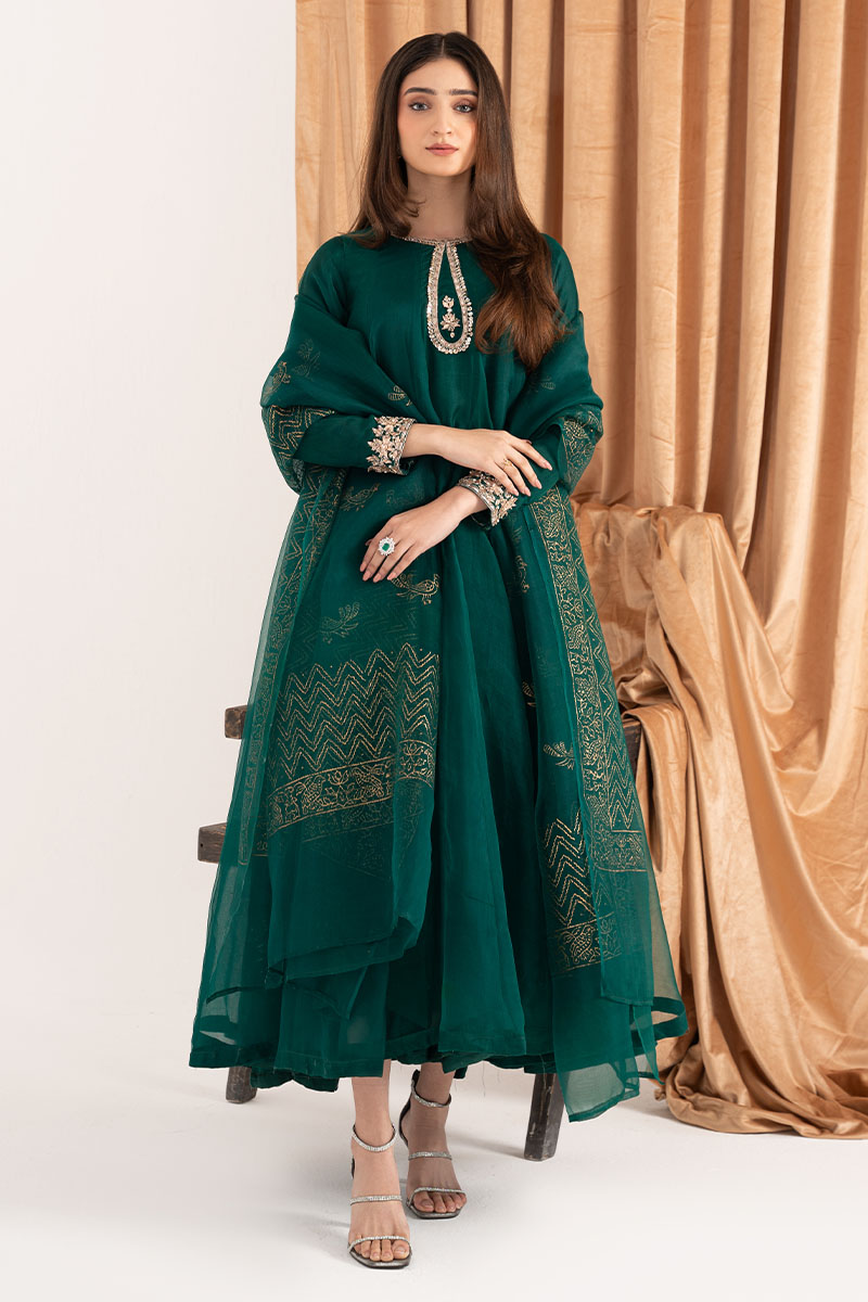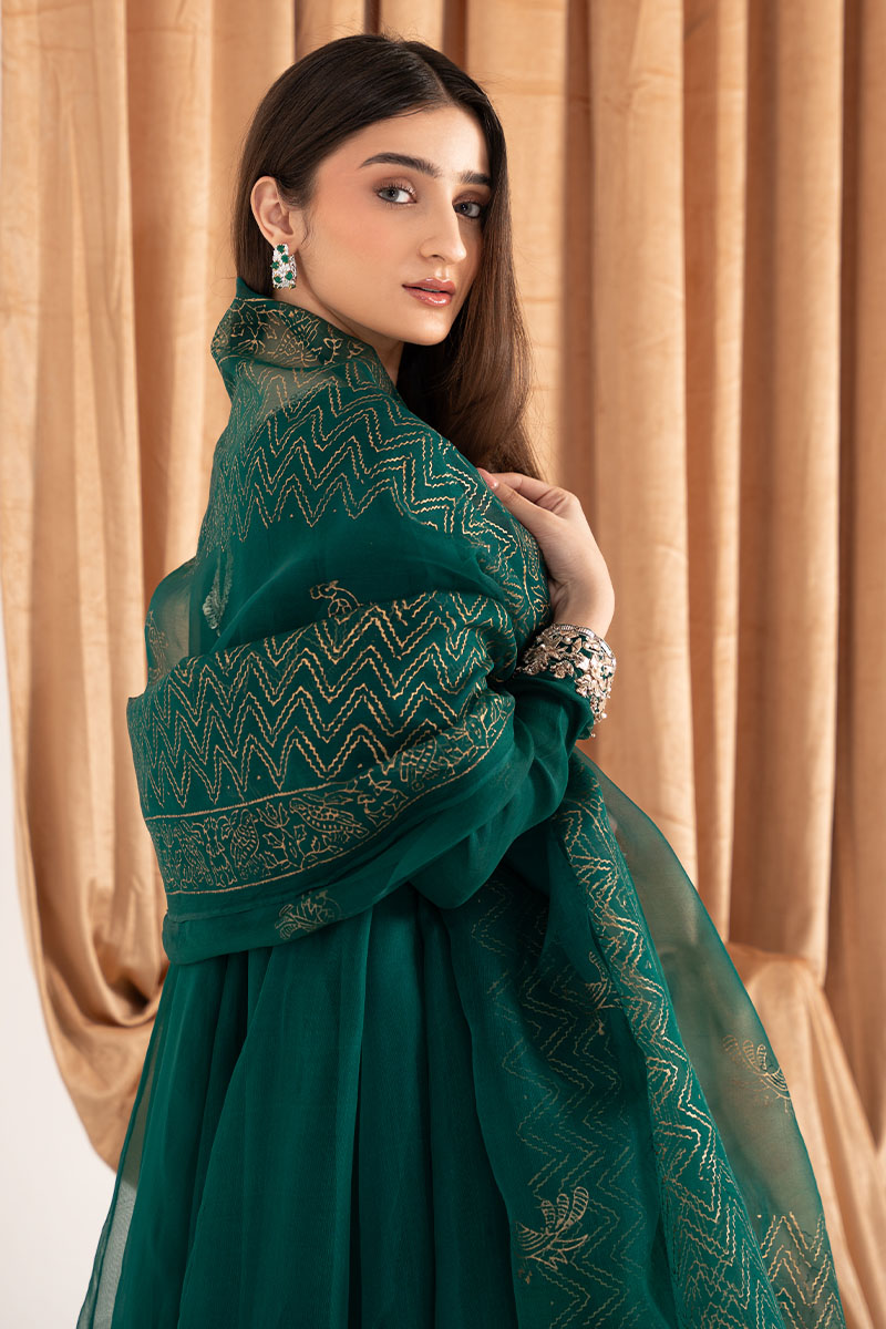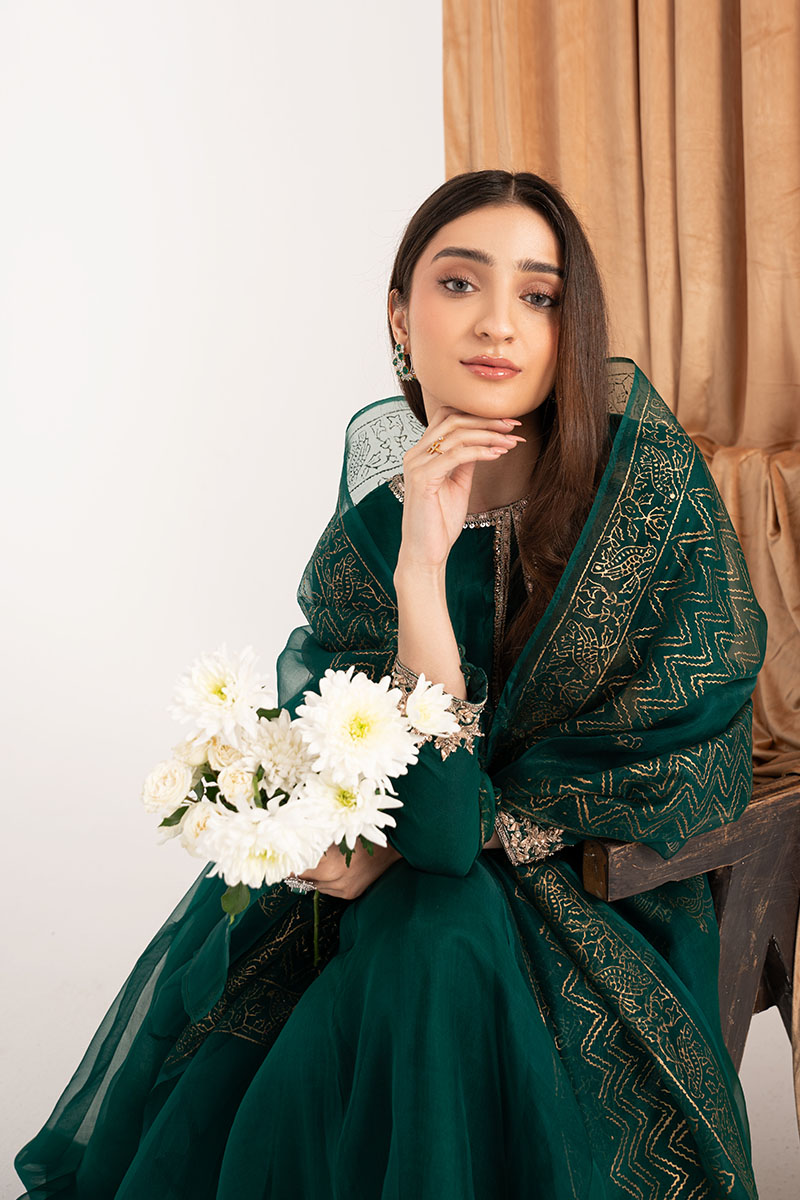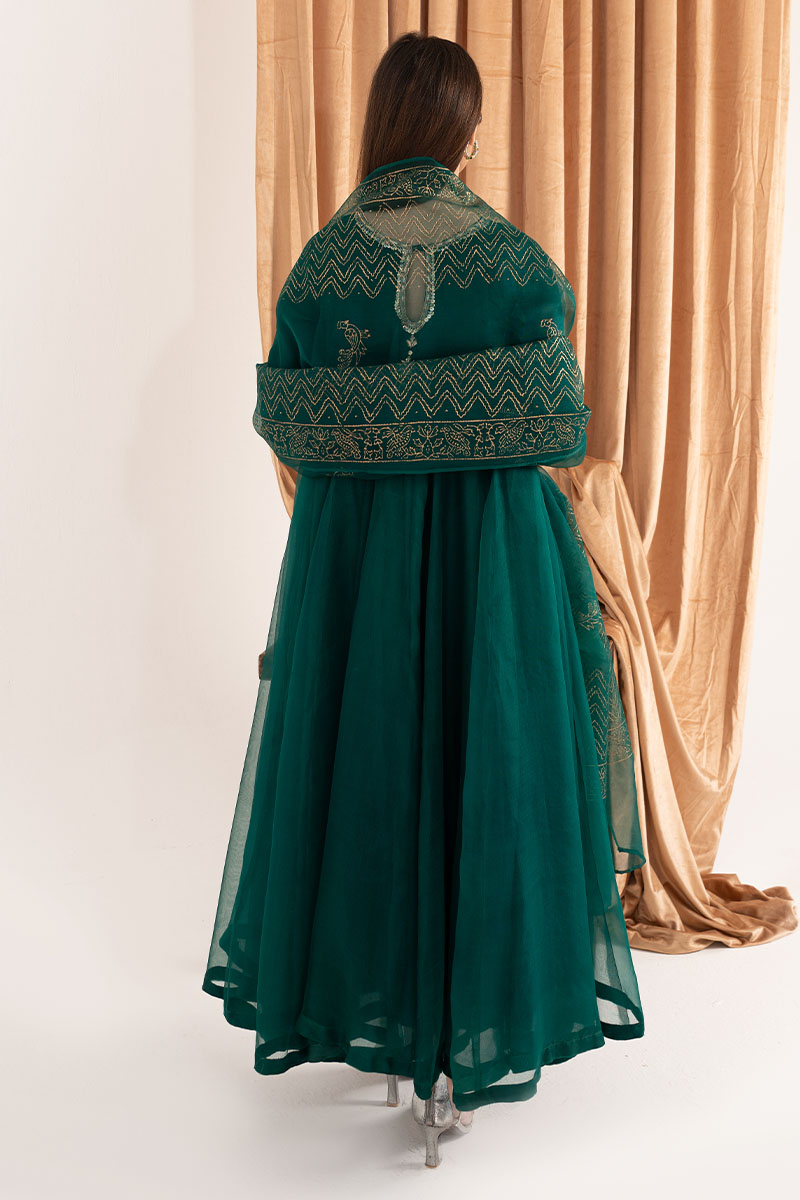 Exquisite design is shown in Emerald green organza kalidaar. The details around the neckline are hand-crafted ornaments consisting of, gota, pearl, dabka, and cutdana, also contributing towards the intricate floral handwork on sleeves. To complete the look same colored silk straight pants are paired. Emerald green pure organza block-printed dupatta uplifts the look and both can be purchased at additional cost.