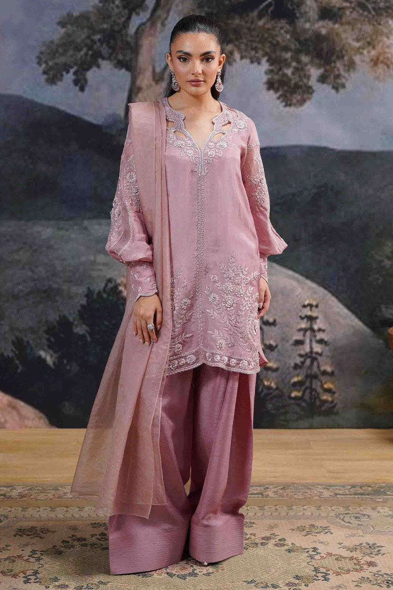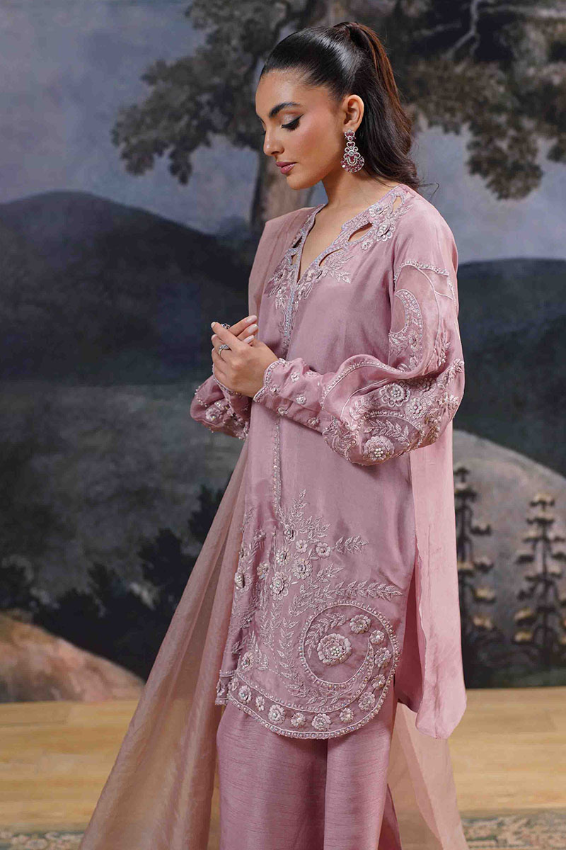 Step into a world of timeless elegance with this exquisite mauve ensemble, meticulously crafted for the modern woman with a taste for refined luxury. The outfit features a flowing, richly textured kurta adorned with intricate hand embellishment and 3D thread work, creating a mesmerizing symphony of floral and paisley motifs. Its delicate cutout detailing around the neckline adds a contemporary twist, while the full, billowing sleeves lend a touch of drama, balancing modern flair with classic grace.