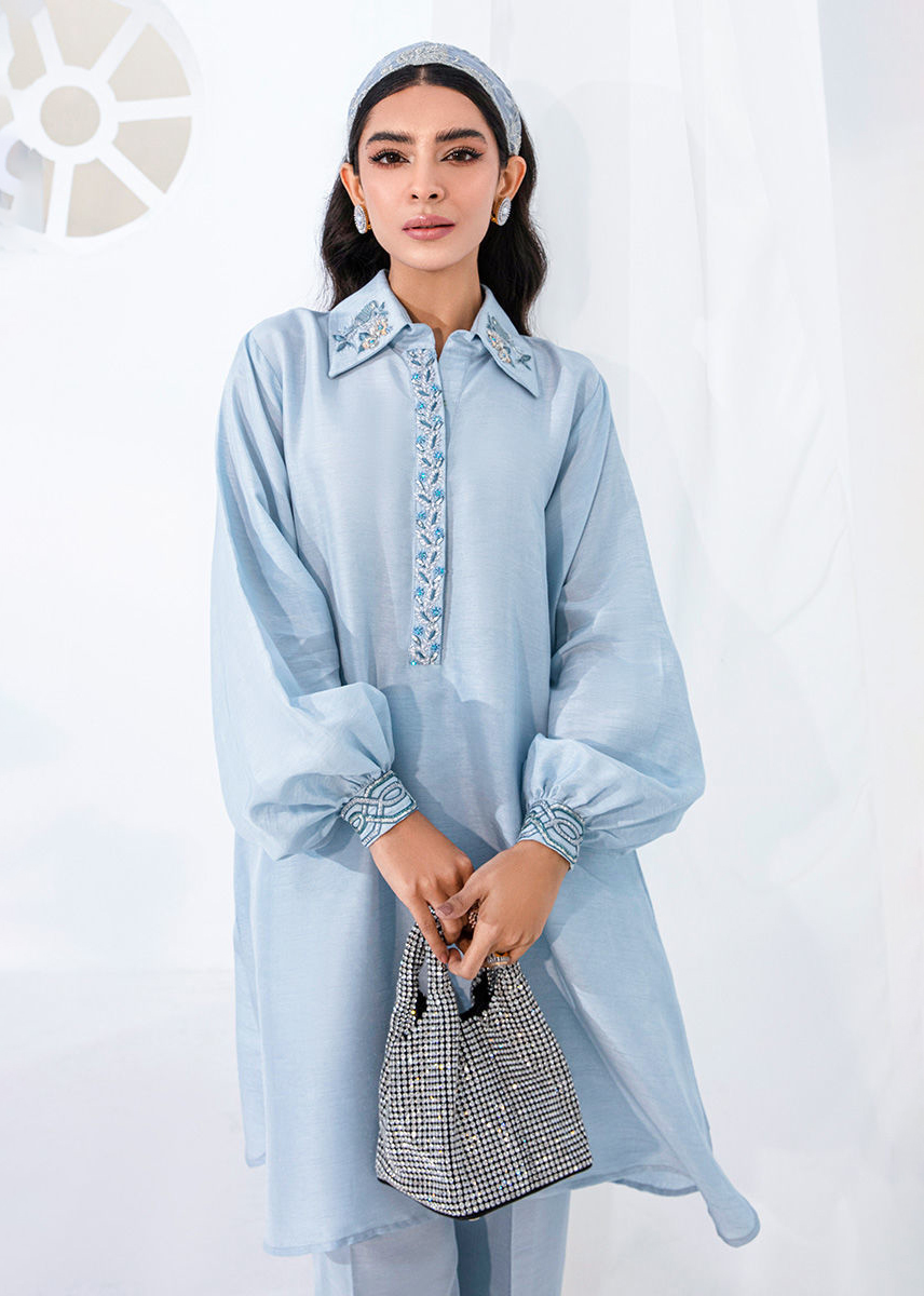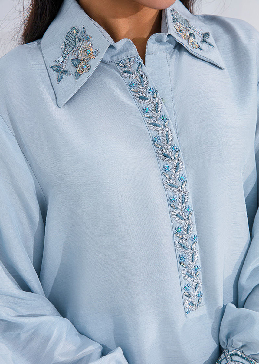 This gorgeous ice blue shirt is hand embellished with resham bird motives and floral detailing with geometric hand embellished cuffs on balloon sleeves and trousers. Paired with a delicate hand block printed silk dupatta.