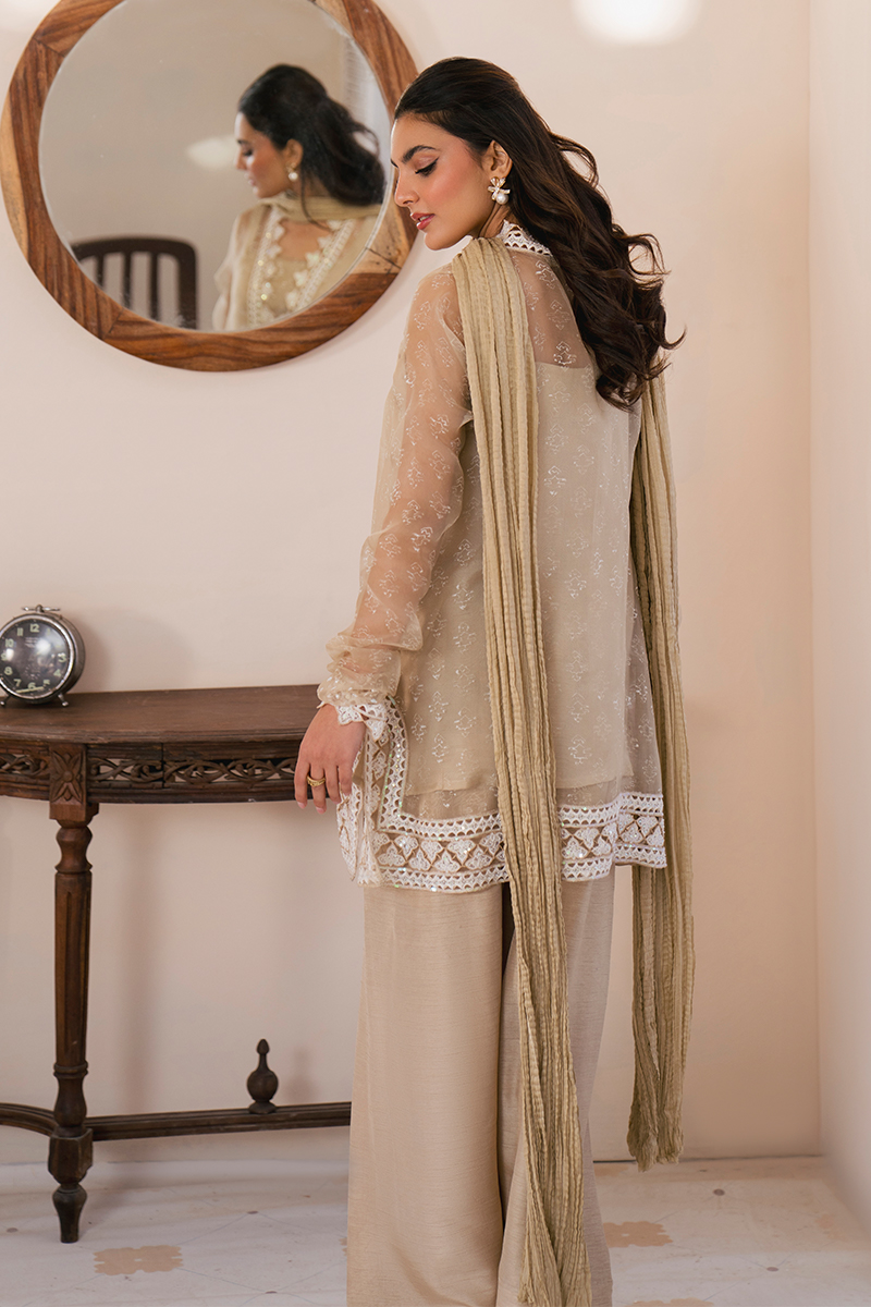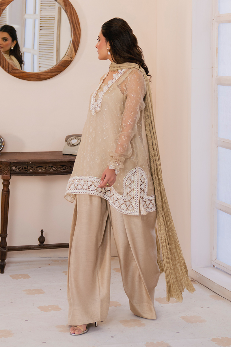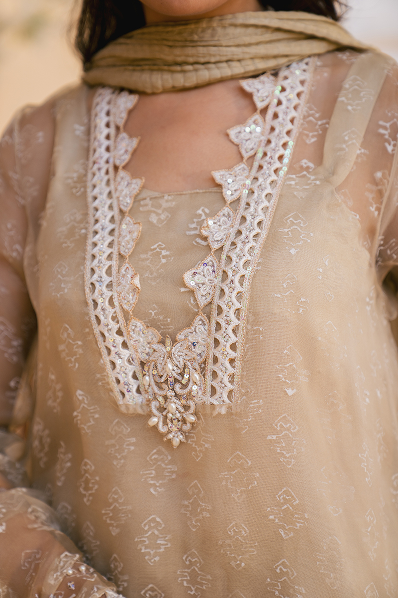 This elegant beige organza ensemble features a delicately block-printed and embroidered shirt with intricate detailing along the neckline and borders. Paired with a luxurious silk crush dupatta and a beautifully crafted Parsi shalwar, it exudes sophistication and traditional charm.