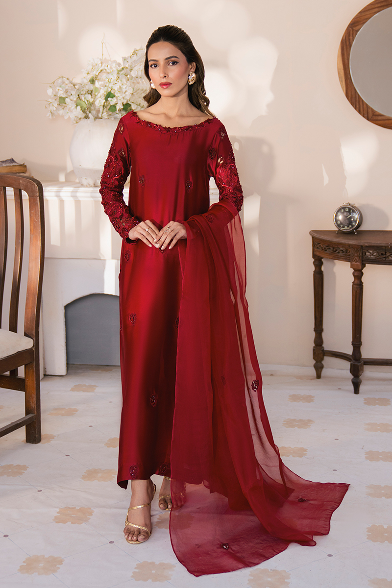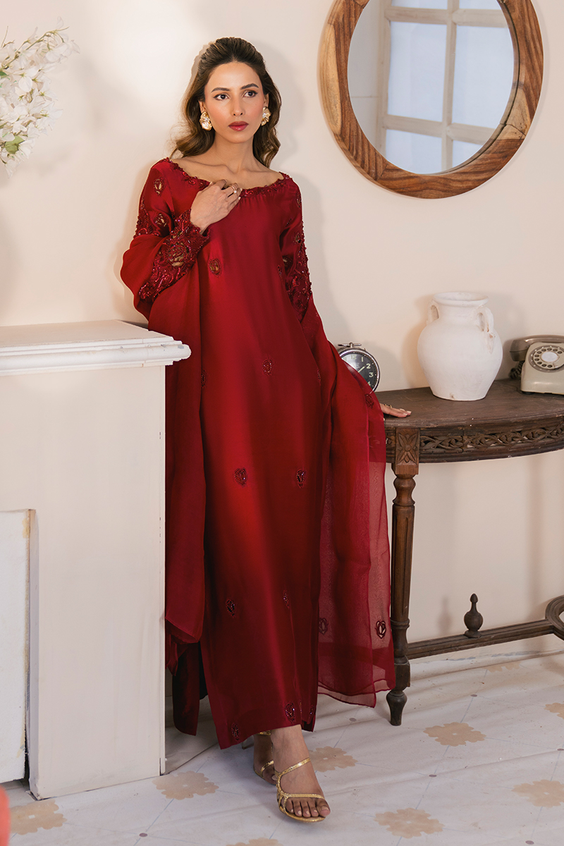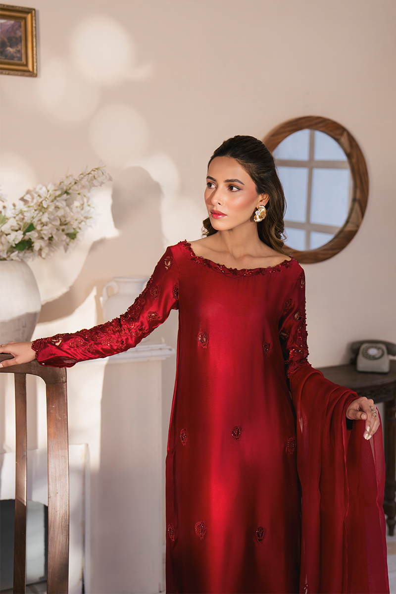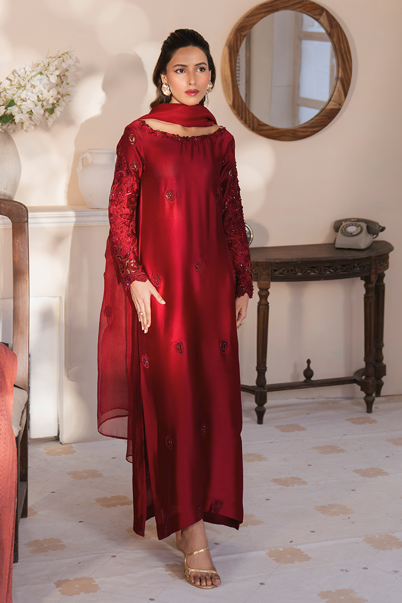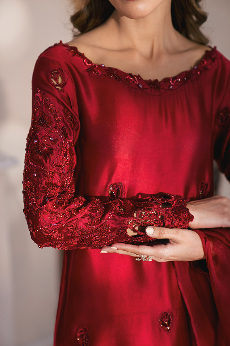 This stunning red ensemble features a tissue silk adorned with intricate embroidery enhancing the neckline, exuding timeless elegance. The outfit is complemented by an organza dupatta with delicate cutwork motifs and paired with a refined silk trouser.