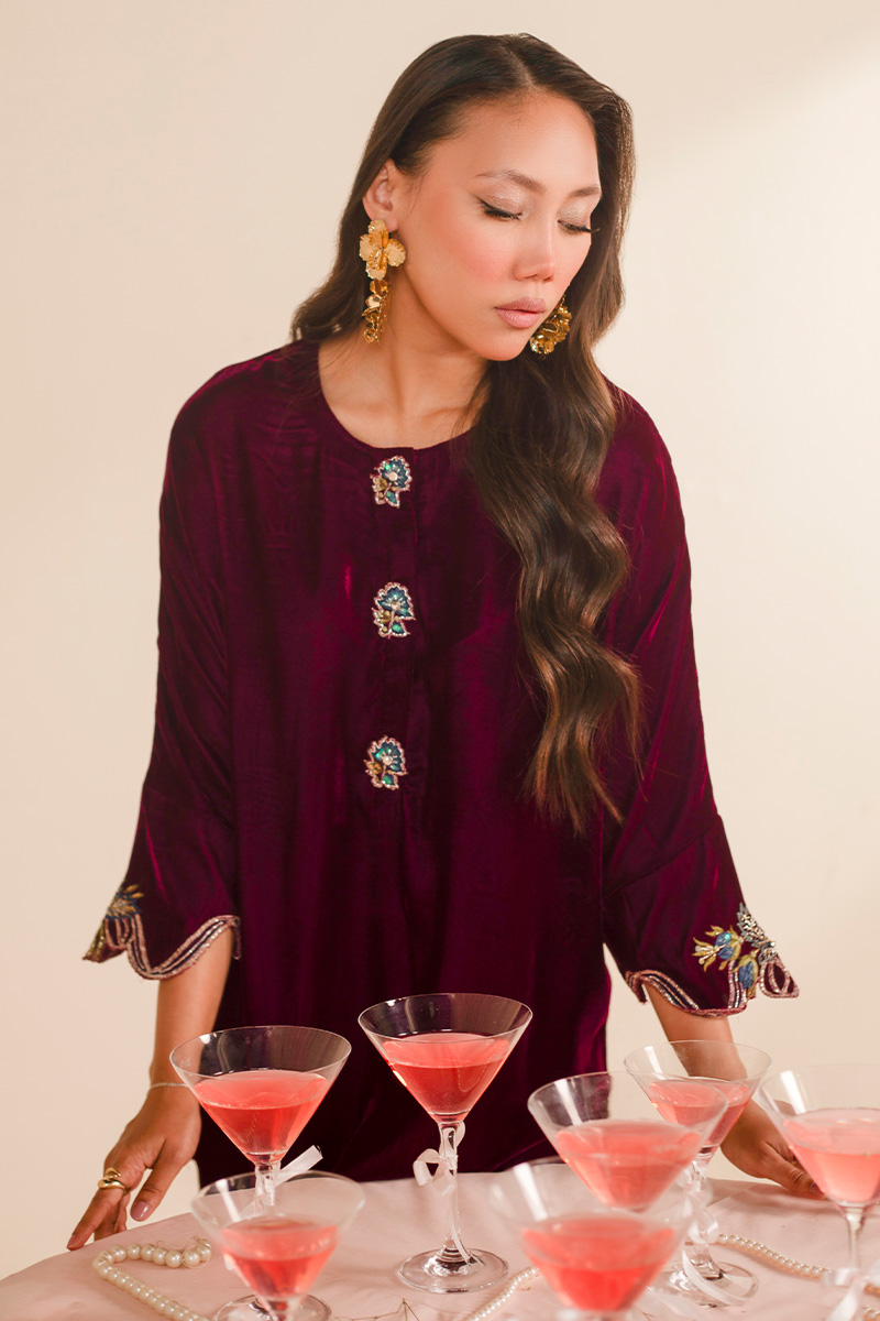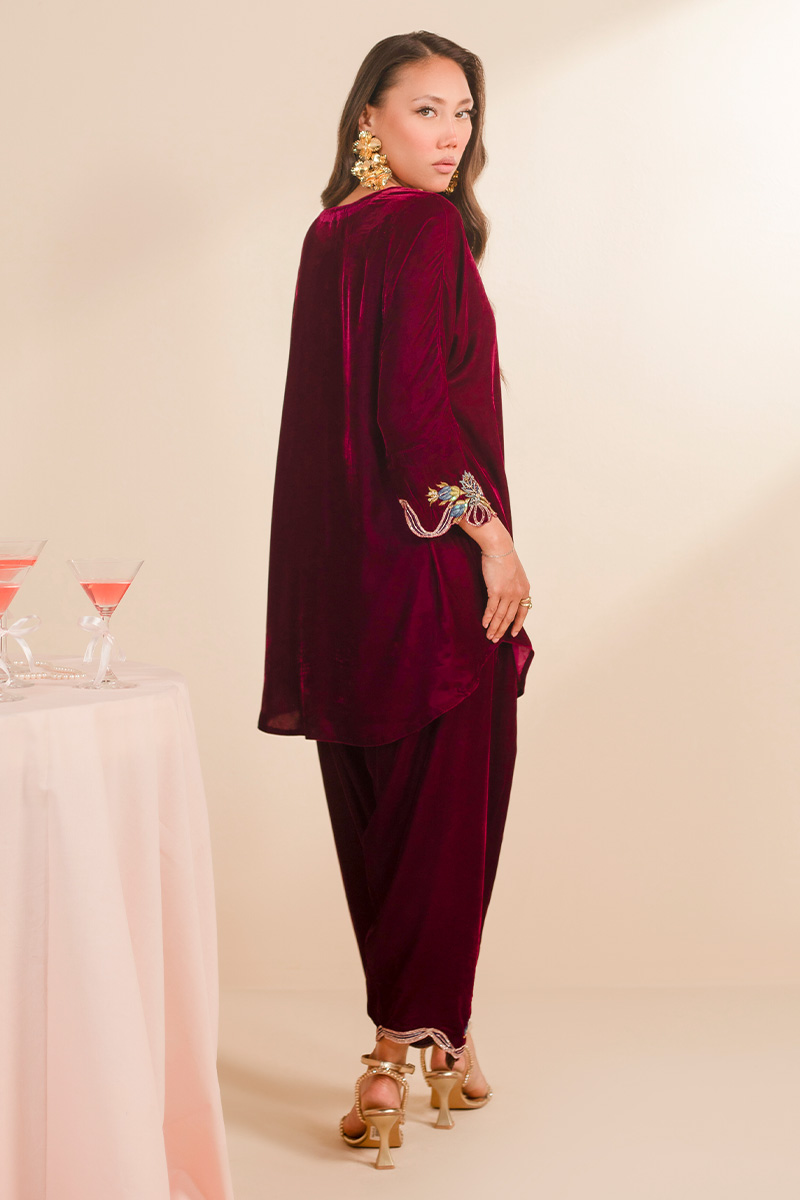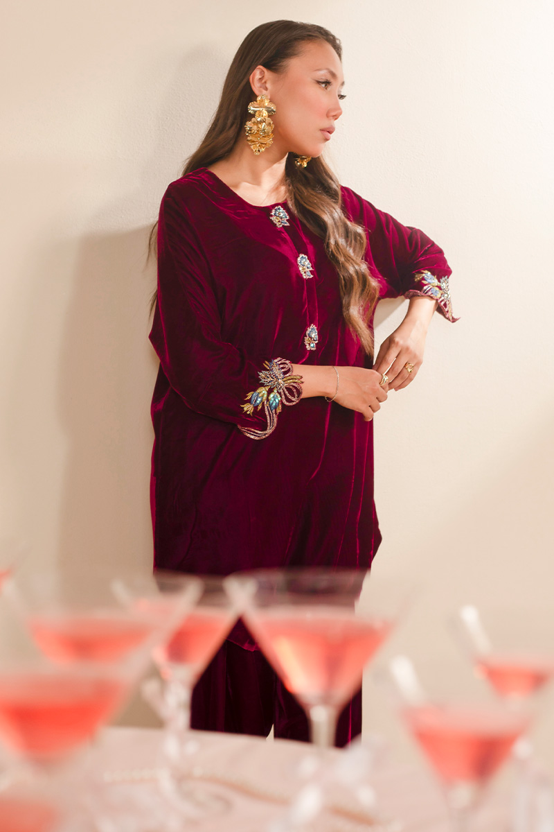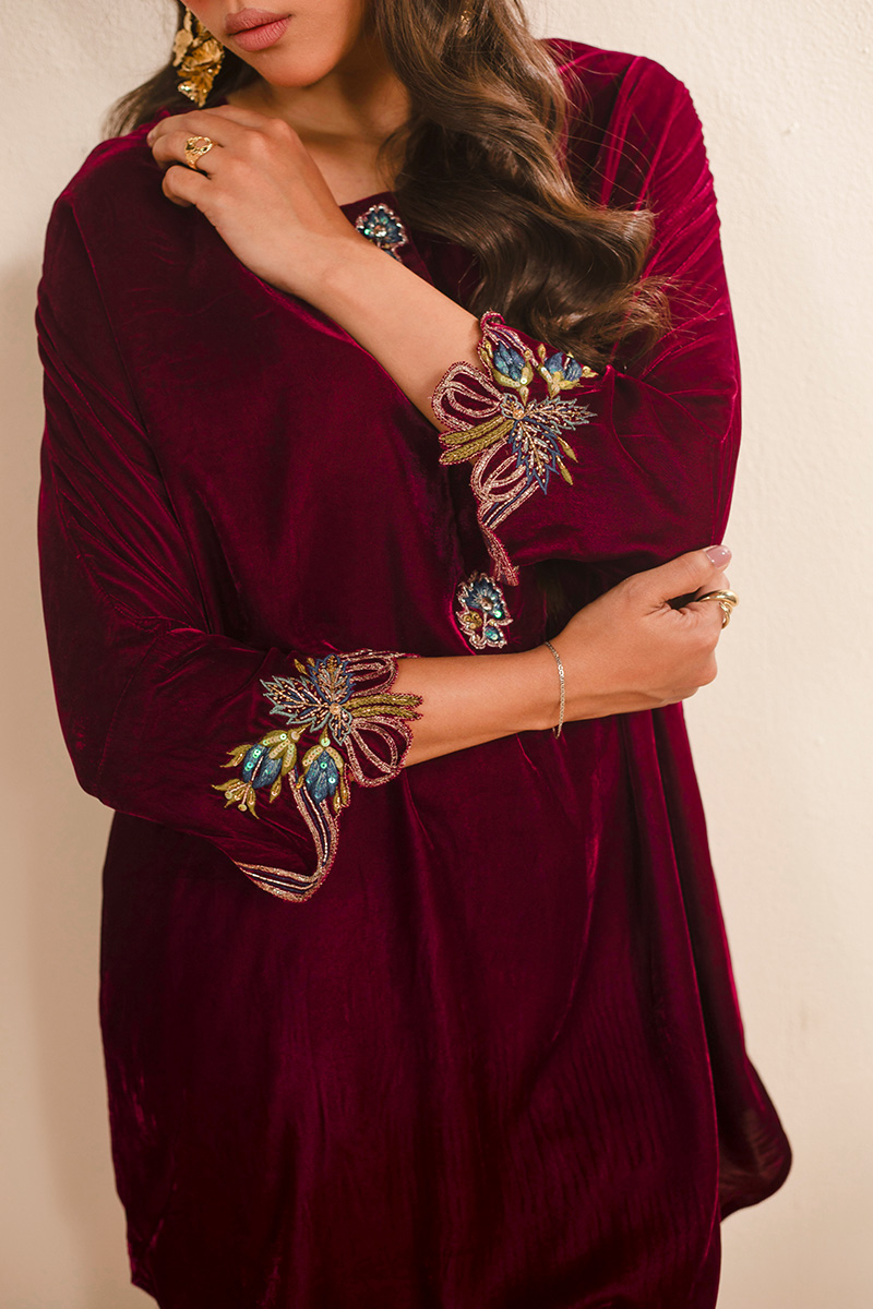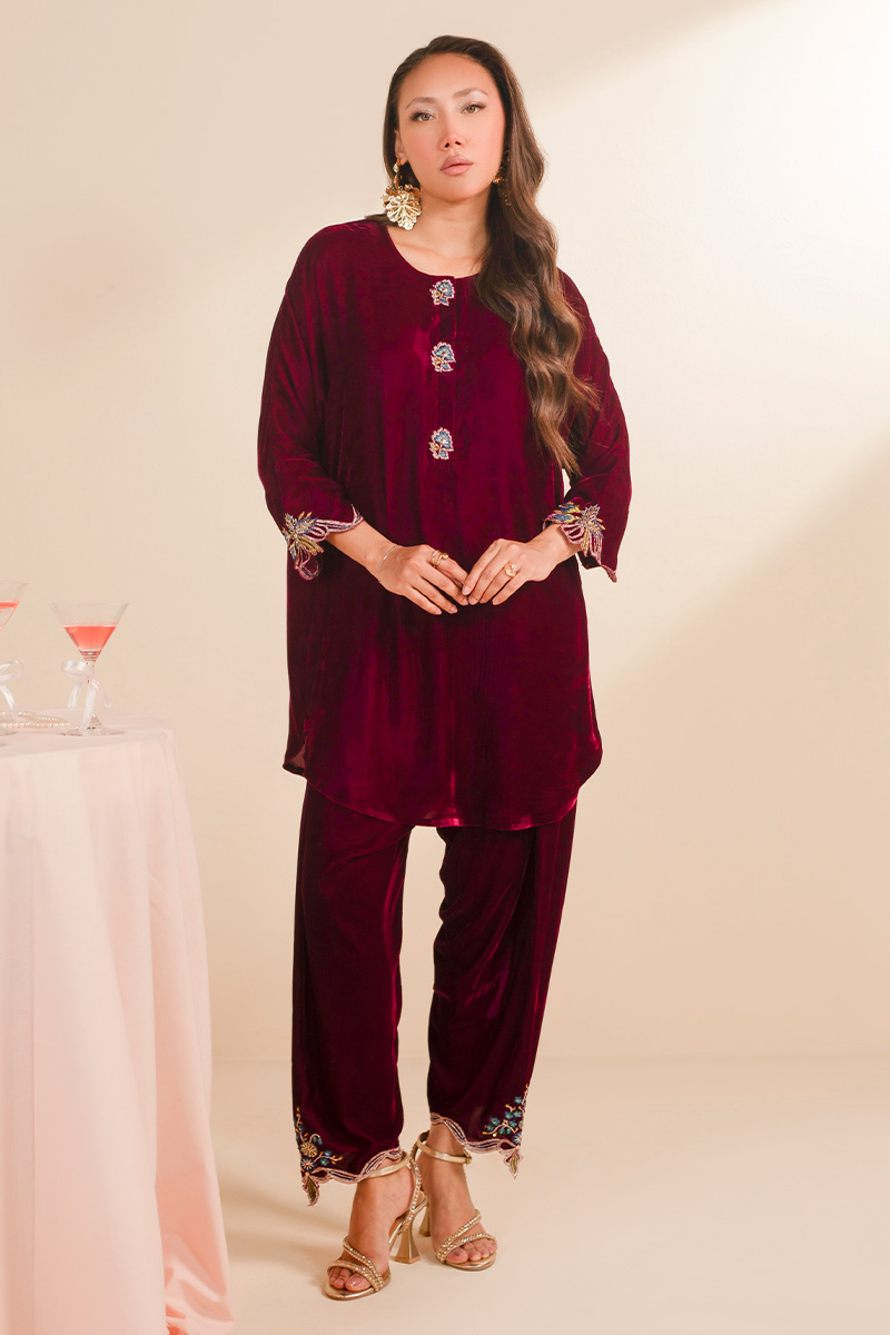 Welcome winters with this deep maroon, chic and relaxed fit. It features a simple round neckline adorned with three distinctive, ornate jeweled buttons down the front creating a focal point. The intricate embroidery is stretegically placed as colorful modern floral motifs on the cuffs of the sleeves and bottom edges of pants, using bright and vibrant threadwork in shades of blue, gold, and green in contrast with the deep maroon. This creates a very sophisticated and contemporary look.