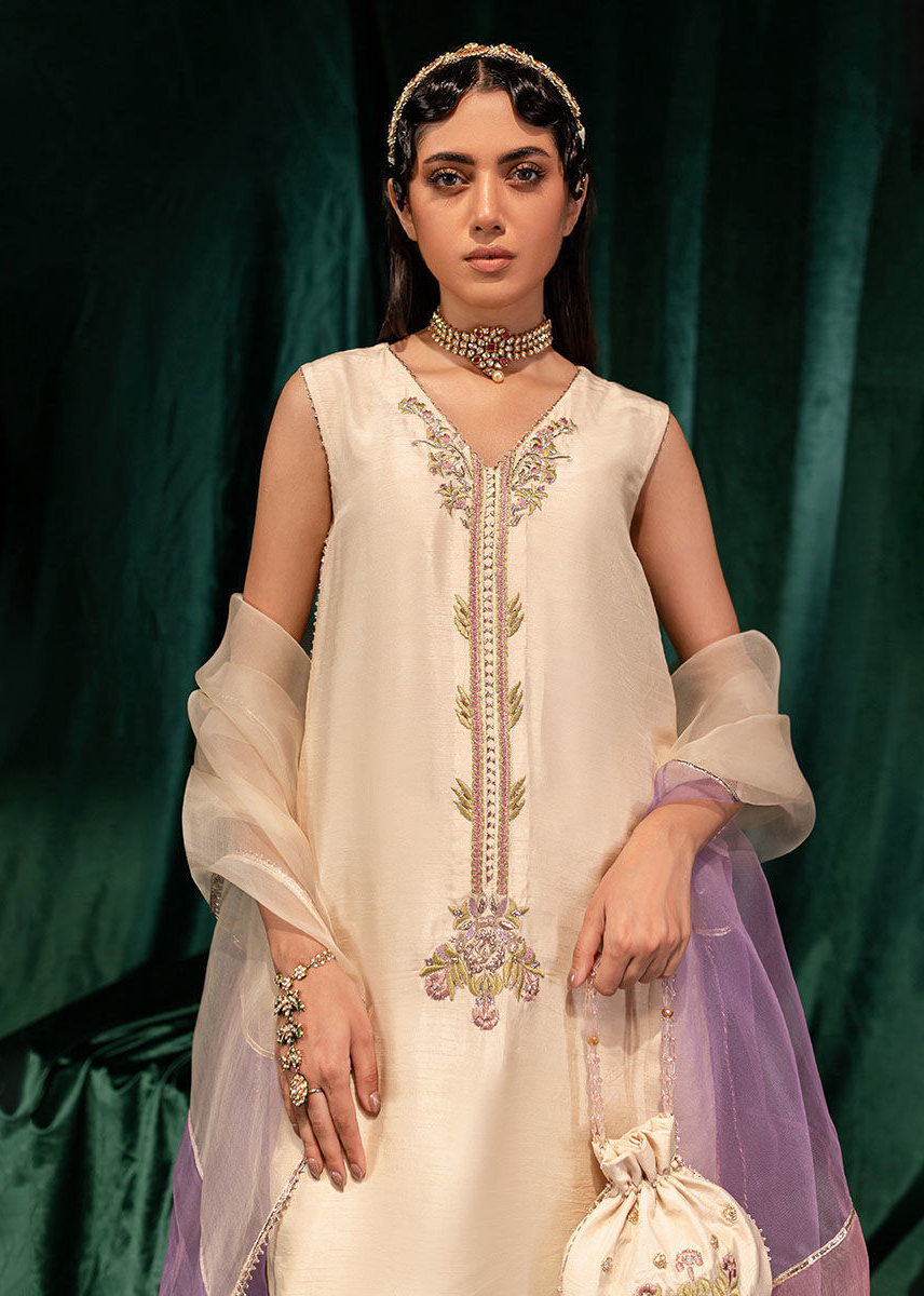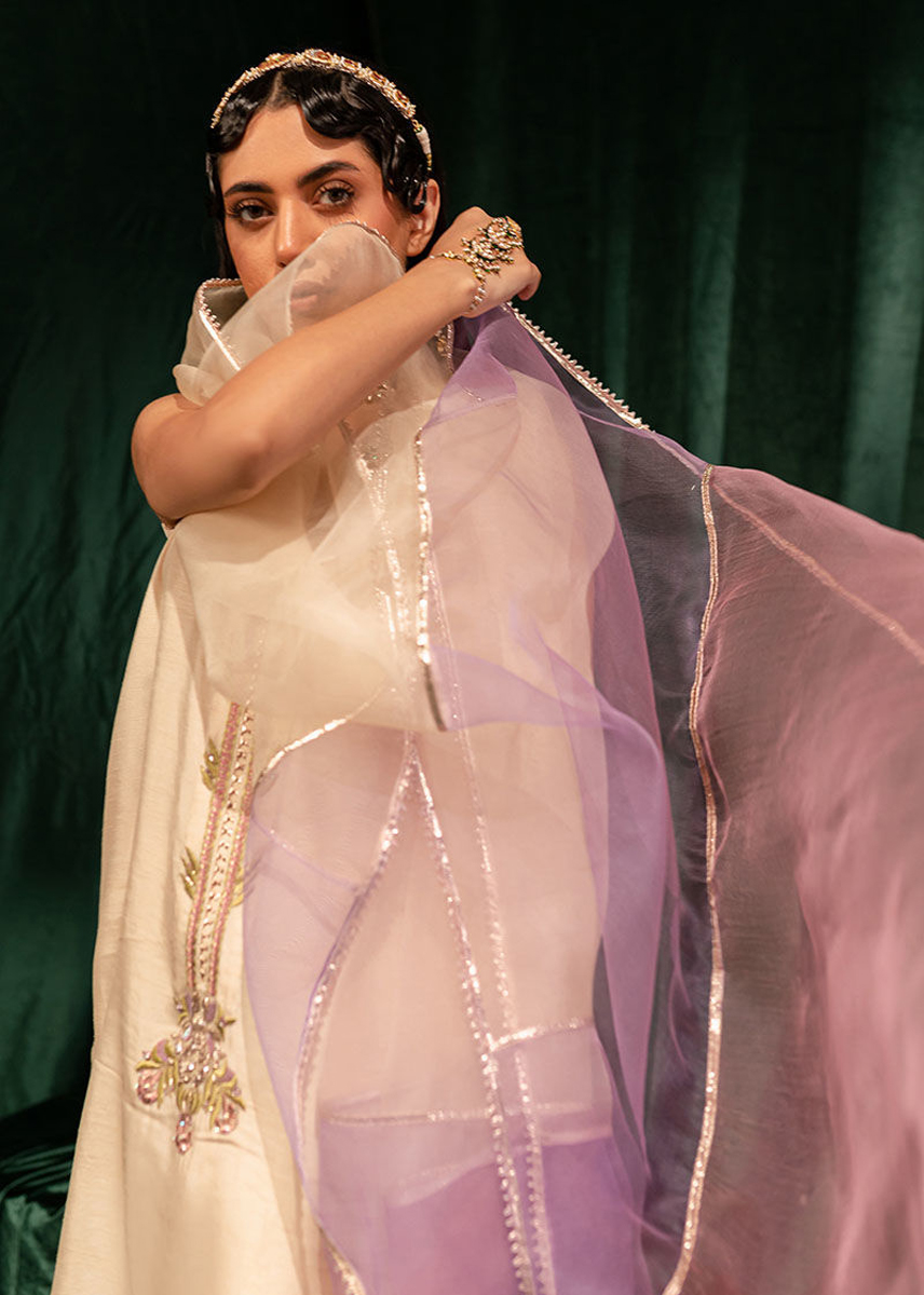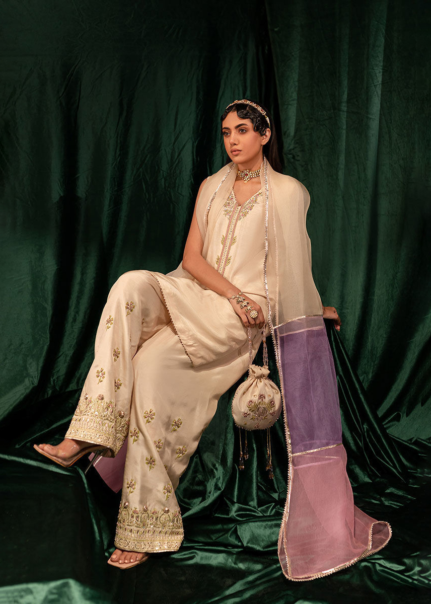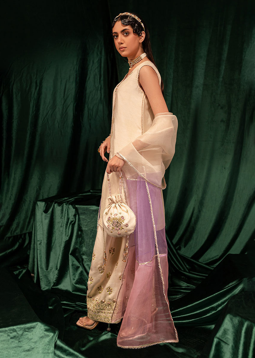 Biege mid length shirt with exquisite resham, gota, dabka, sequin and cut dana detailing in beautiful floral patterns paired with a three tone organza dupatta with gota detailing makes this exquisite piece a great pick for any festivities. The hand block printed shalwar is further enhanced with, gota, sequin, naqshi, dabka and crystals can be added separately.