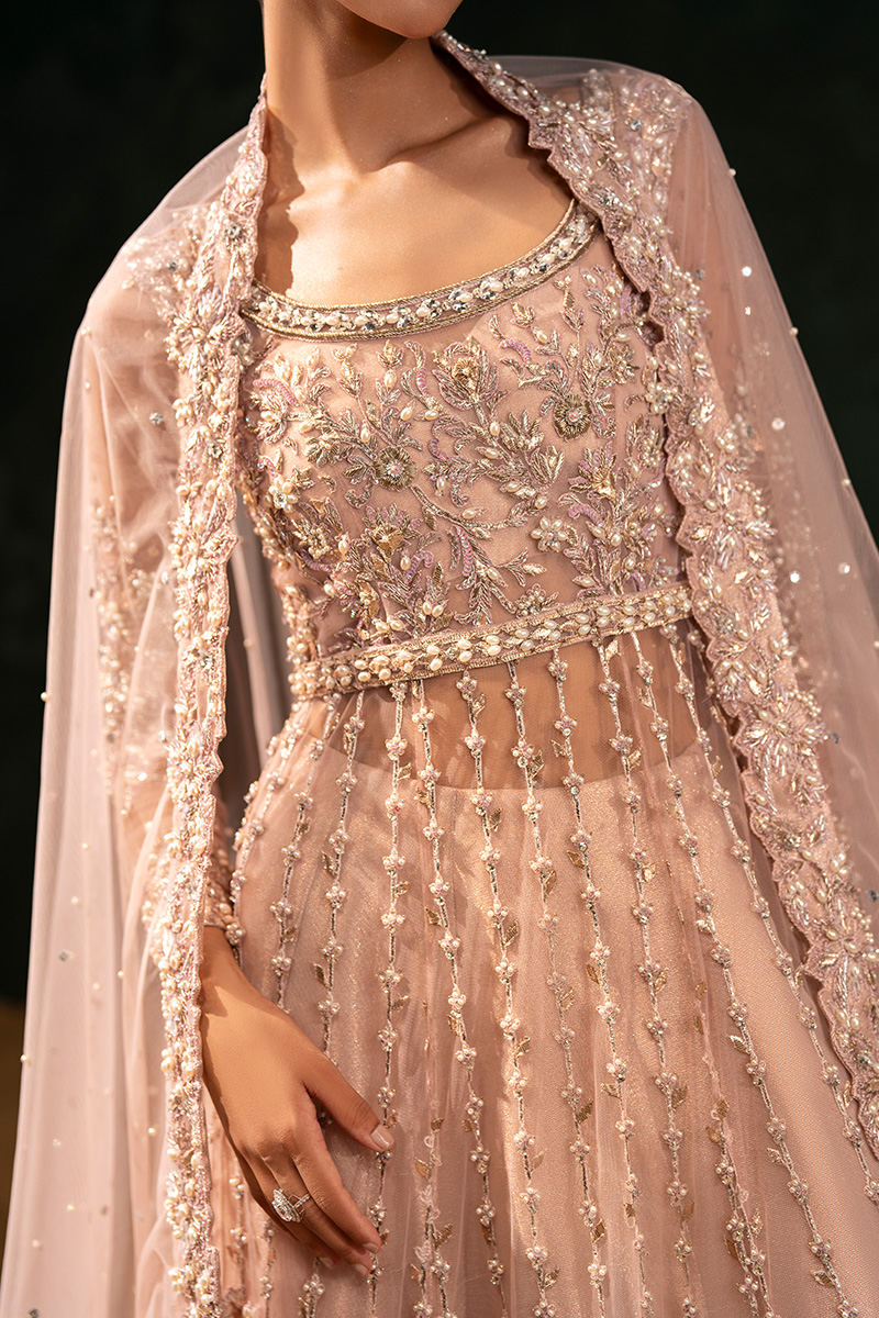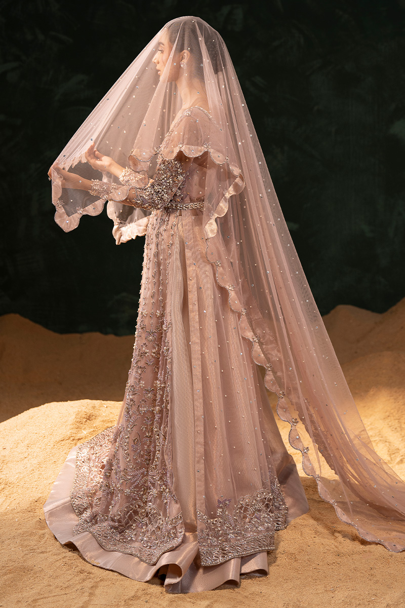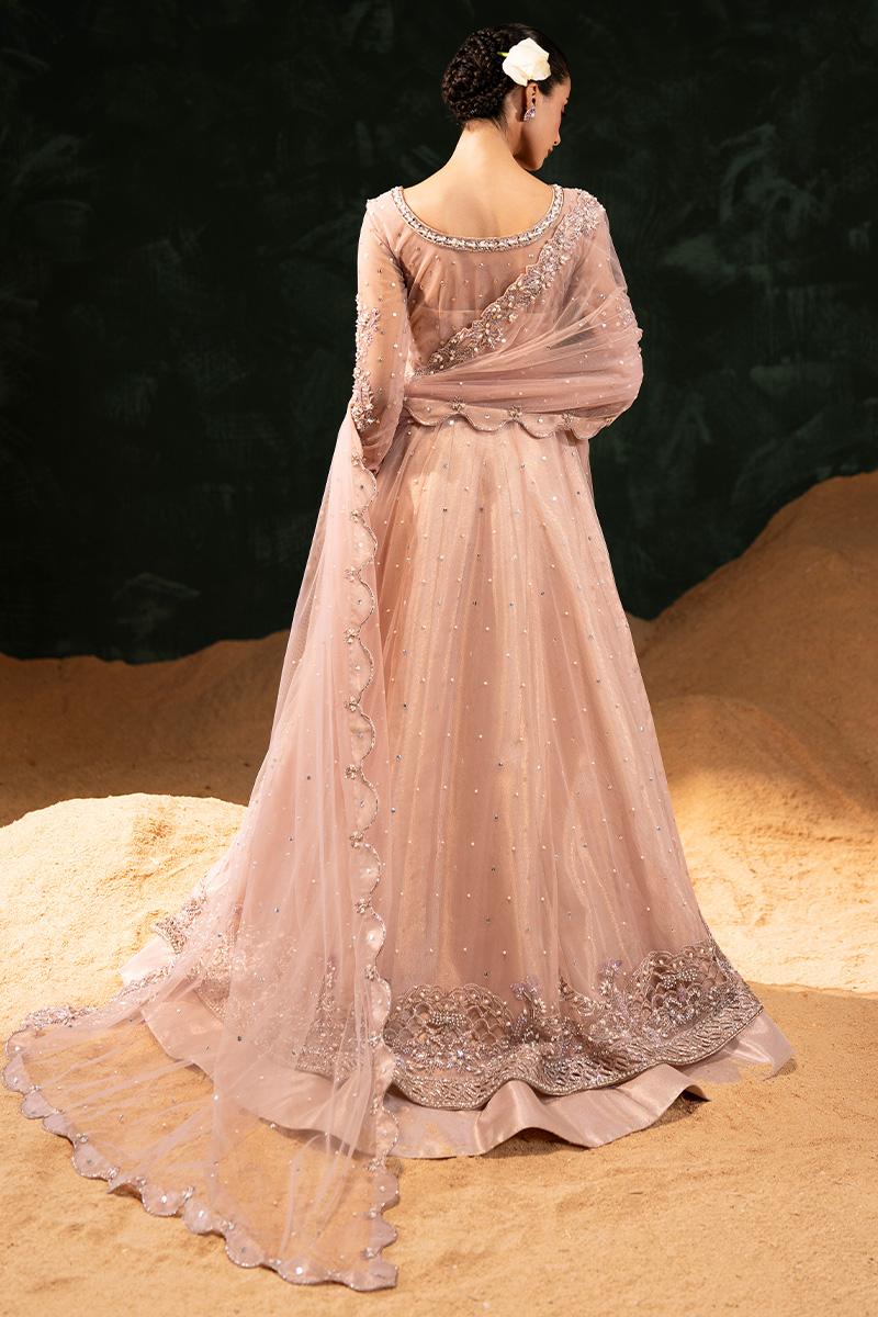 A dreamy peachy pink open-slit gown on net, fully Embellished with fine nakshi, dabka, kora, and refined tilla work, beautifully merged with pearls, crystals, gota, and delicate resham embroidery. Intricate cutwork graces the panel borders, while the blouse and sleeves are finely adorned with embellishments extending to the hem. A waist belt adds definition and elegance to the silhouette, paired with a tissue bustier and a soft tissue lehenga.The net dupatta features scattered pearl and sitara work, with embellishments continuing gracefully across the gown’s back. Finished with kora detailing on scalloped edges and a heavy border on one side, this ensemble is a radiant blend of traditional artistry and modern refinement.