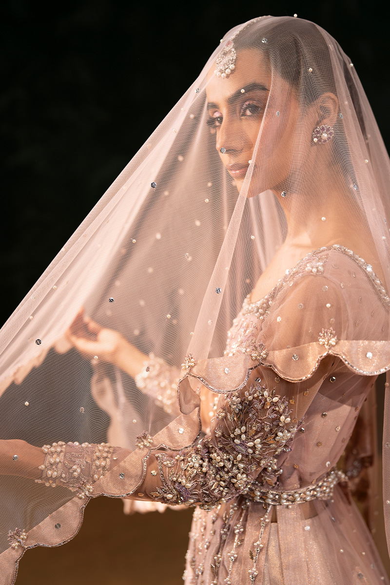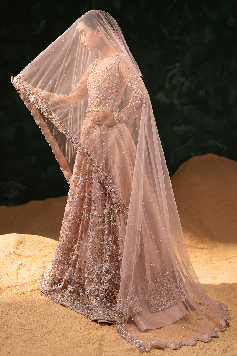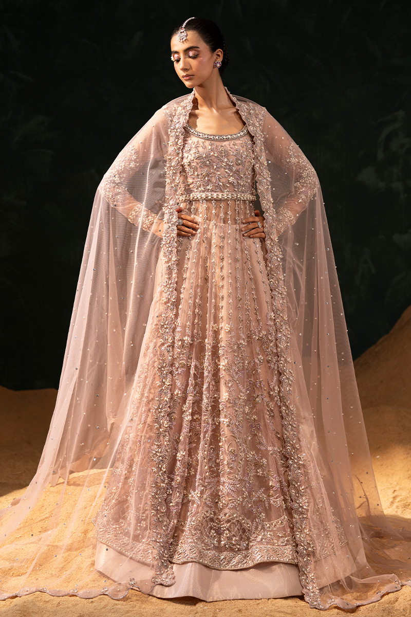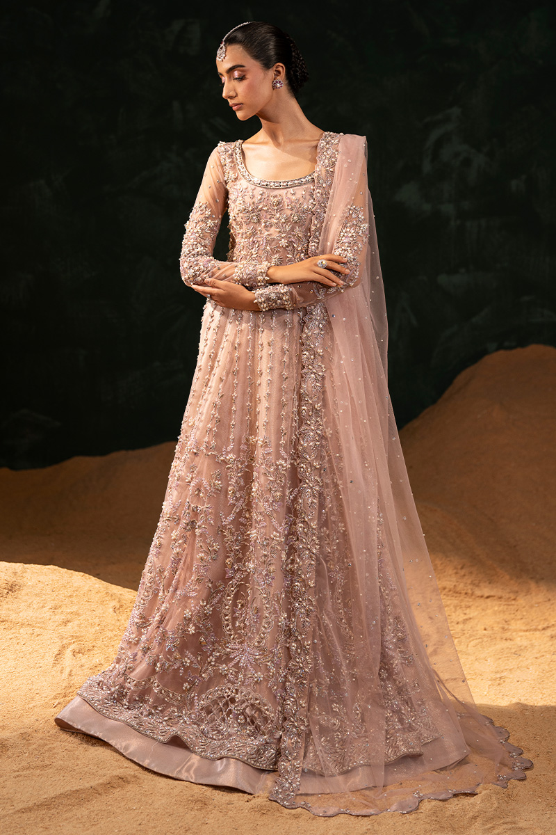 A dreamy peachy pink open-slit gown on net, fully Embellished with fine nakshi, dabka, kora, and refined tilla work, beautifully merged with pearls, crystals, gota, and delicate resham embroidery. Intricate cutwork graces the panel borders, while the blouse and sleeves are finely adorned with embellishments extending to the hem. A waist belt adds definition and elegance to the silhouette, paired with a tissue bustier and a soft tissue lehenga.The net dupatta features scattered pearl and sitara work, with embellishments continuing gracefully across the gown’s back. Finished with kora detailing on scalloped edges and a heavy border on one side, this ensemble is a radiant blend of traditional artistry and modern refinement.