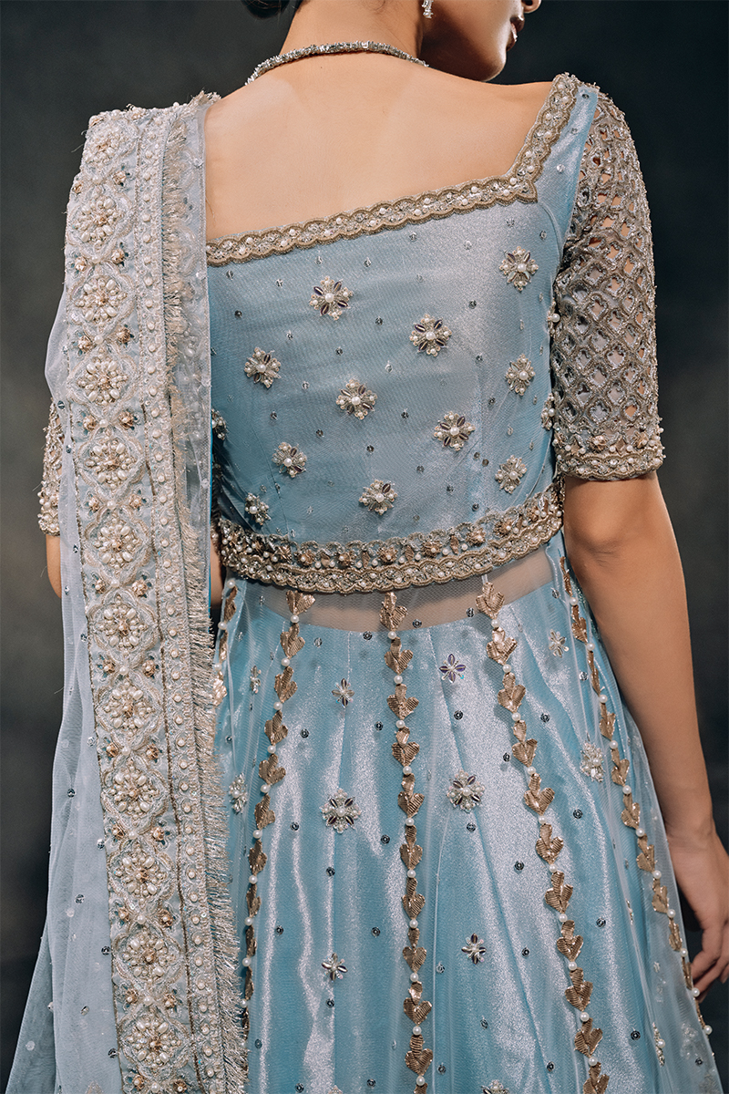 Make a fairy-tale entrance in this enchanting, hand-embellished tulle side slit Cinderella blue kalidar, featuring a stunning bodice with intricate zari and sequin work along with delicate pearls, crystal, resham, cut dana, and gotta details and statement cutwork sleeves that exude elegance and sophistication. The kalidar boasts an exquisite movement, perfect for making a dramatic statement.