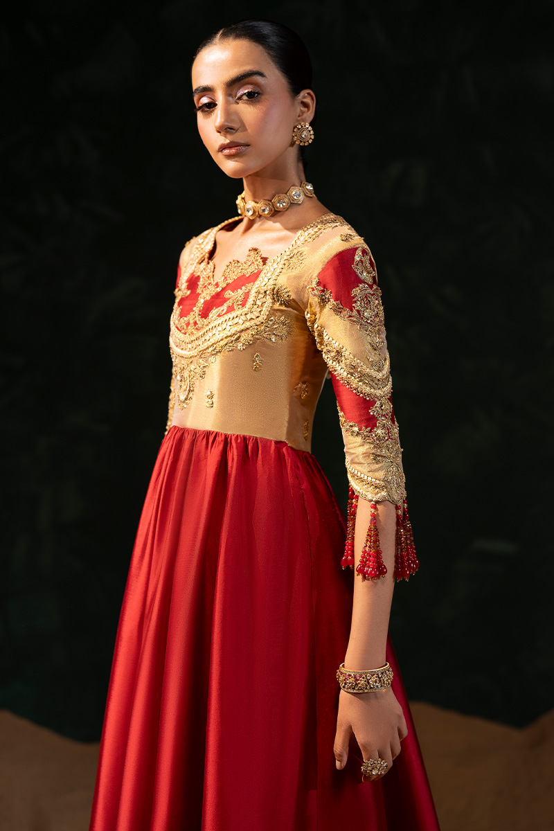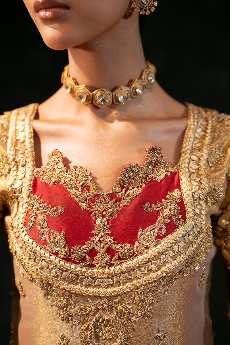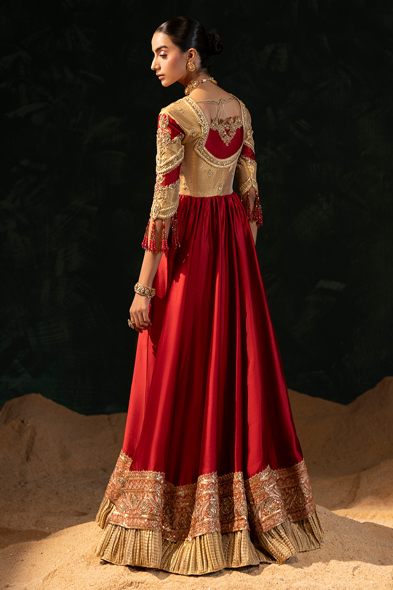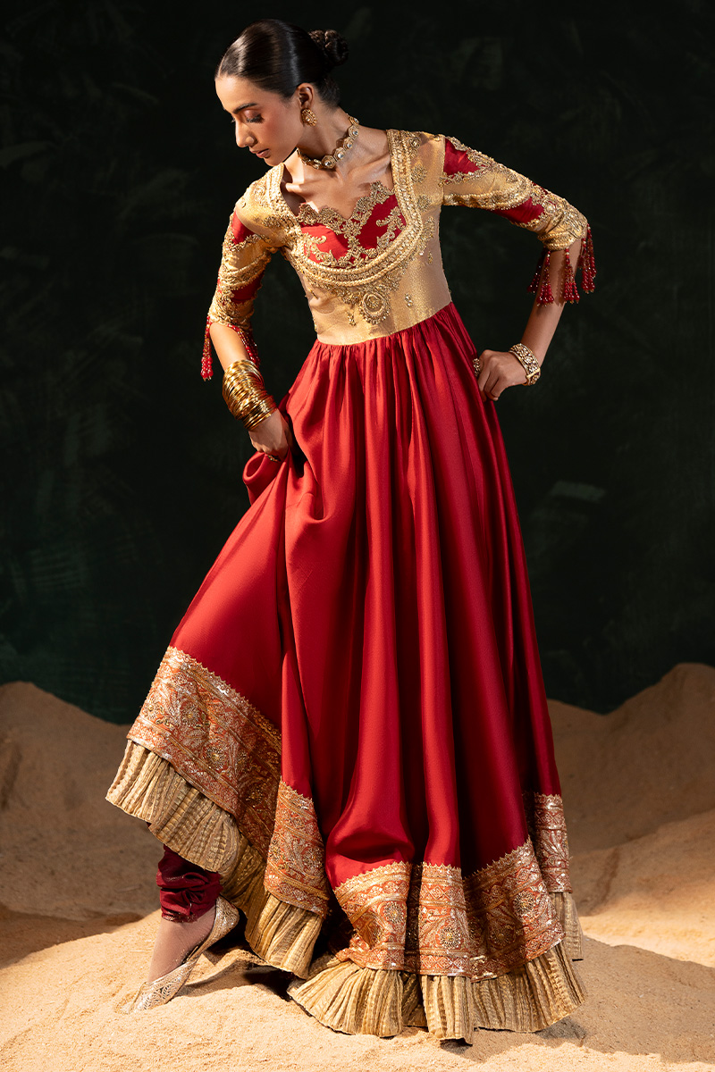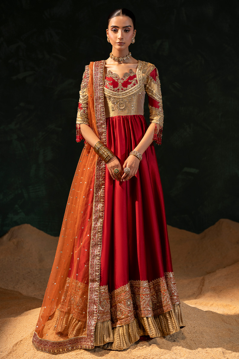 An opulent red sheesha silk flared frock paired with a golden tissue blouse, lavishly adorned on the neckline and sleeves with intricate nakshi, dabka, sitara, gota patti, and fine tila work. Delicate embellishments flow across the frock, blouse, and sleeves, with handcrafted tassels accenting the sleeve hems for a graceful touch. The frock hem features fine tila borders and is finished with luxurious crushed tissue, adding depth and elegance. Paired with an orange net dupatta showcasing a geometric spray, framed by fine tila and gota borders, and softened with tissue finishing. Completed with a classic churidar pajama, this ensemble blends festive grandeur with timeless sophistication.