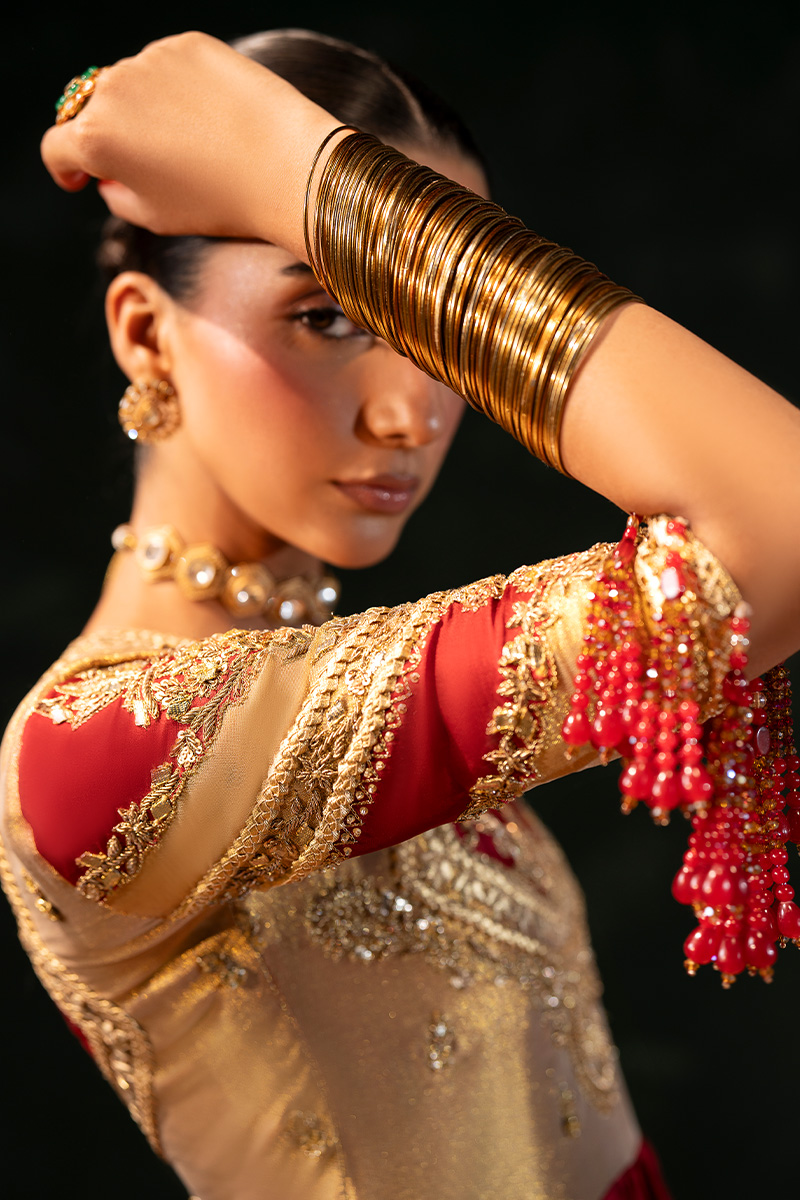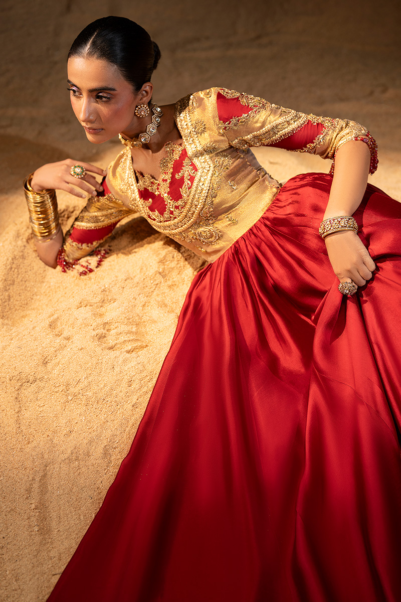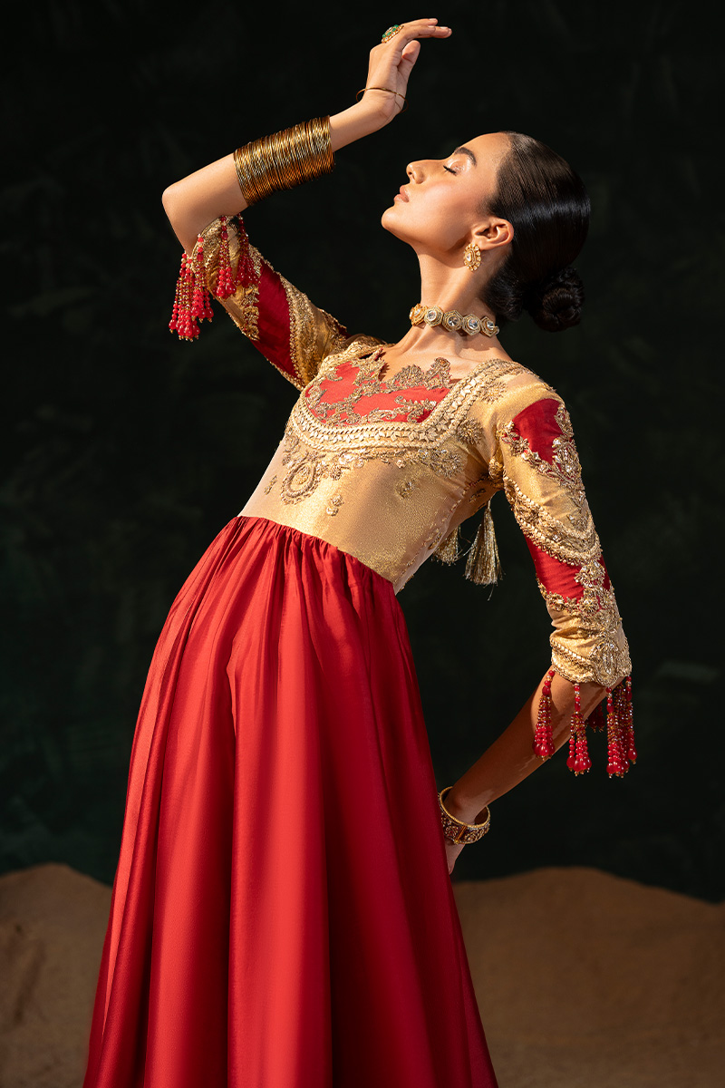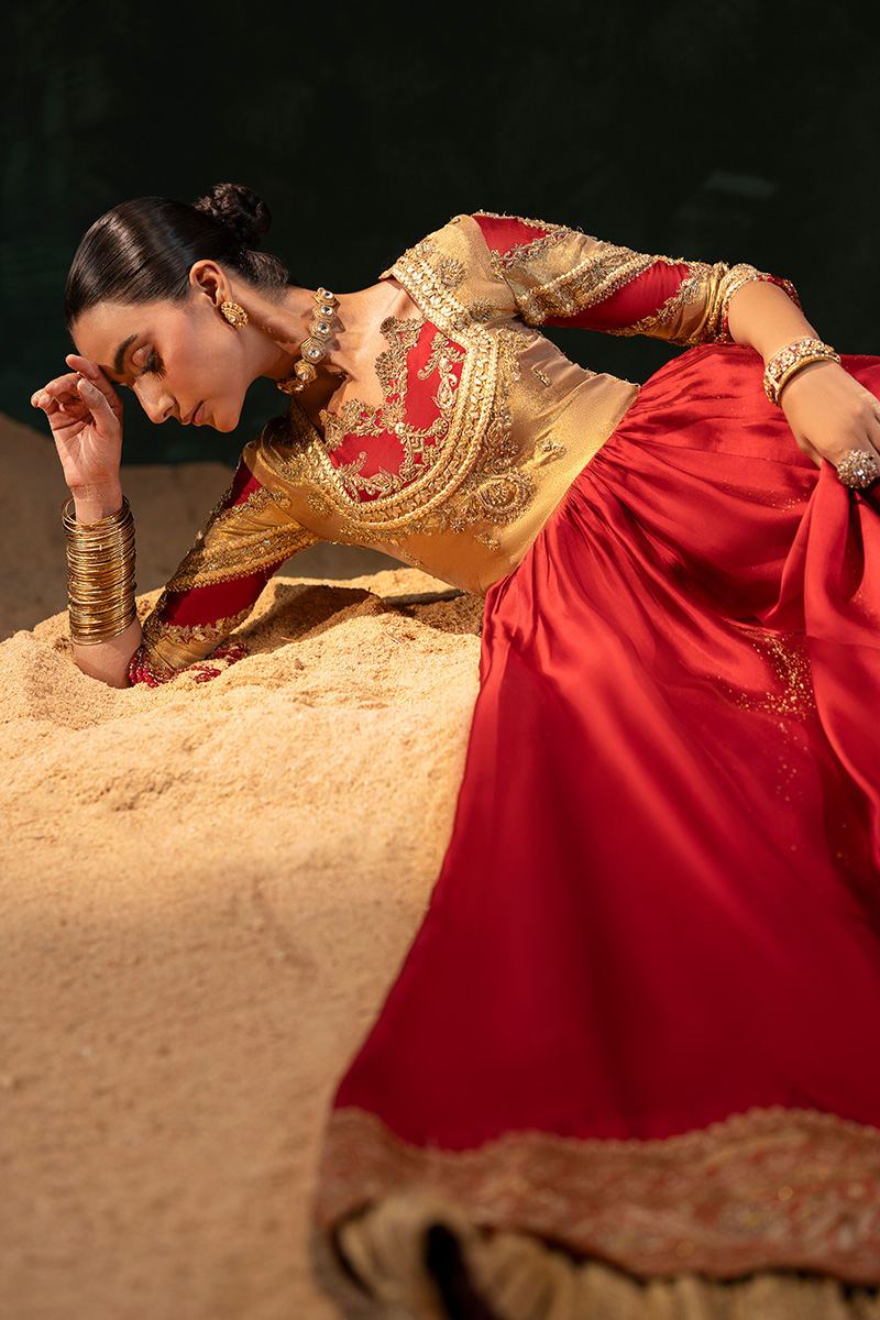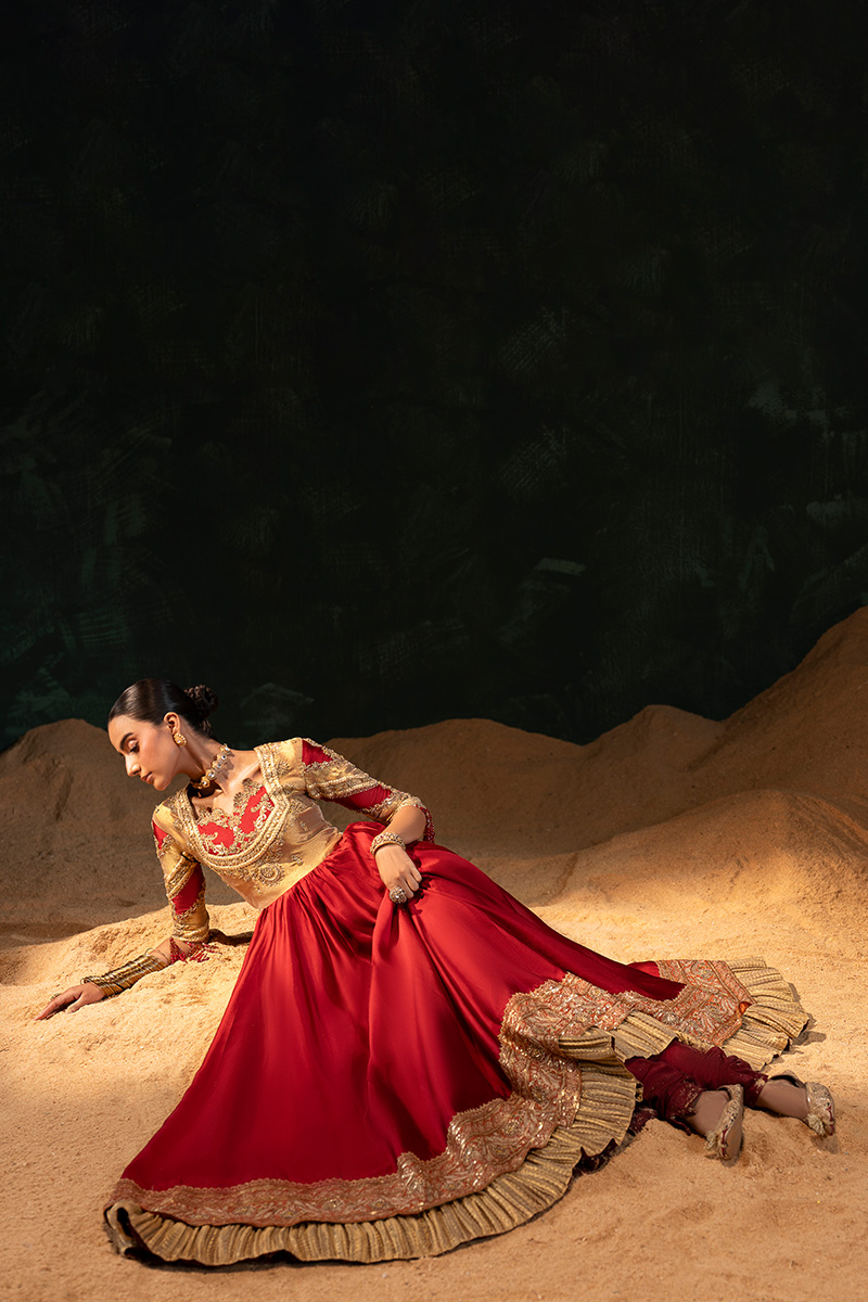 An opulent red sheesha silk flared frock paired with a golden tissue blouse, lavishly adorned on the neckline and sleeves with intricate nakshi, dabka, sitara, gota patti, and fine tila work. Delicate embellishments flow across the frock, blouse, and sleeves, with handcrafted tassels accenting the sleeve hems for a graceful touch. The frock hem features fine tila borders and is finished with luxurious crushed tissue, adding depth and elegance. Paired with an orange net dupatta showcasing a geometric spray, framed by fine tila and gota borders, and softened with tissue finishing. Completed with a classic churidar pajama, this ensemble blends festive grandeur with timeless sophistication.