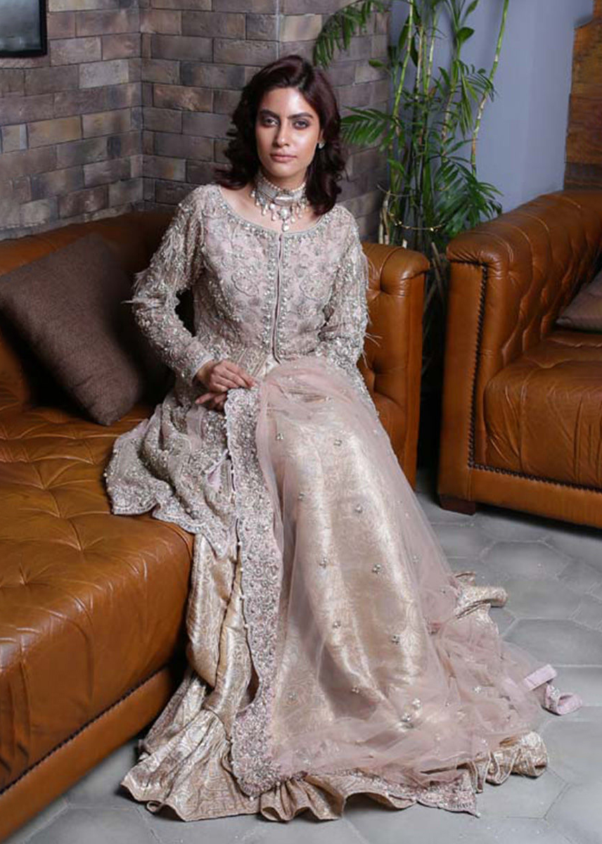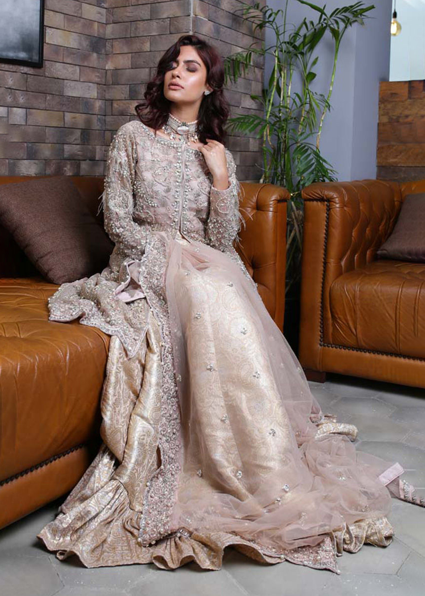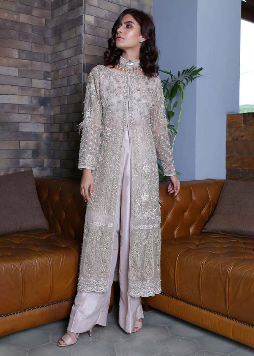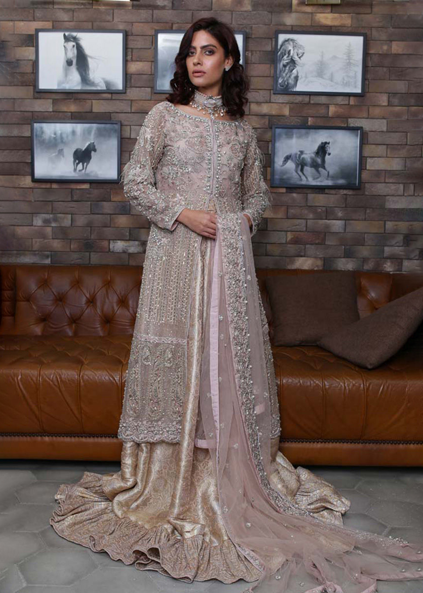 Fully embellished organza front open shirt with jamawar trouser or farshilehnga. Embellished tulle dupatta.