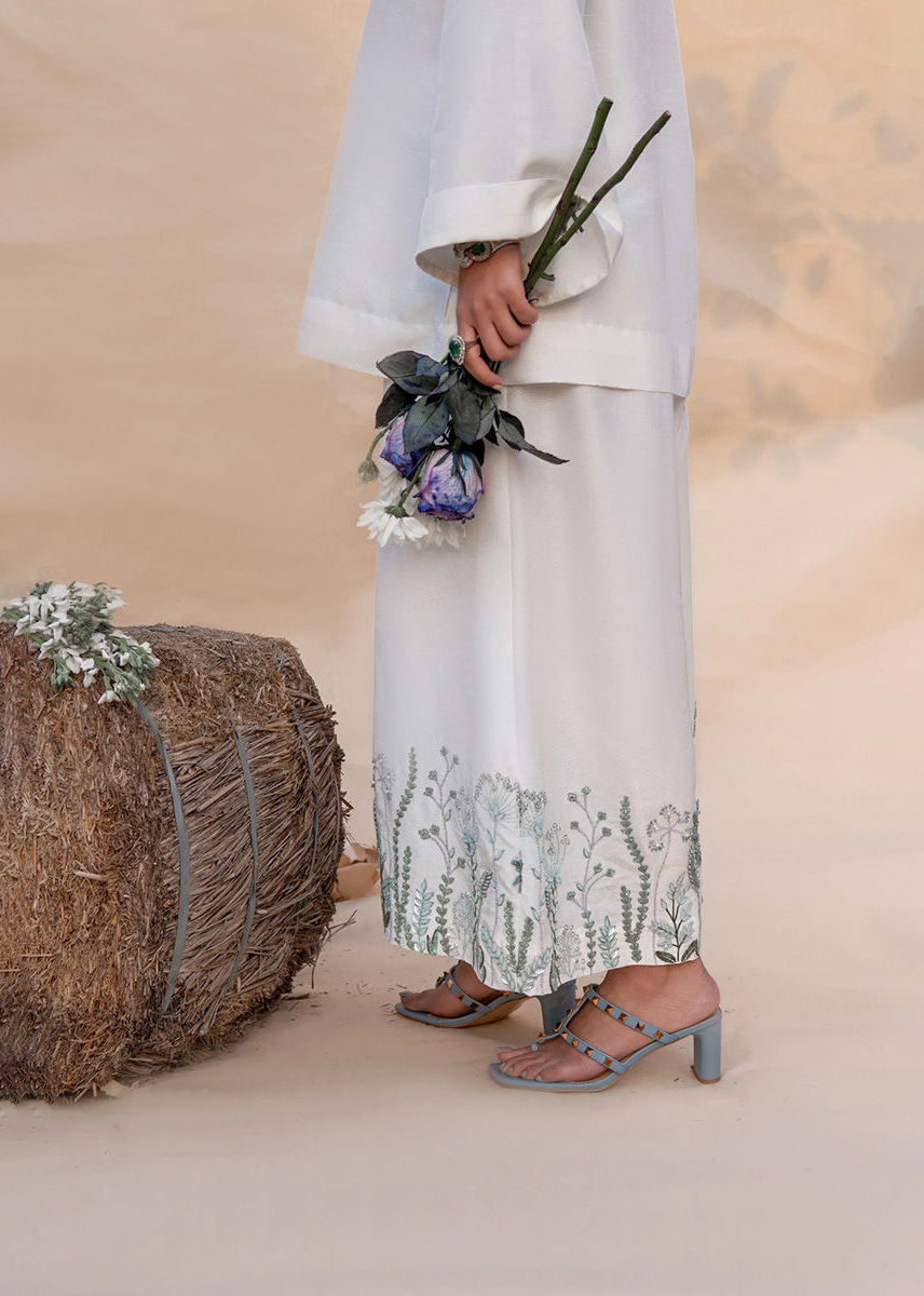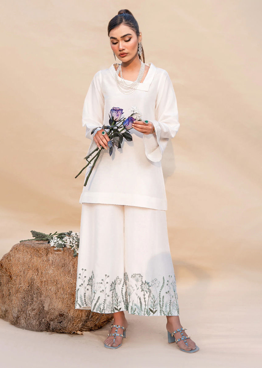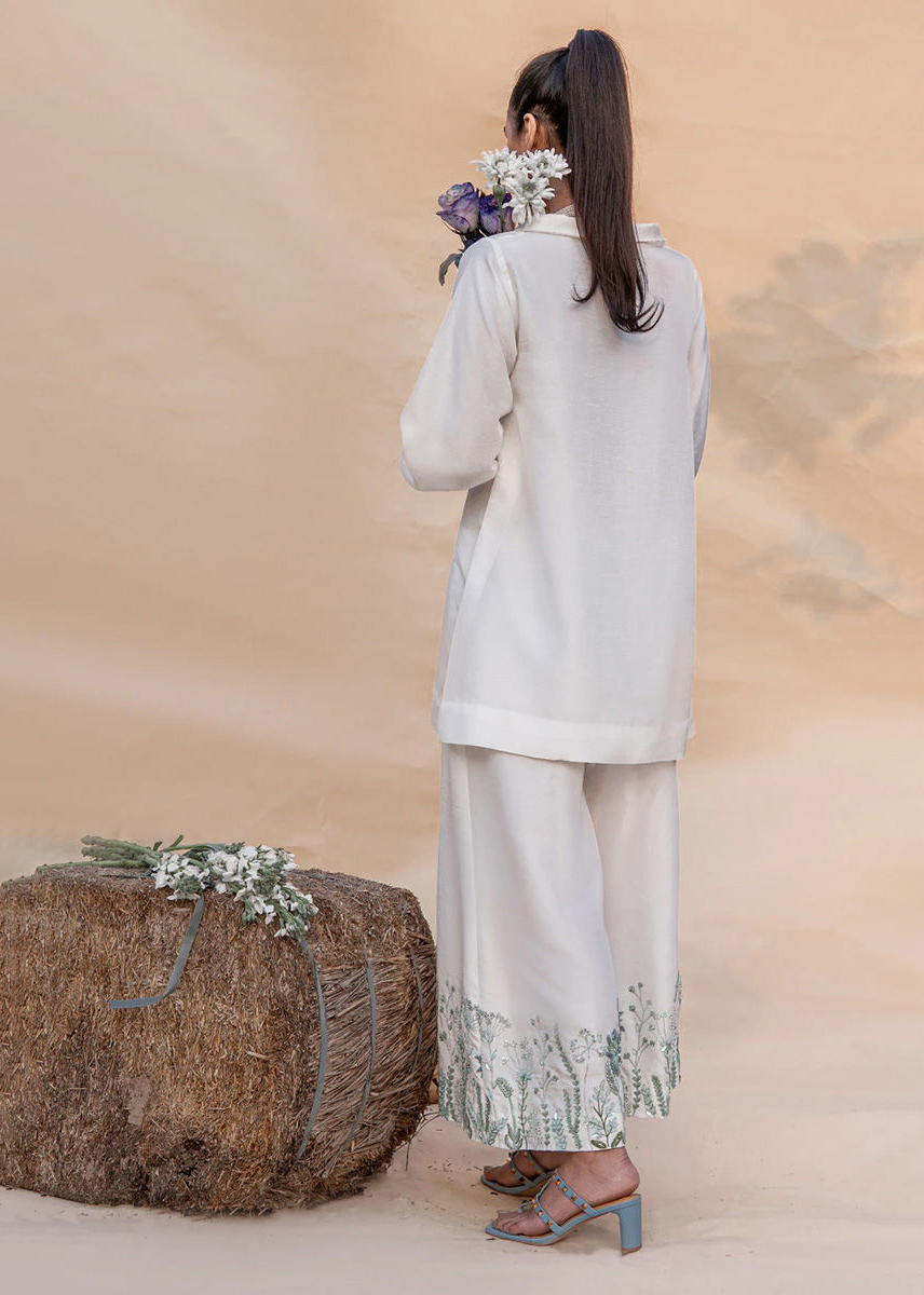 Pristine white summer must have outfit with an asymmetric collar and flowy silhouette shirt paired with a 3D hand embellished cullote.
