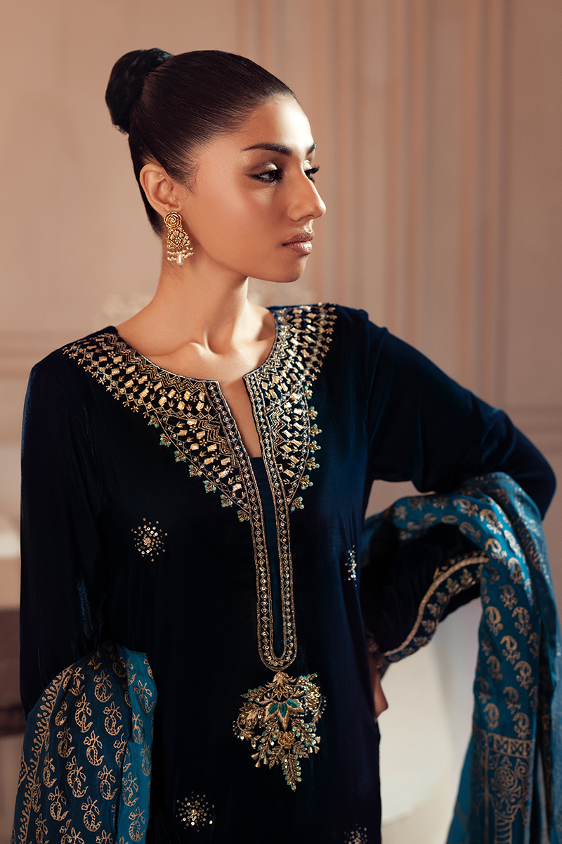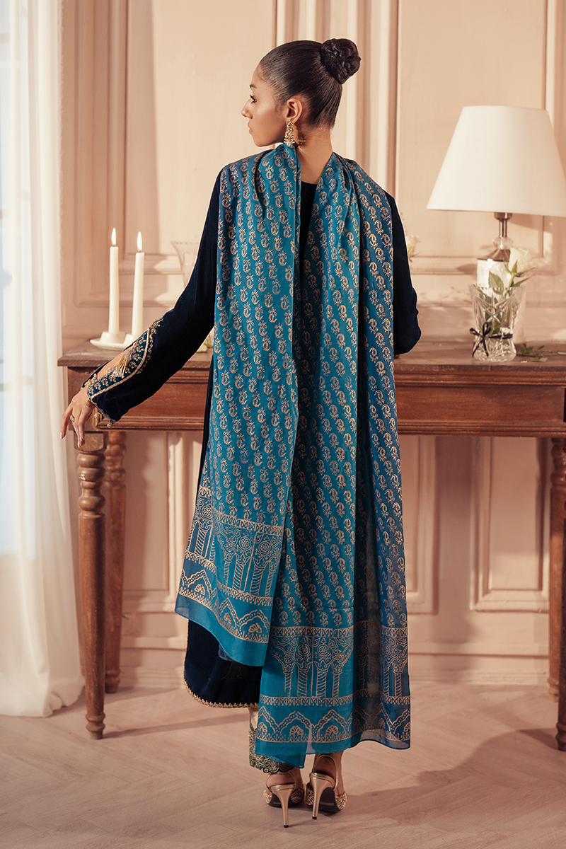Fabric: Shirt: Velvet, Trousers: Tissue, Dupatta: Silk Block-Printed