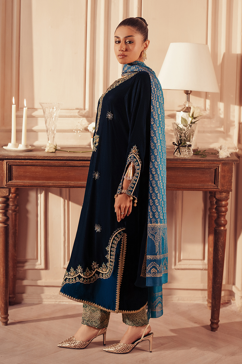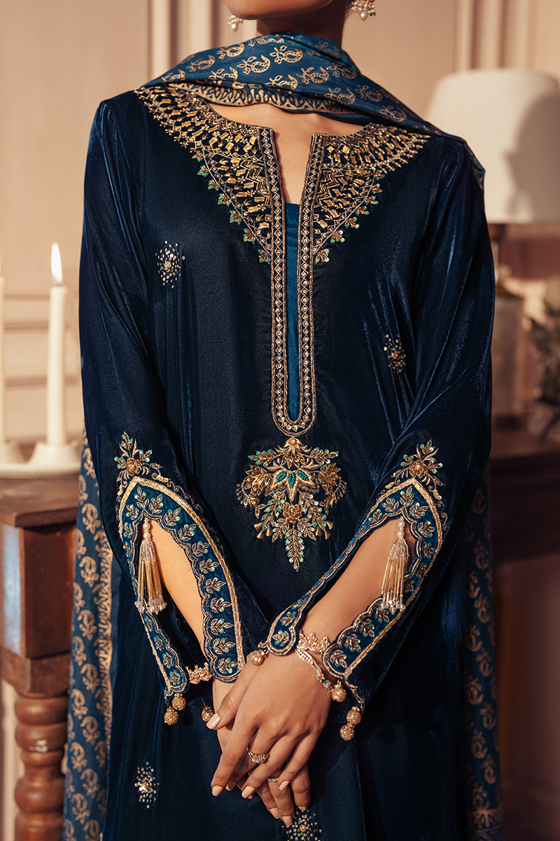 A stunning deep blue and sea blue double-shaded shirt, featuring a hand embellished neckline, sleeves, and hem, adorned with delicate motif sprays. The intricate architectural arch patterns on the sleeves and hem add a touch of sophistication. Paired with tissue trousers featuring an embellished hem and a silk block printed dupatta, this ensemble is a perfect blend of elegance and charm.