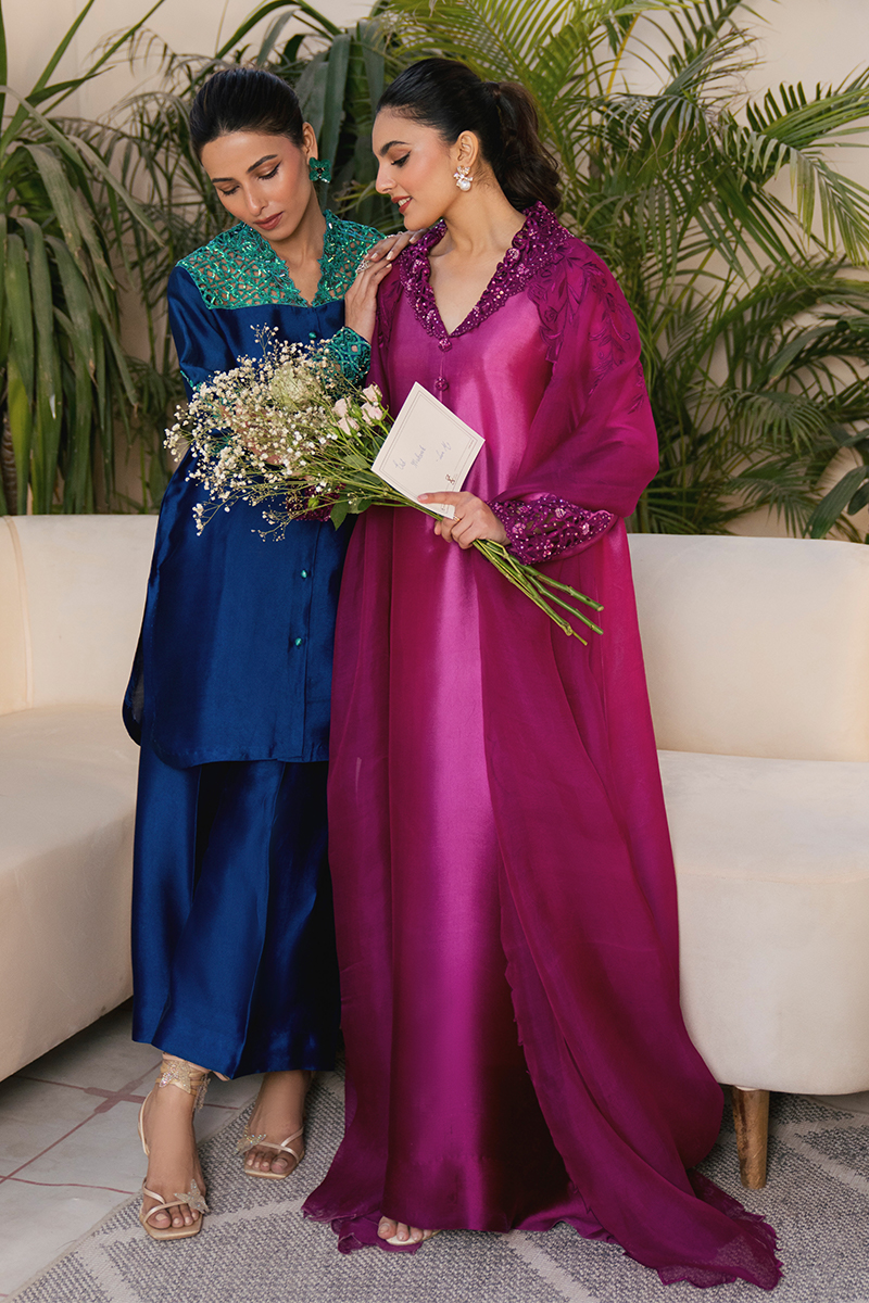 A stunning gradient tissue silk shirt featuring an intricately embroidered collar, matching sleeve details, and elegant fabric buttons. Paired with an organza dupatta adorned with cutwork, hand embellished and delicate floral patterns this outfit radiates sophistication and charm.