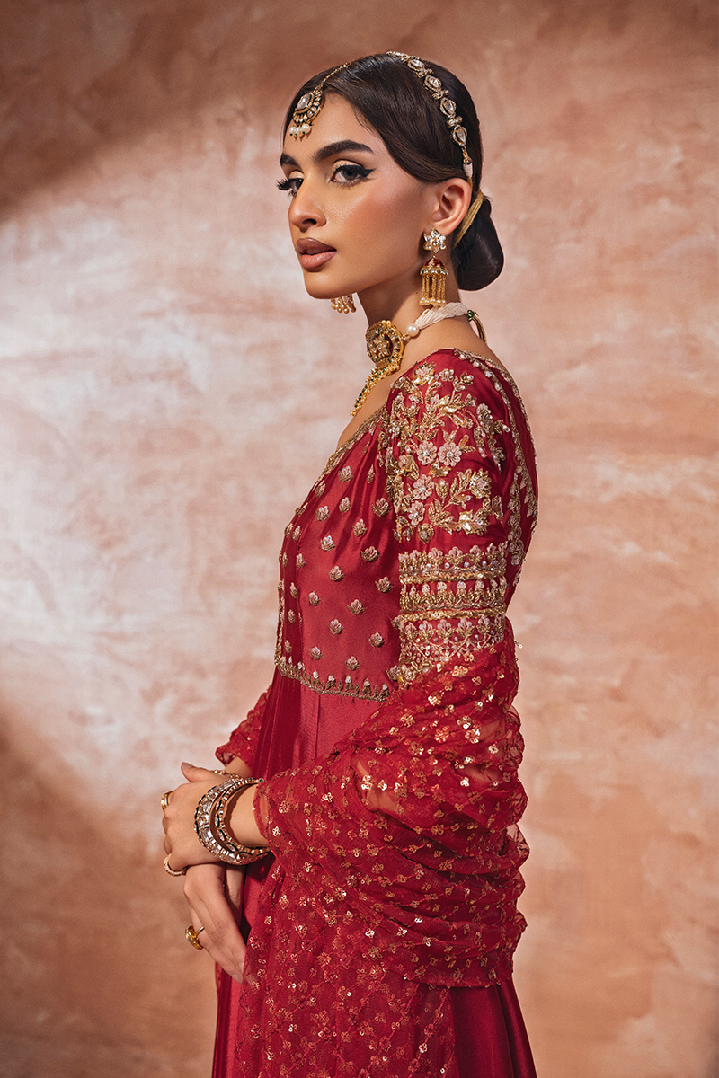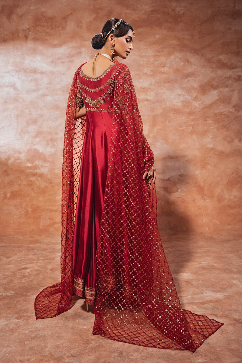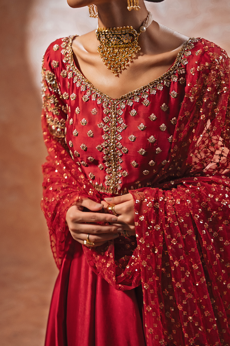Make a majestic statement in this stunning, hand-embellished Tissue Silk red Kalidar set, complete with a show-stopping sequin-laden tulle dupatta and luxurious silk churidar. Perfect for weddings, festivals, or special occasions, this ensemble exudes opulence and sophistication.