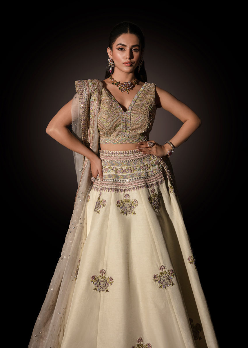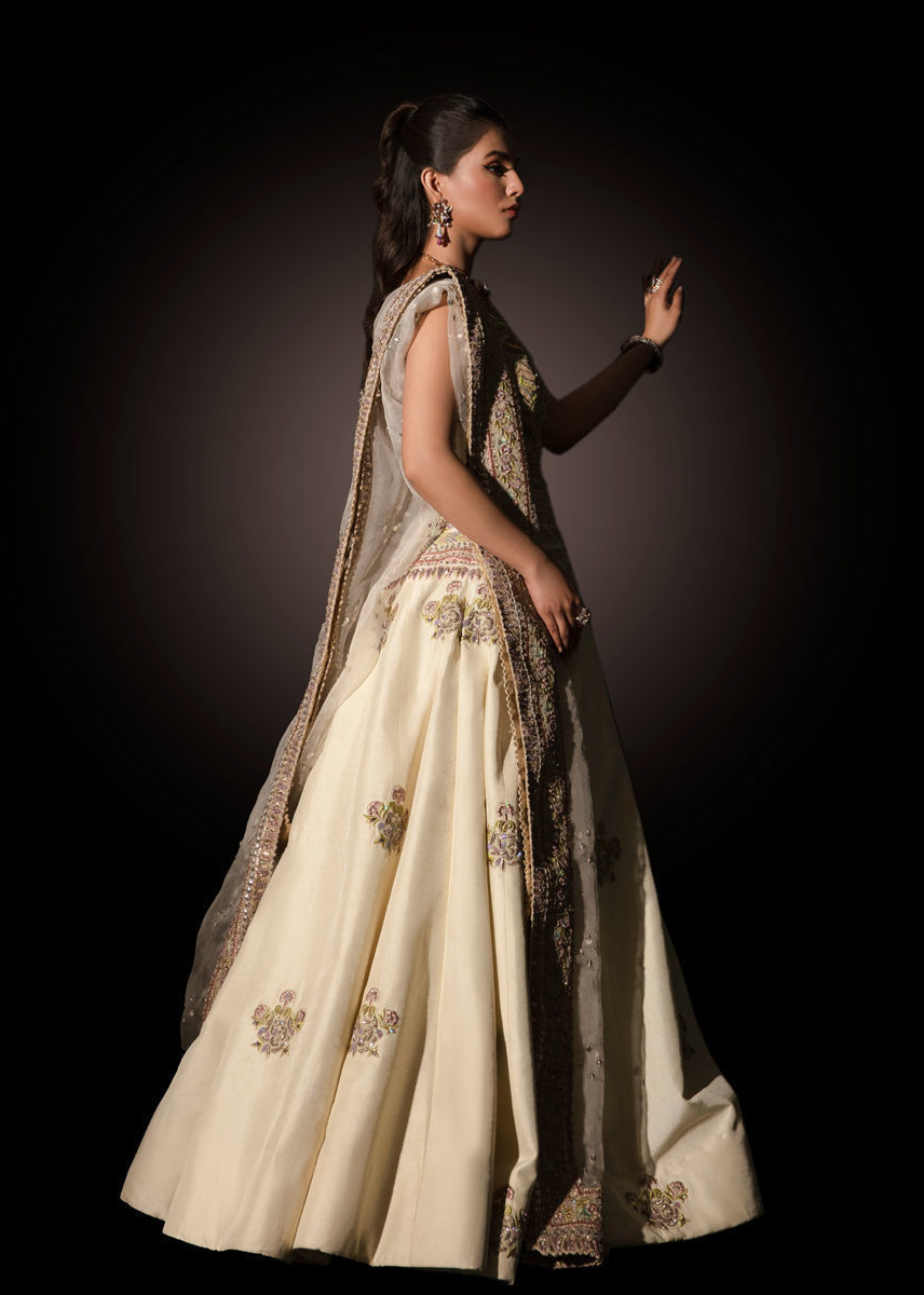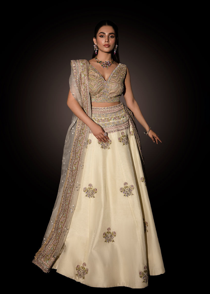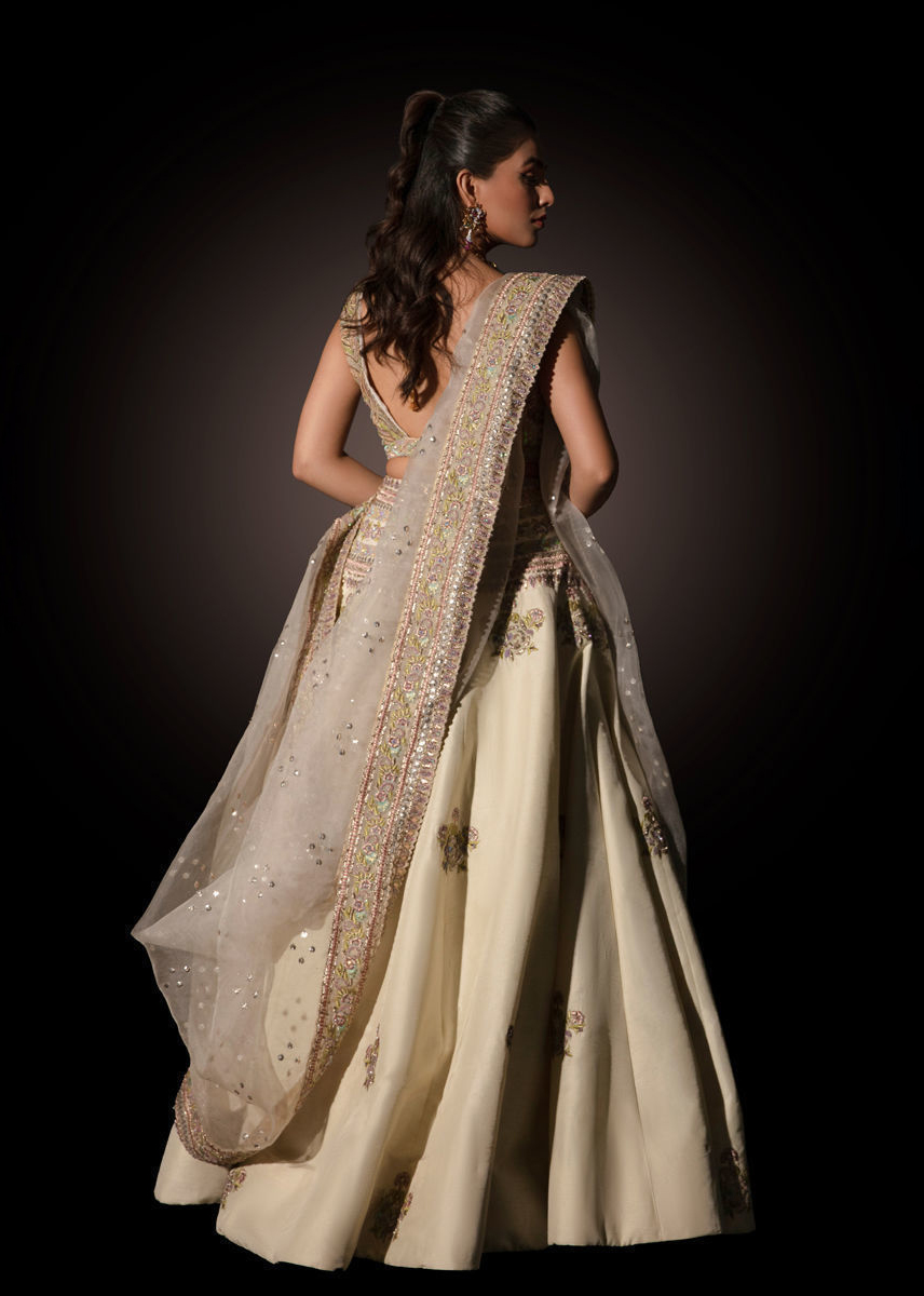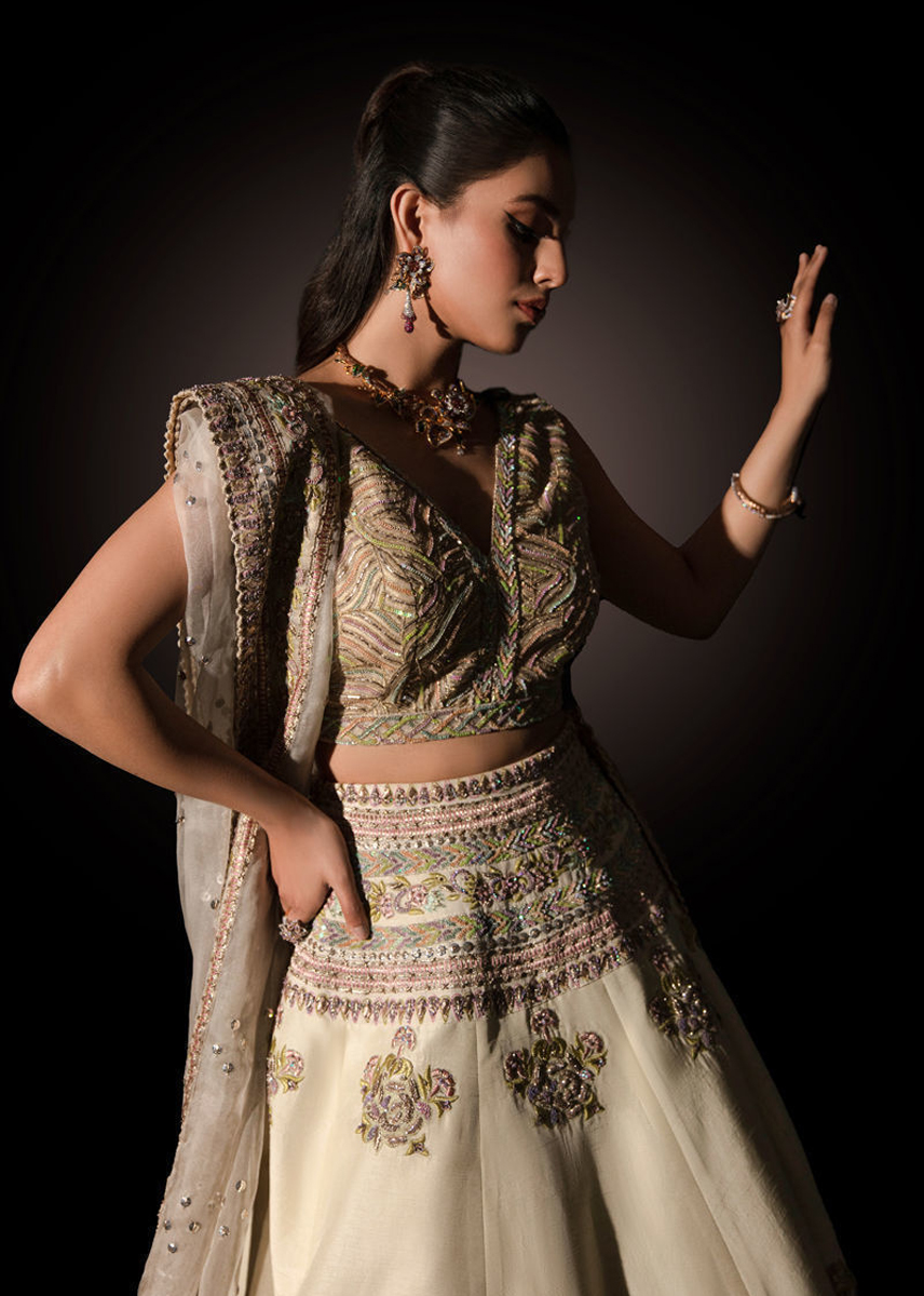 The Ivory lehria blouse and lehnga set with exquisite, dabka, naqshi, cutdana, gota and resham work paired with heavily embellished dupatta gives the ultimate contemporary festive look. The lehnga has heavily embellished waist with floral motif all over underneath. The pure organza dupatta has a heavy sitara spray all over and a dabka, gota, resham and naqshi laden border on four sides.