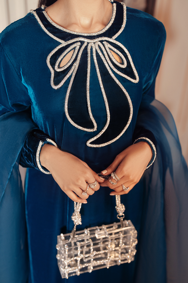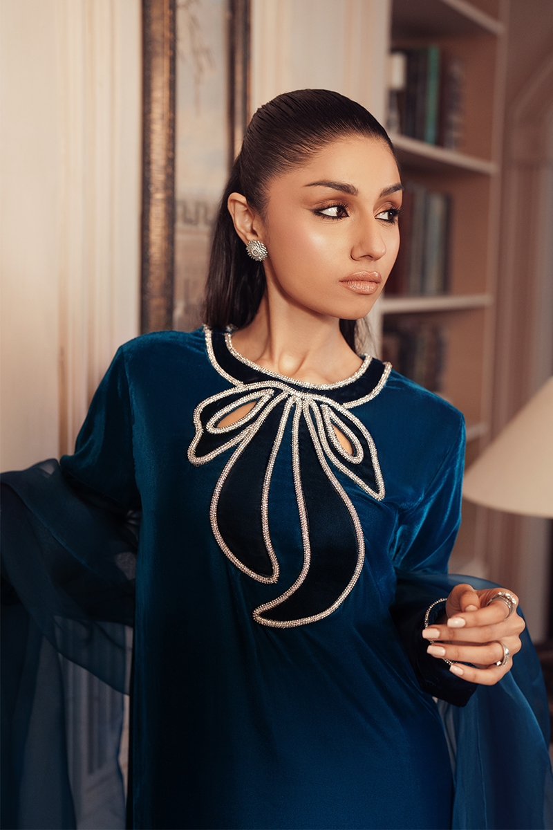 A blue multi shade appliqued velvet kaftan shirt featuring a diamante corded bow-tie neckline and deep blue appliquéd sleeves. It comes with an organza two tone complementing dupatta and silk trousers, creating an ensemble that is both elegant and captivating.