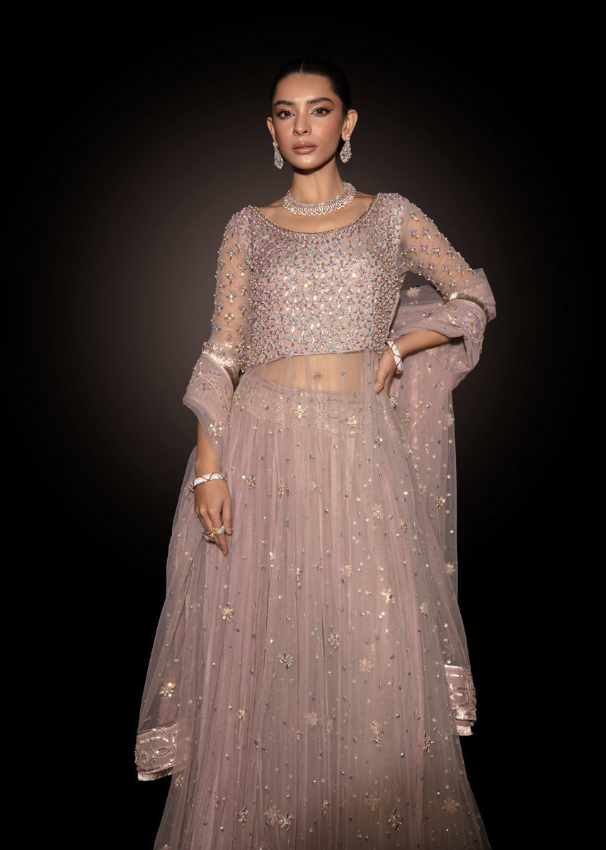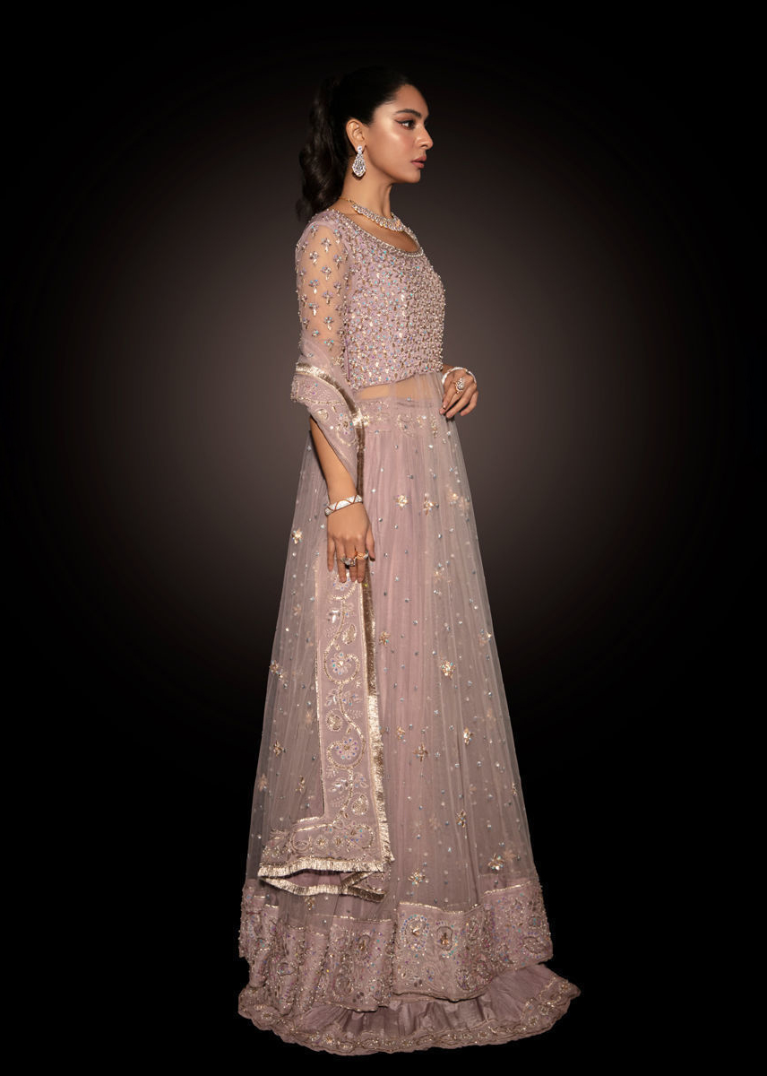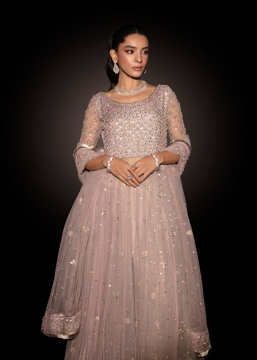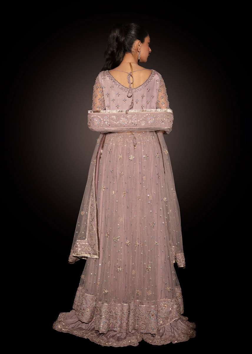 The lilac peshwas with heavy dabka, pearl, sitara and gota work, with heavy sitara spray on the kalis with gota motifs all over. The intricate jaal is on the bodice balanced off by a beautifully embellished paisley border with dabka, sitara, pearl, crystal and gota work. The peshwas is paired with a crushed pant with embellished hemline and belt. The dupatta also had four sides embellished border and heavy sitara spray.