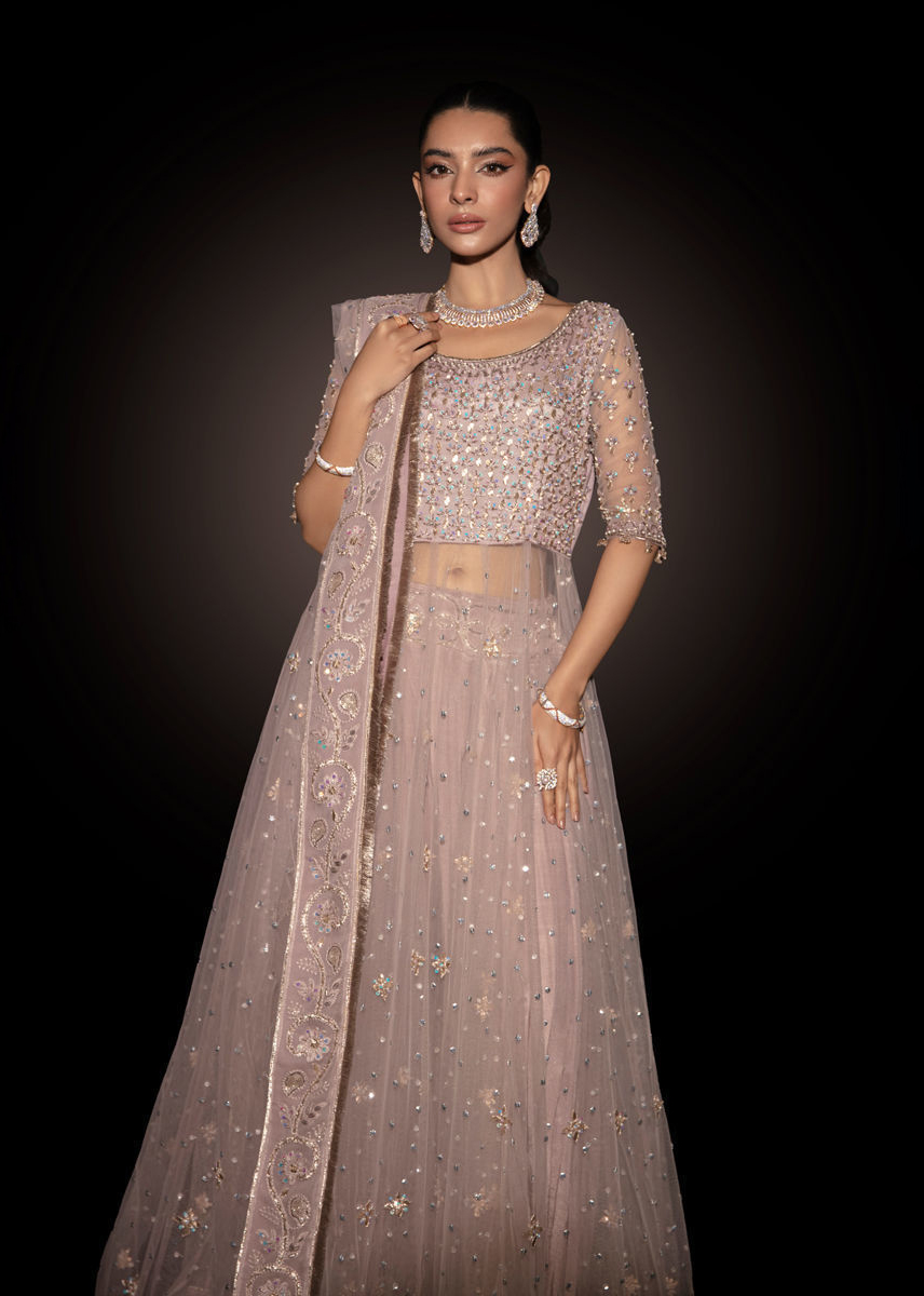 The lilac peshwas with heavy dabka, pearl, sitara and gota work, with heavy sitara spray on the kalis with gota motifs all over. The intricate jaal is on the bodice balanced off by a beautifully embellished paisley border with dabka, sitara, pearl, crystal and gota work. The peshwas is paired with a crushed pant with embellished hemline and belt. The dupatta also had four sides embellished border and heavy sitara spray.