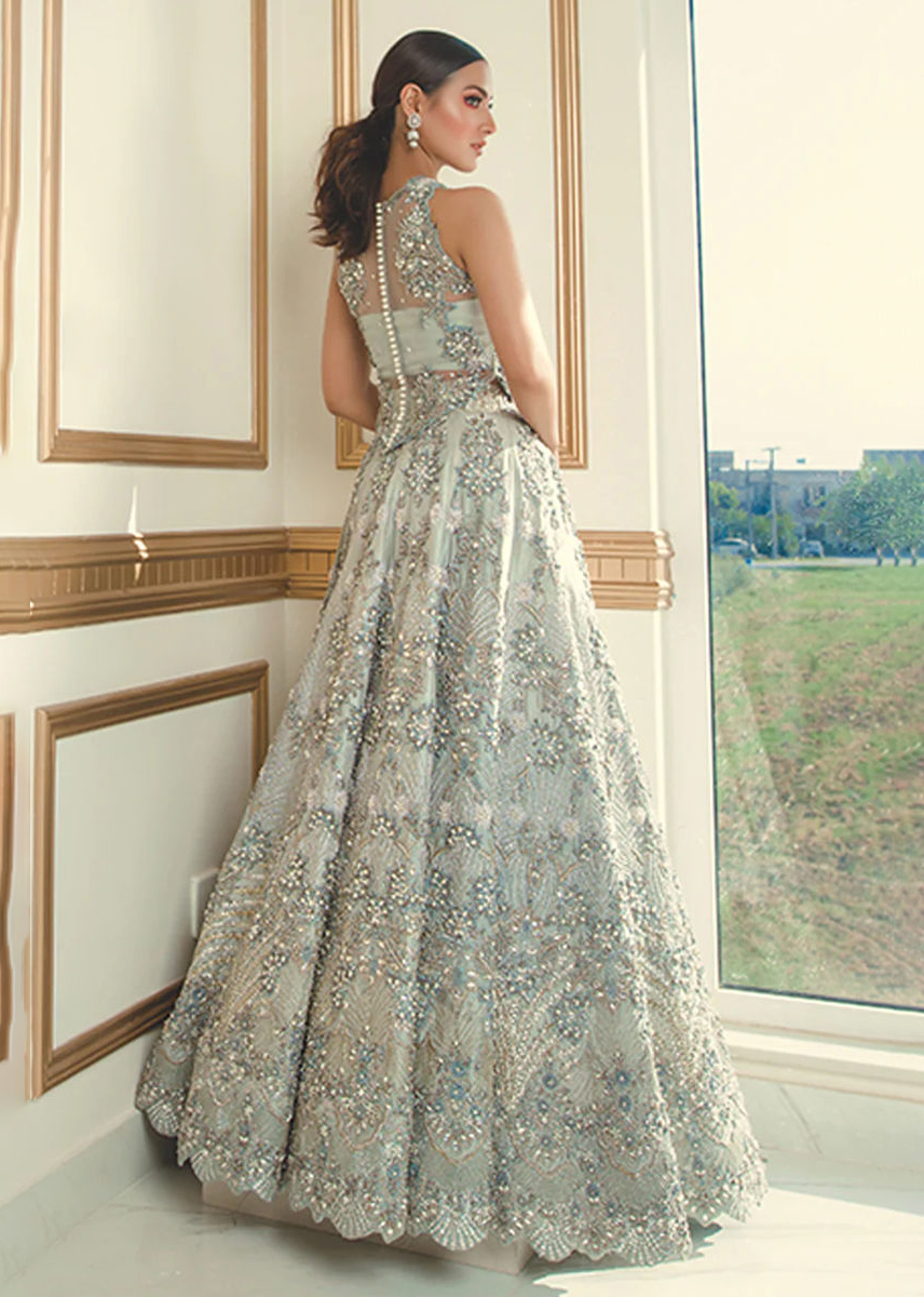Striking grey ensemble. Featuring an Illusion halter neckline, the fetching blue blouse and matching icy embellished skirt epitomize opulence with attention to scrupulous details in cool toned hues. The gorgeously structured lehnga adds an aura of prestige and regality