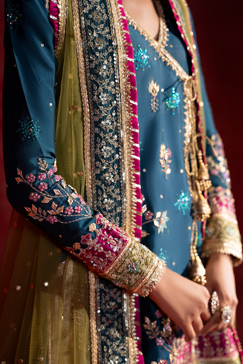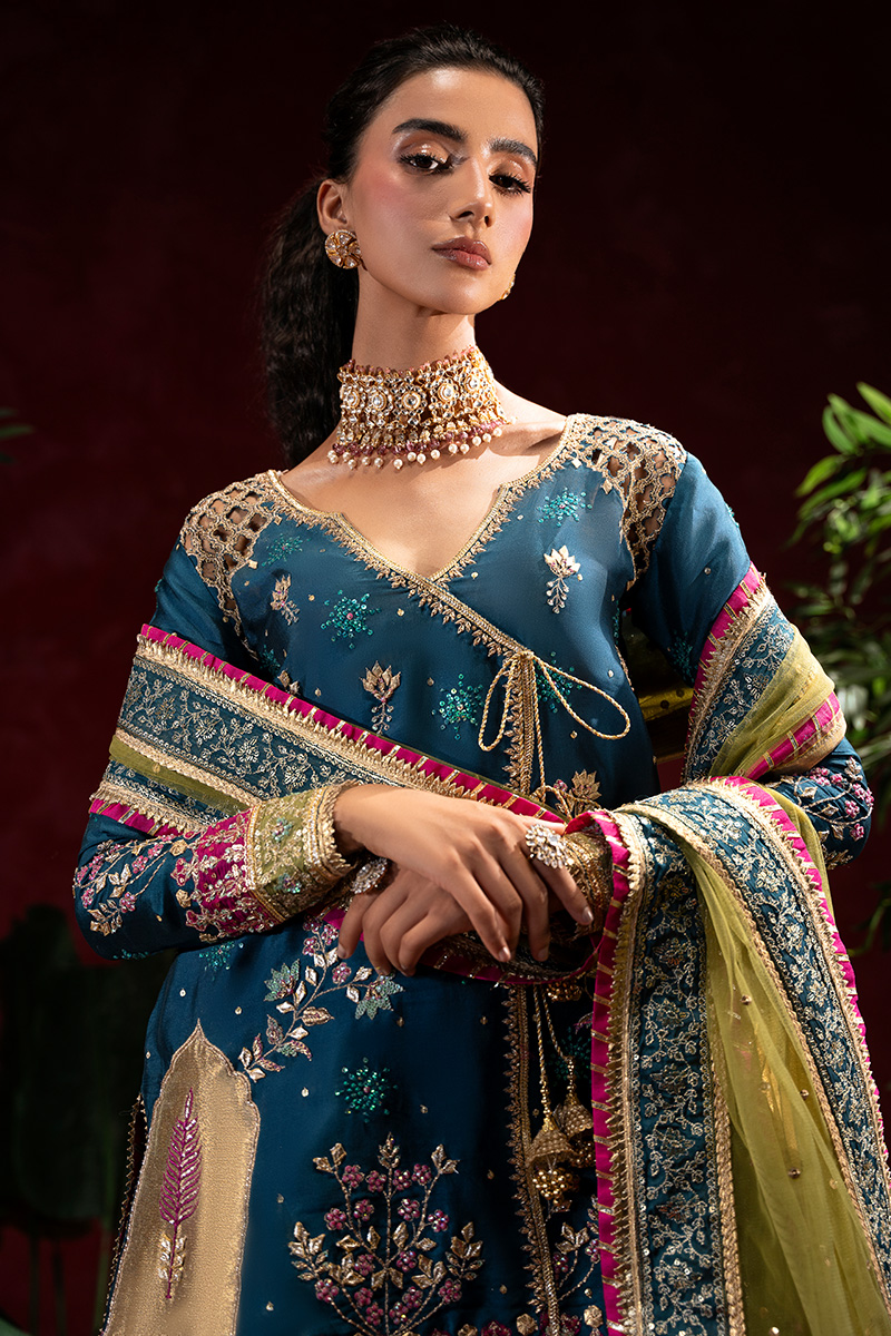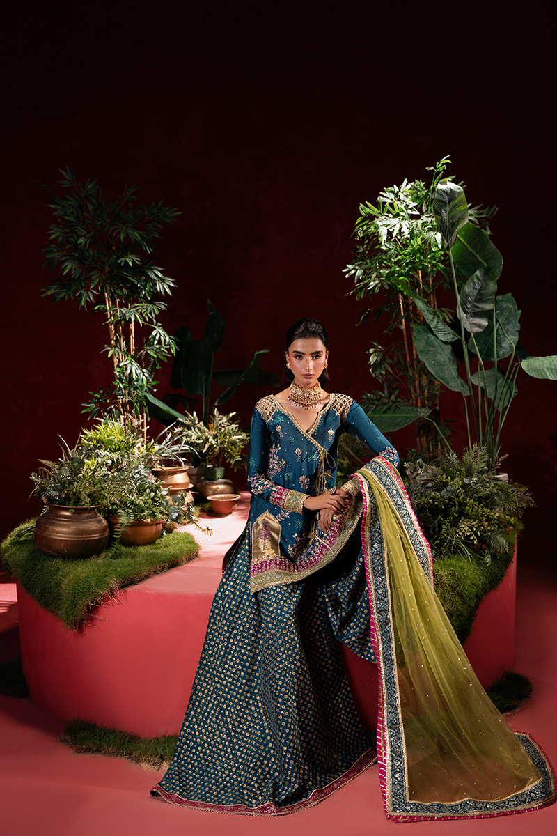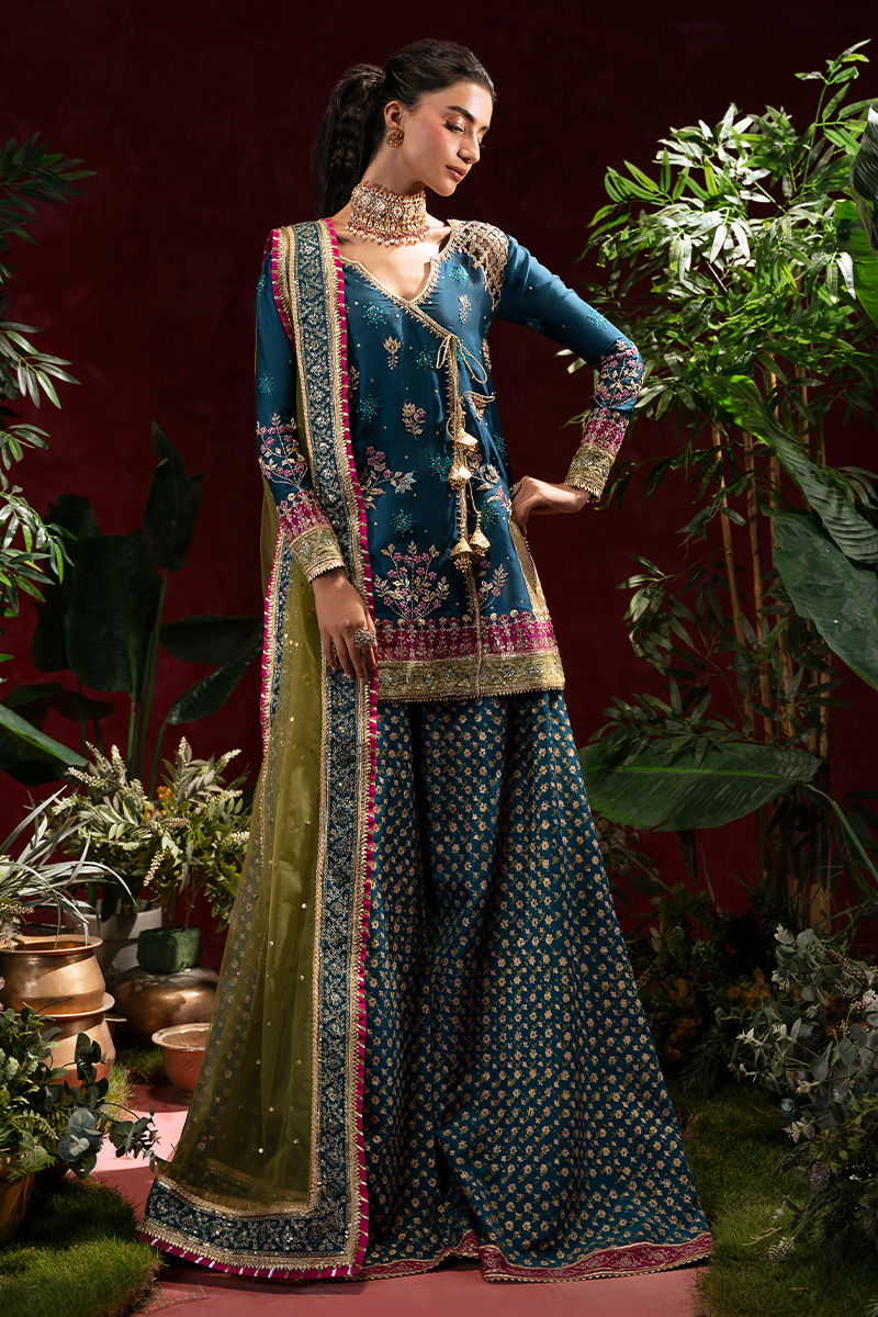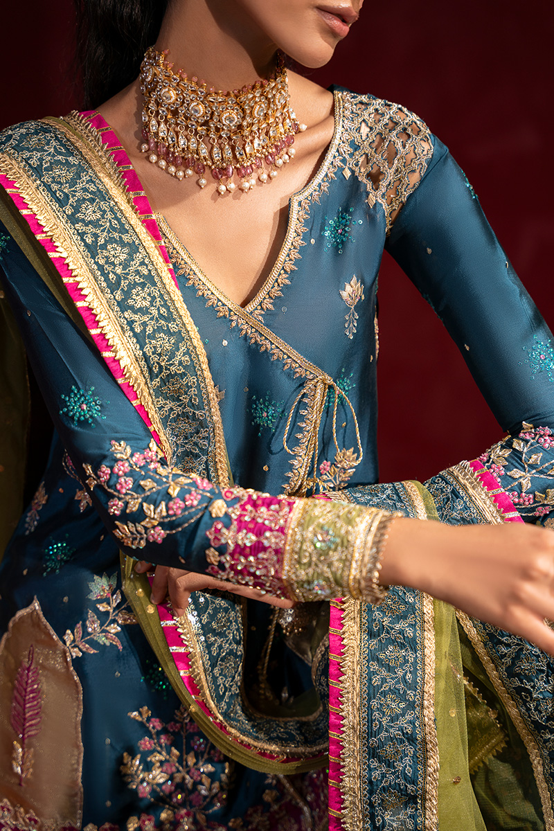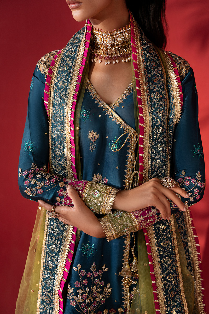 A stunning teal sheesha silk angrakha short shirt adorned with nakshi dabka neckline, zero-size cut dana and sitara motifs, and handmade tassels. The hem features tila, gota, and nakshi work, finished with a soft tissue border.Paired with a lime green net dupatta featuring geometric spray and a tila and chataa patti border, and Korean silk trousers with golden block print, tila border, and tissue finishing—this ensemble blends tradition with elegance.