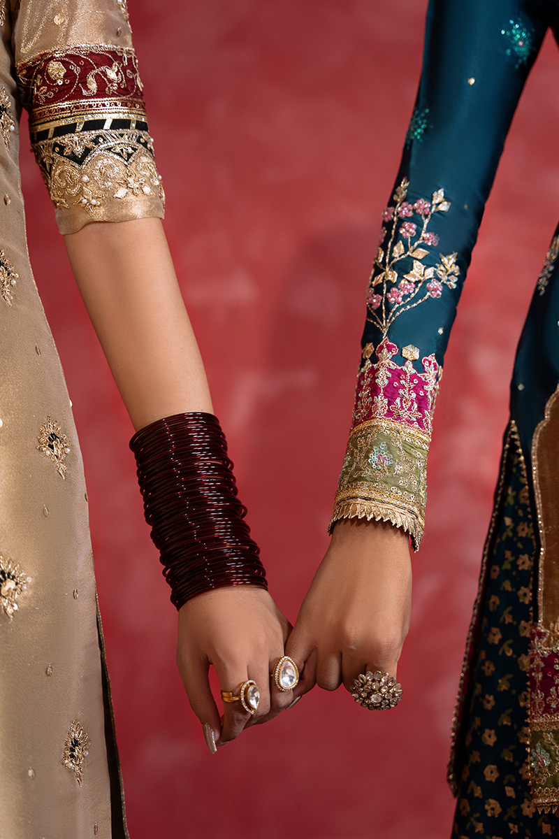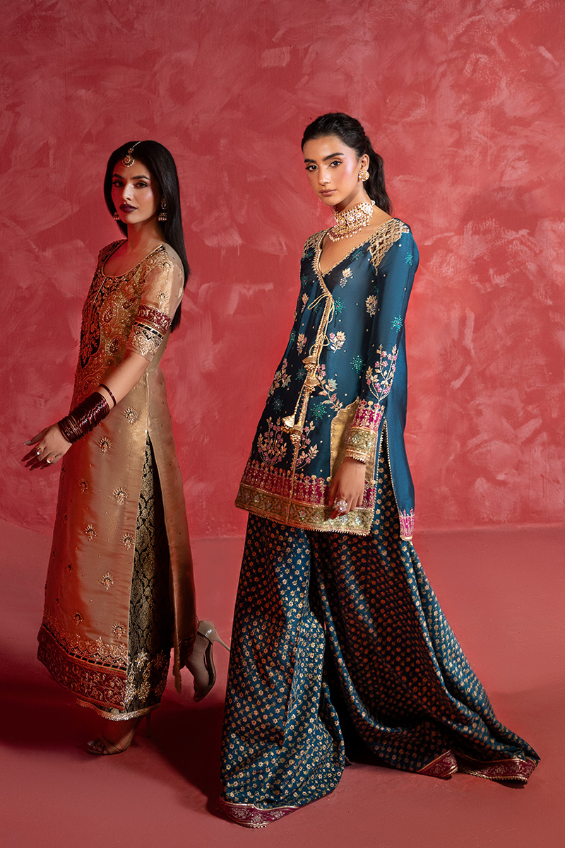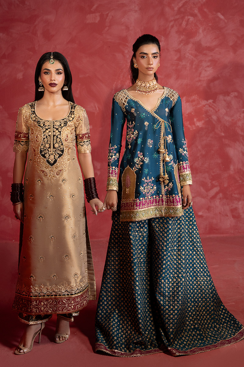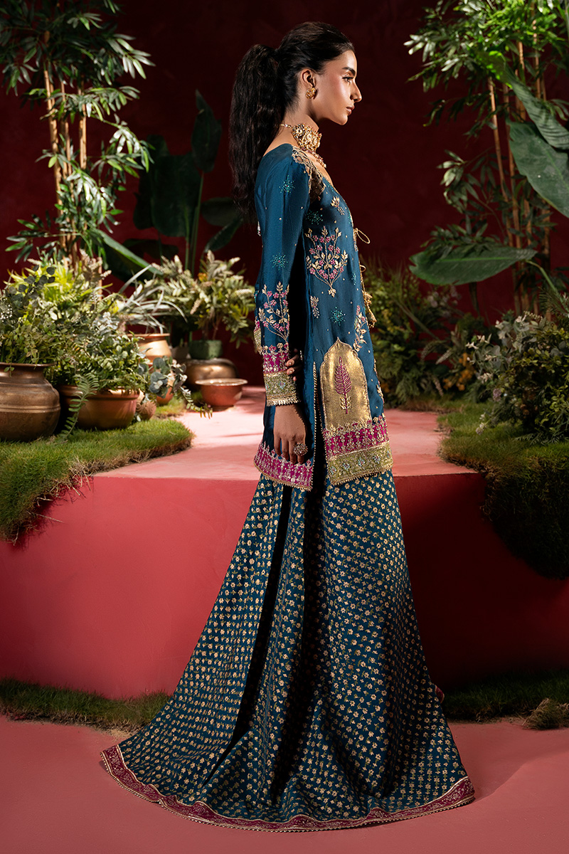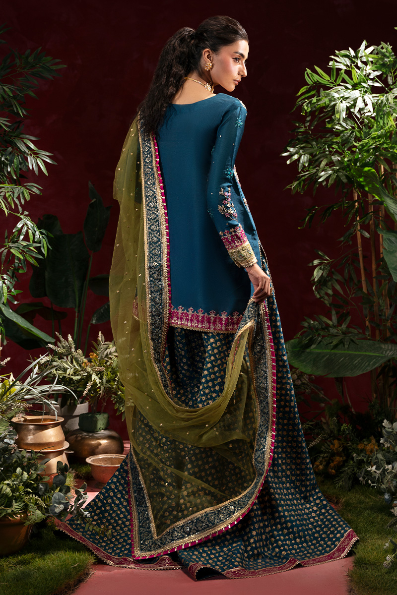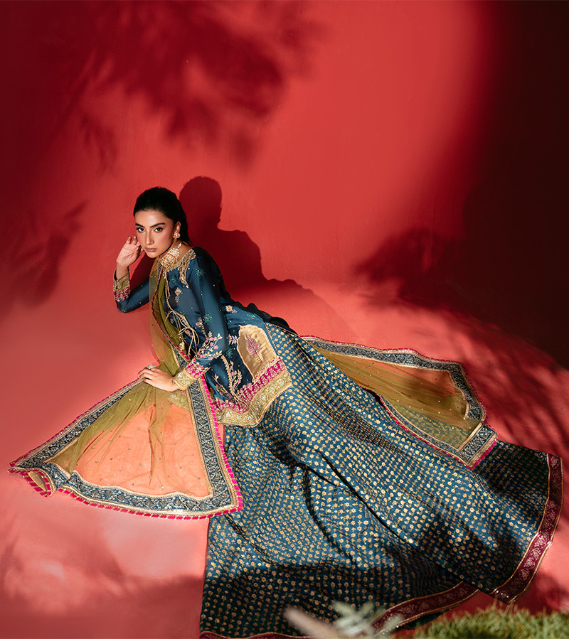 A stunning teal sheesha silk angrakha short shirt adorned with nakshi dabka neckline, zero-size cut dana and sitara motifs, and handmade tassels. The hem features tila, gota, and nakshi work, finished with a soft tissue border.Paired with a lime green net dupatta featuring geometric spray and a tila and chataa patti border, and Korean silk trousers with golden block print, tila border, and tissue finishing—this ensemble blends tradition with elegance.