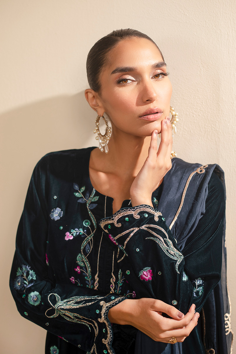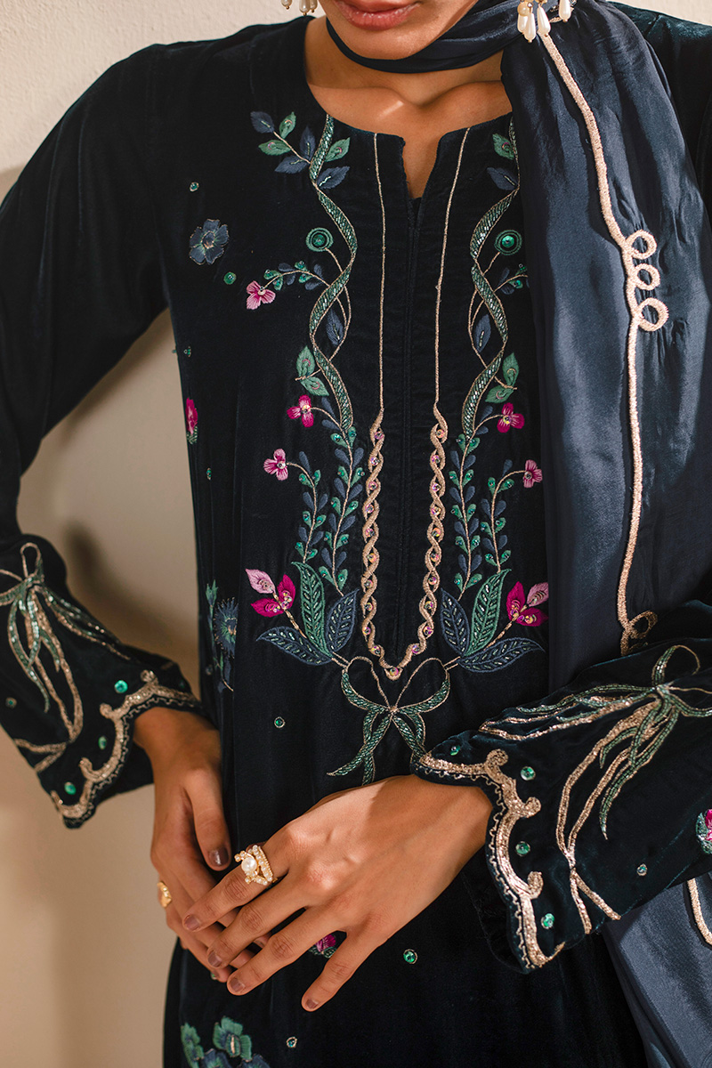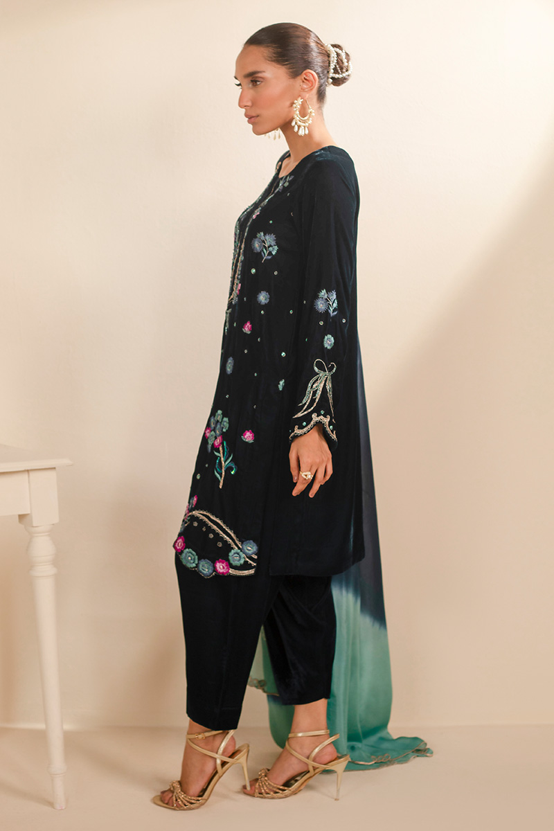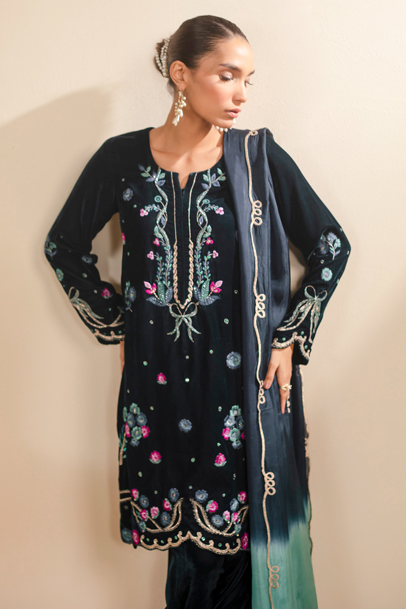 Step into sophistication with this enchanting velvet aticle. The deep midnight blue is adorned with exquisite embroidery in turquoise, fuchsia and soft teal, forming blooming floral motifs.Each detail reflects artistry, from delicately embroidered neckline and sleeves to scalloped hemline finished with resham, zardozi and sequins. The metalic tilla threadwork further enhances the charm of this article. Paired with ombre slik dupatta entricately embroidered along the edges, this is a celeberation of elegance and artistry.