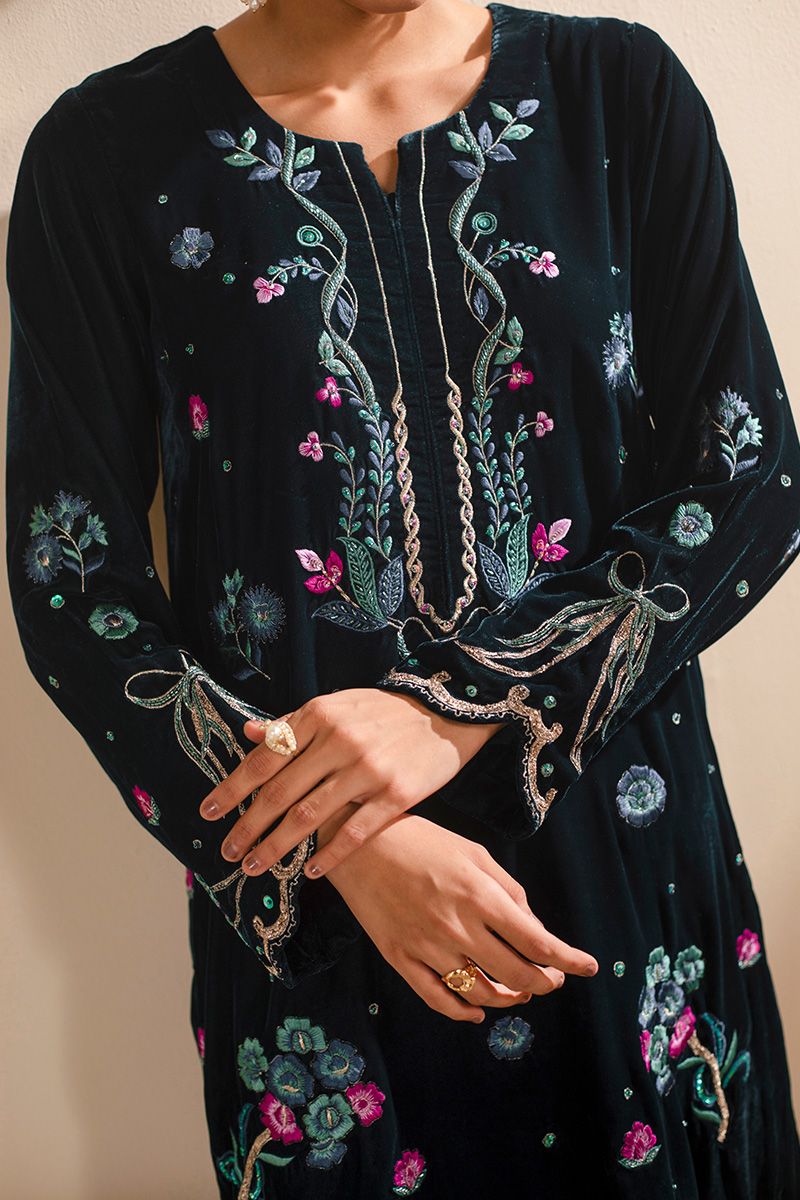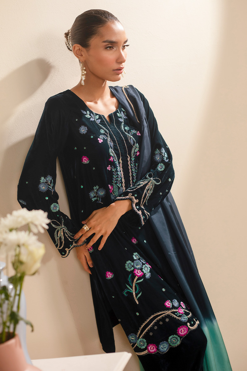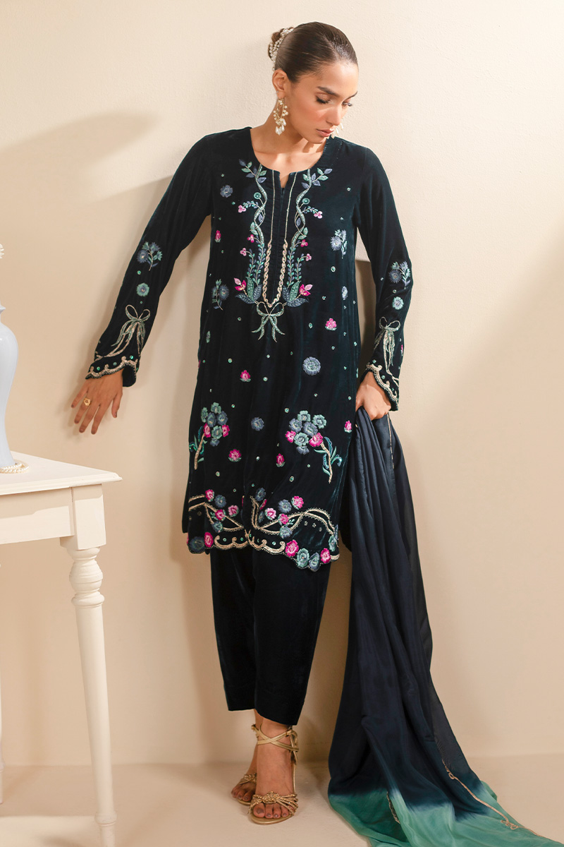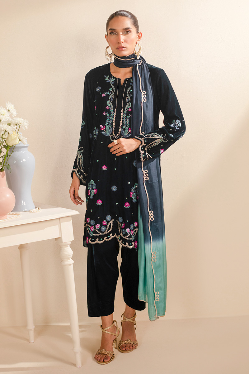 Step into sophistication with this enchanting velvet aticle. The deep midnight blue is adorned with exquisite embroidery in turquoise, fuchsia and soft teal, forming blooming floral motifs.Each detail reflects artistry, from delicately embroidered neckline and sleeves to scalloped hemline finished with resham, zardozi and sequins. The metalic tilla threadwork further enhances the charm of this article. Paired with ombre slik dupatta entricately embroidered along the edges, this is a celeberation of elegance and artistry.