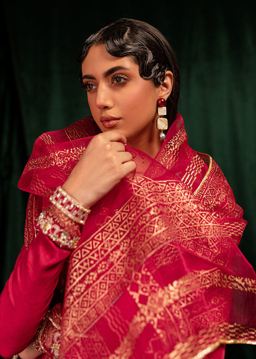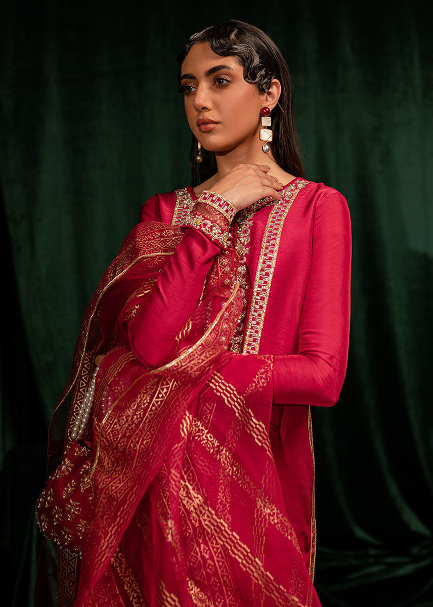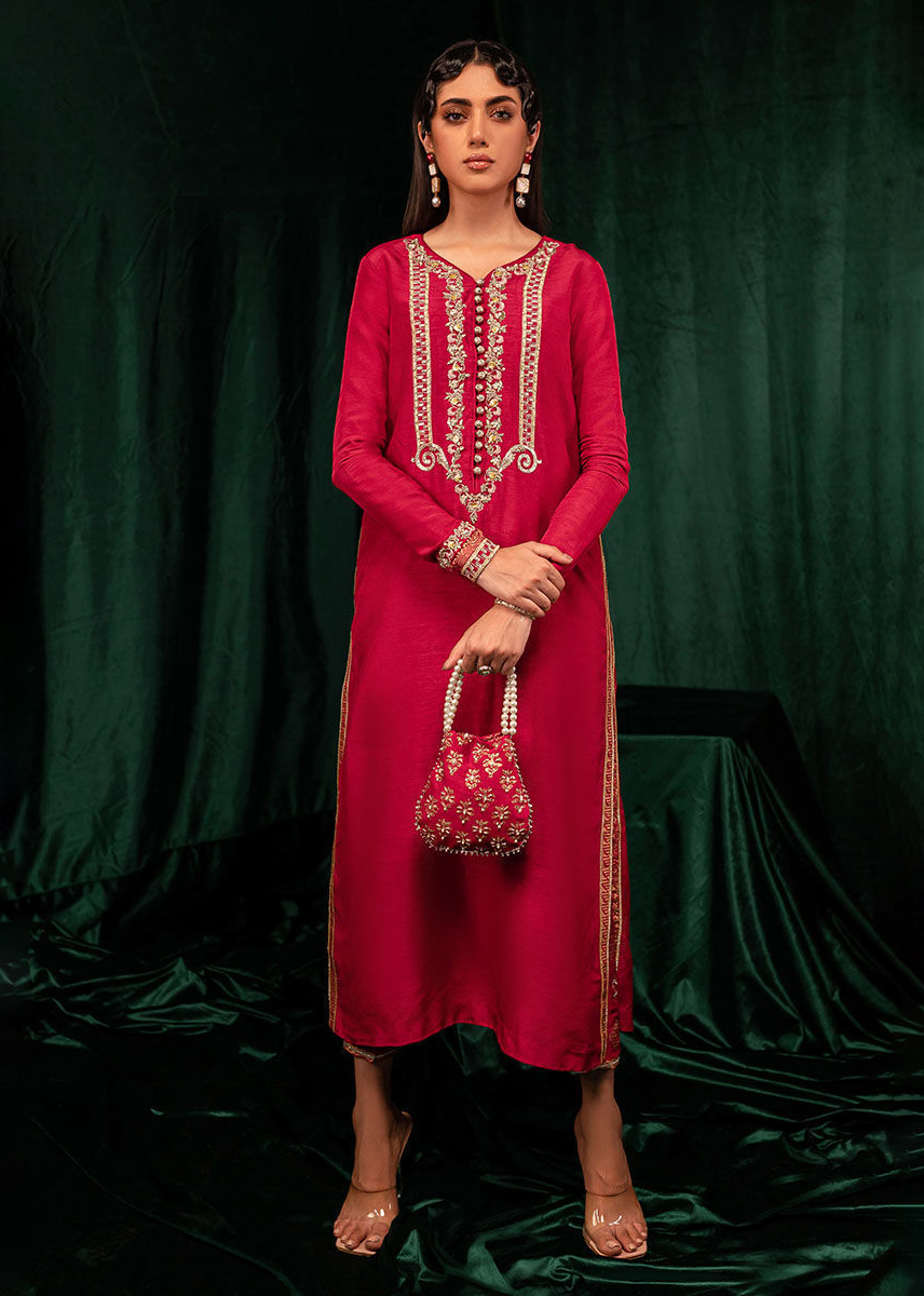 The magenta long shirt has a intricately hand embellished neckline with sequin, resham, naqshi, dabka, pitta and gota work. Further adding omph to the outfit handblocked chaak with gota work detailing. Paired with a gold blockprinted organza dupatta and a blockprinted silk trouser with pitta work.