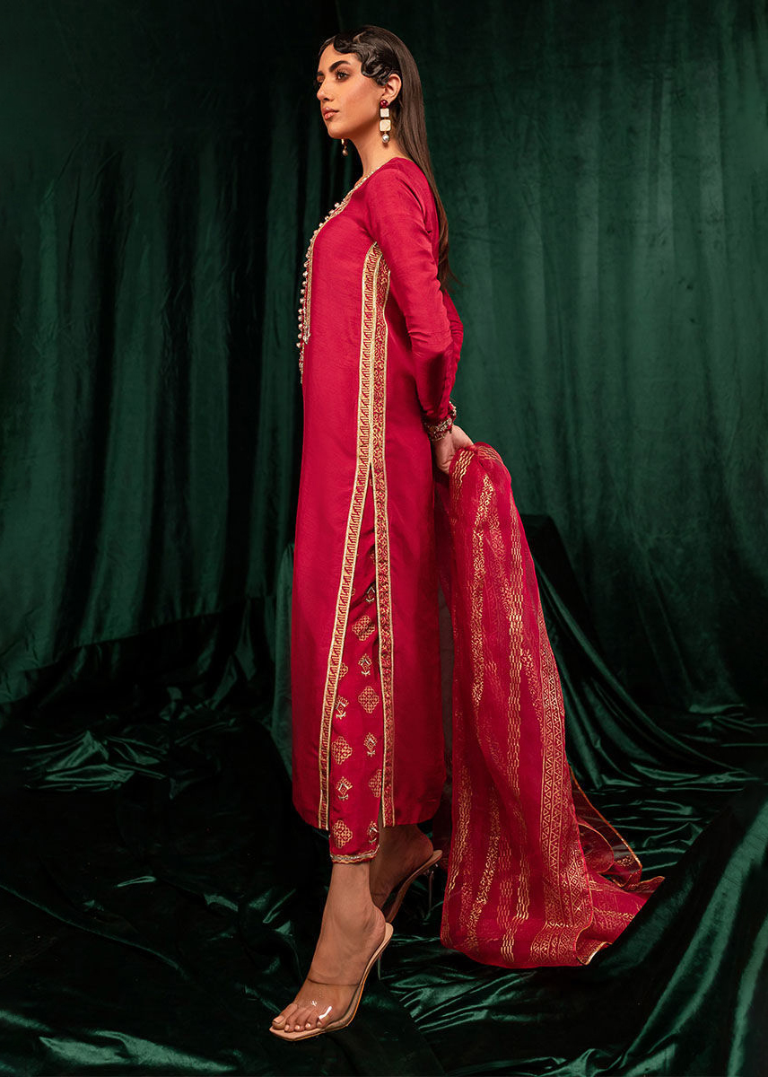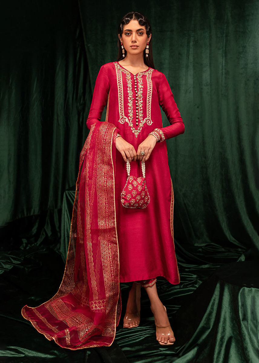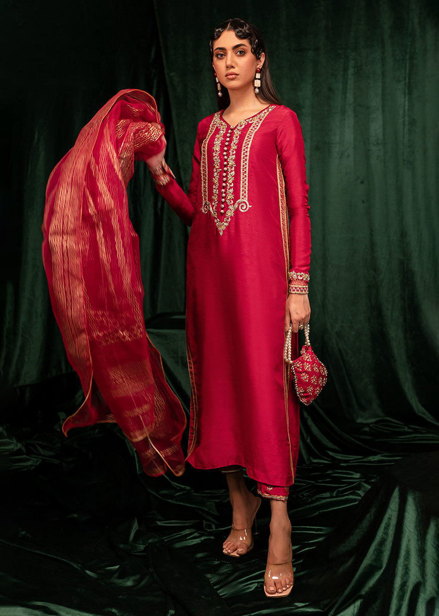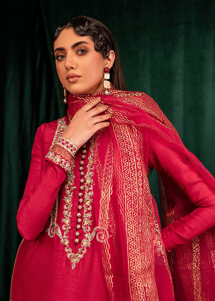 The magenta long shirt has a intricately hand embellished neckline with sequin, resham, naqshi, dabka, pitta and gota work. Further adding omph to the outfit handblocked chaak with gota work detailing. Paired with a gold blockprinted organza dupatta and a blockprinted silk trouser with pitta work.
