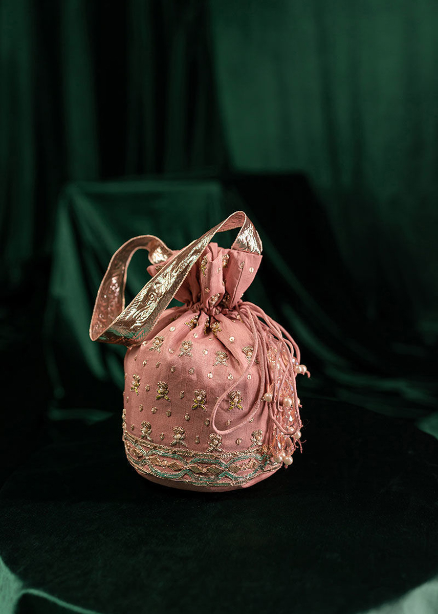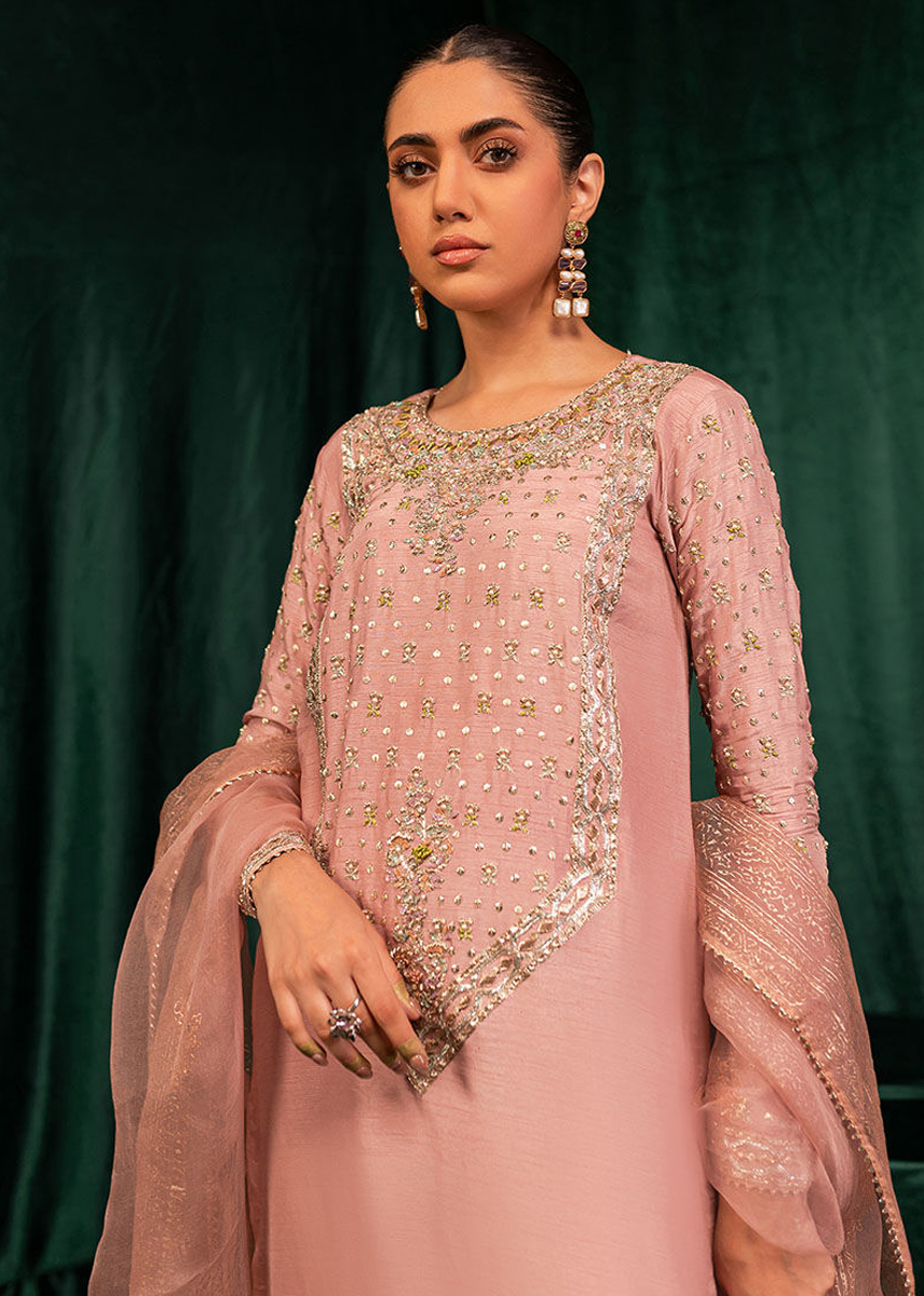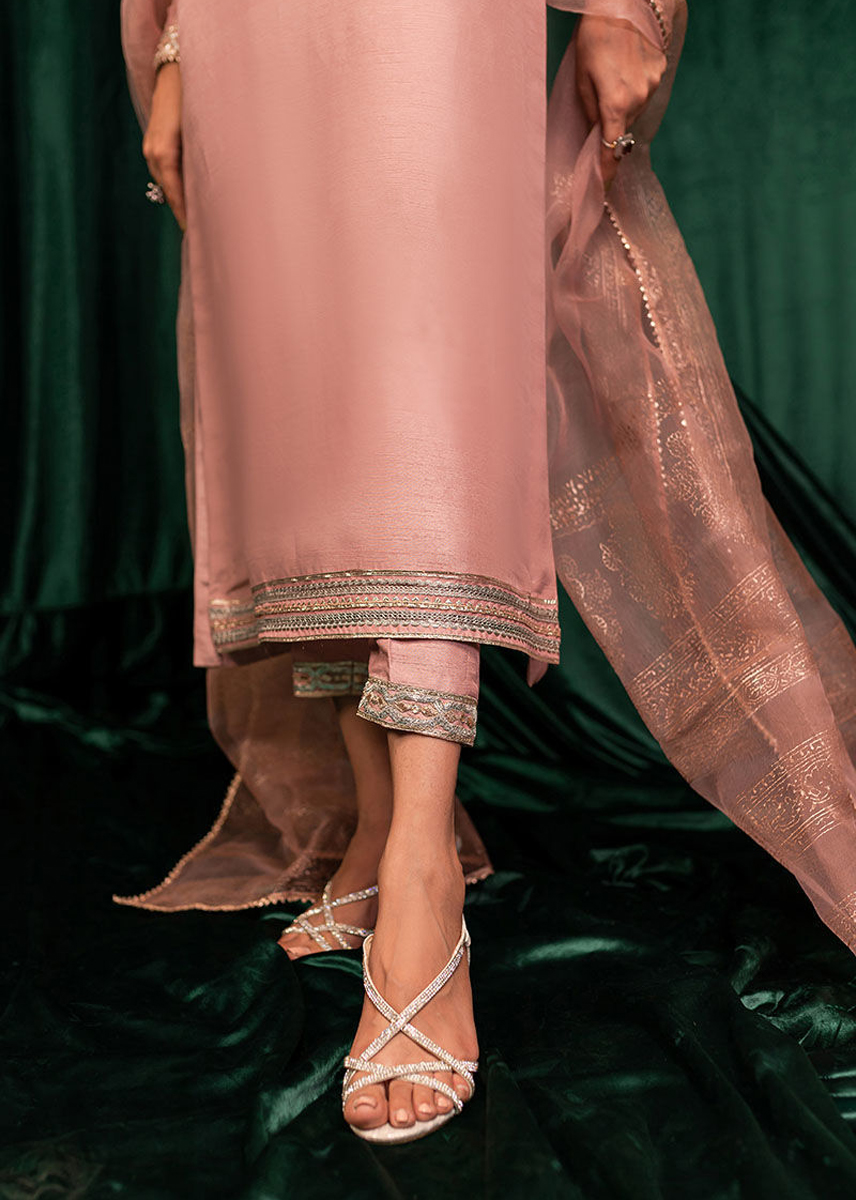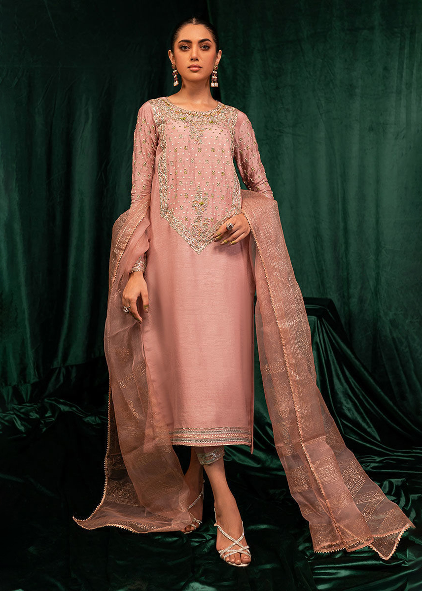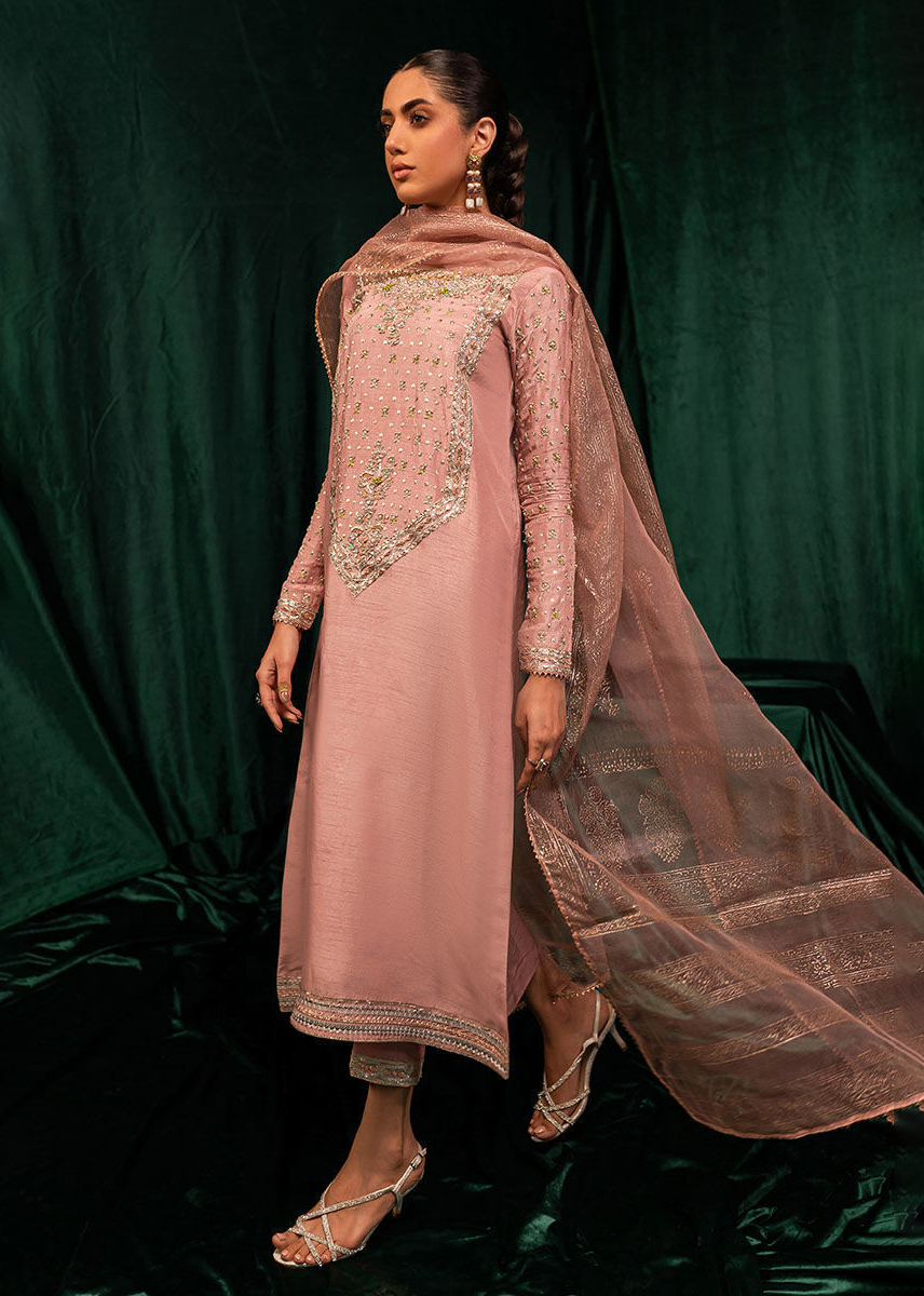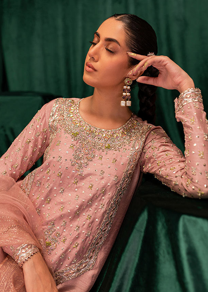 A long statement neckline with intricately hand embellished floral and geometric patterns in rose gold on tea pink silk. The neckline and sleeves feature dakba, resham, sequin, crystal and gota work. The fully hand embellished sleeves in resham dabka and gota booti, along with the tilla and gota hemline compleye the look. The outfit comes with an organza block printed dupatta with gota finishing.The gota and tilla worked culotte can be added separately.
