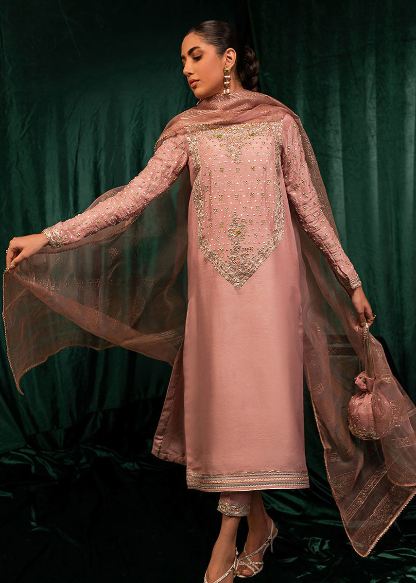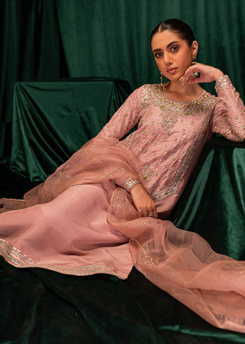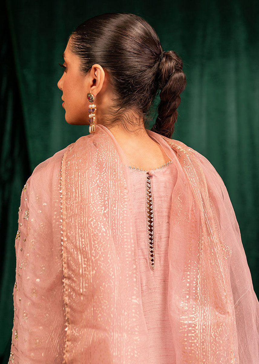 A long statement neckline with intricately hand embellished floral and geometric patterns in rose gold on tea pink silk. The neckline and sleeves feature dakba, resham, sequin, crystal and gota work. The fully hand embellished sleeves in resham dabka and gota booti, along with the tilla and gota hemline compleye the look. The outfit comes with an organza block printed dupatta with gota finishing.The gota and tilla worked culotte can be added separately.