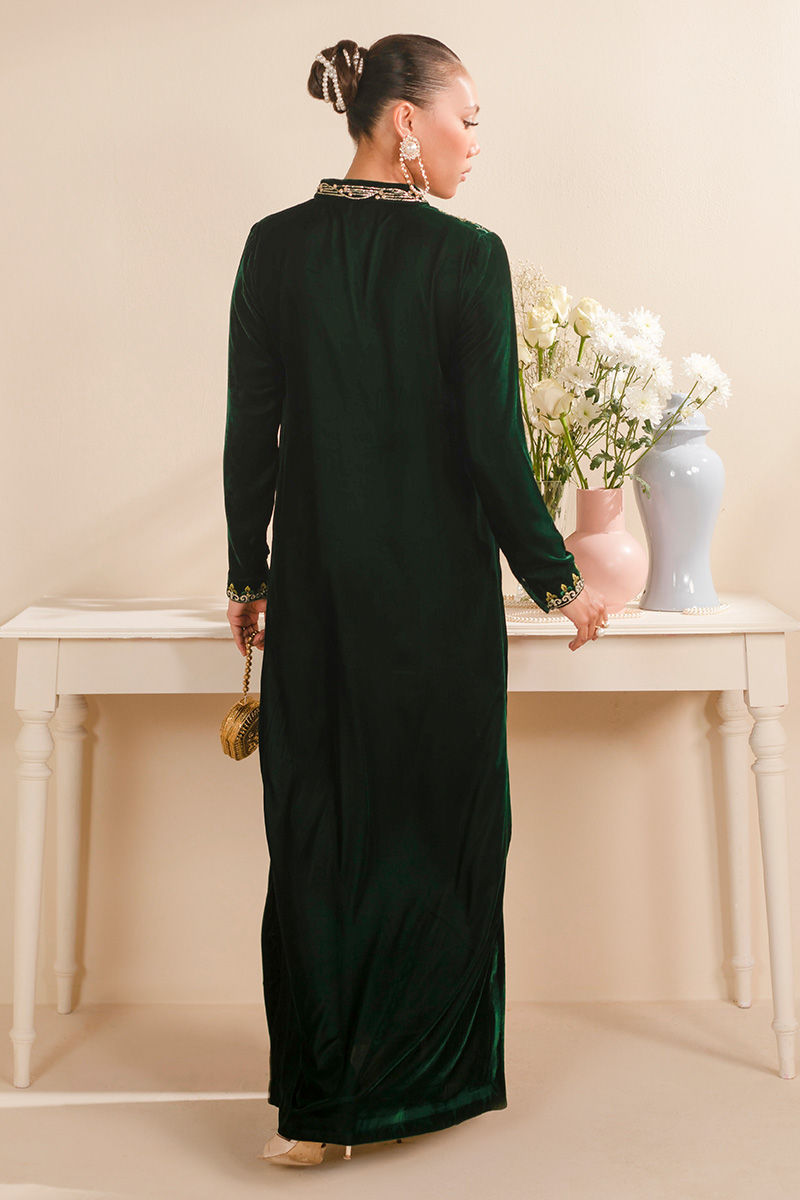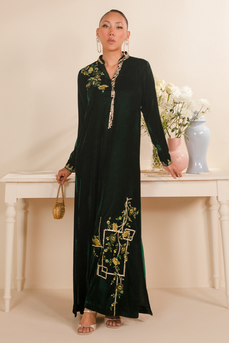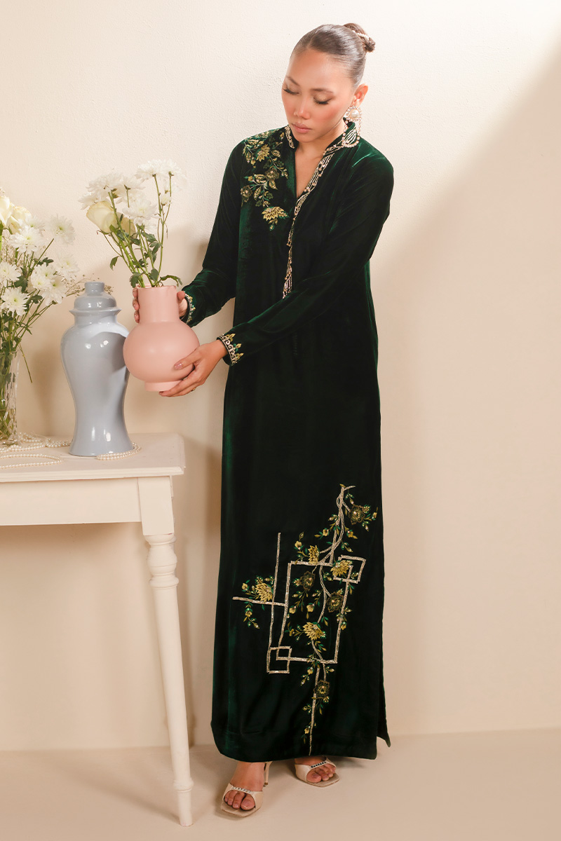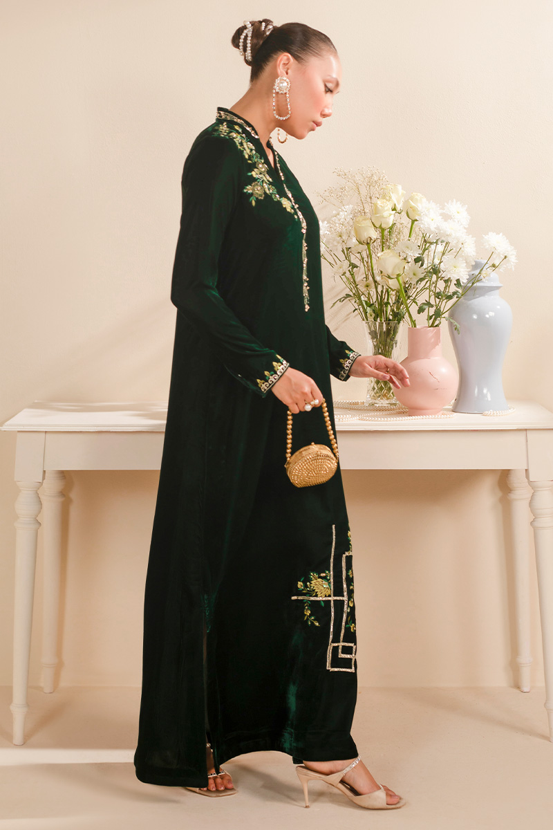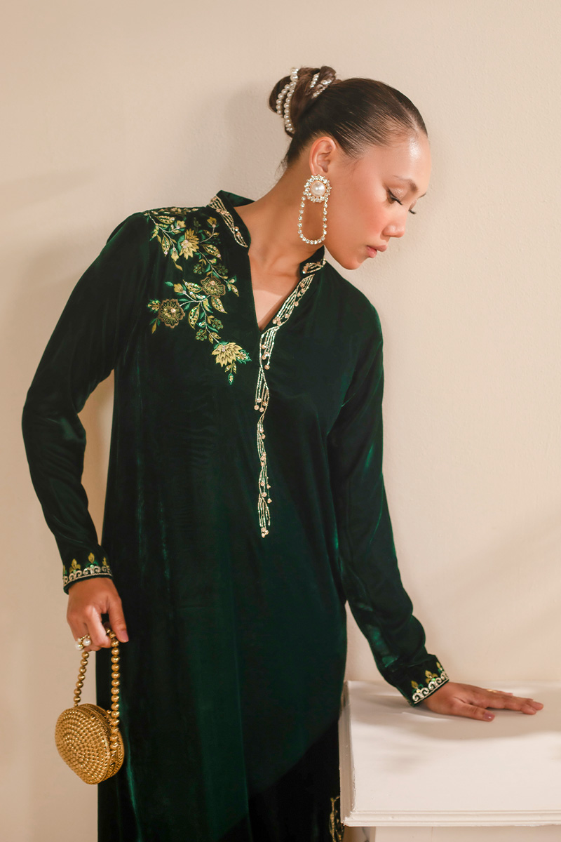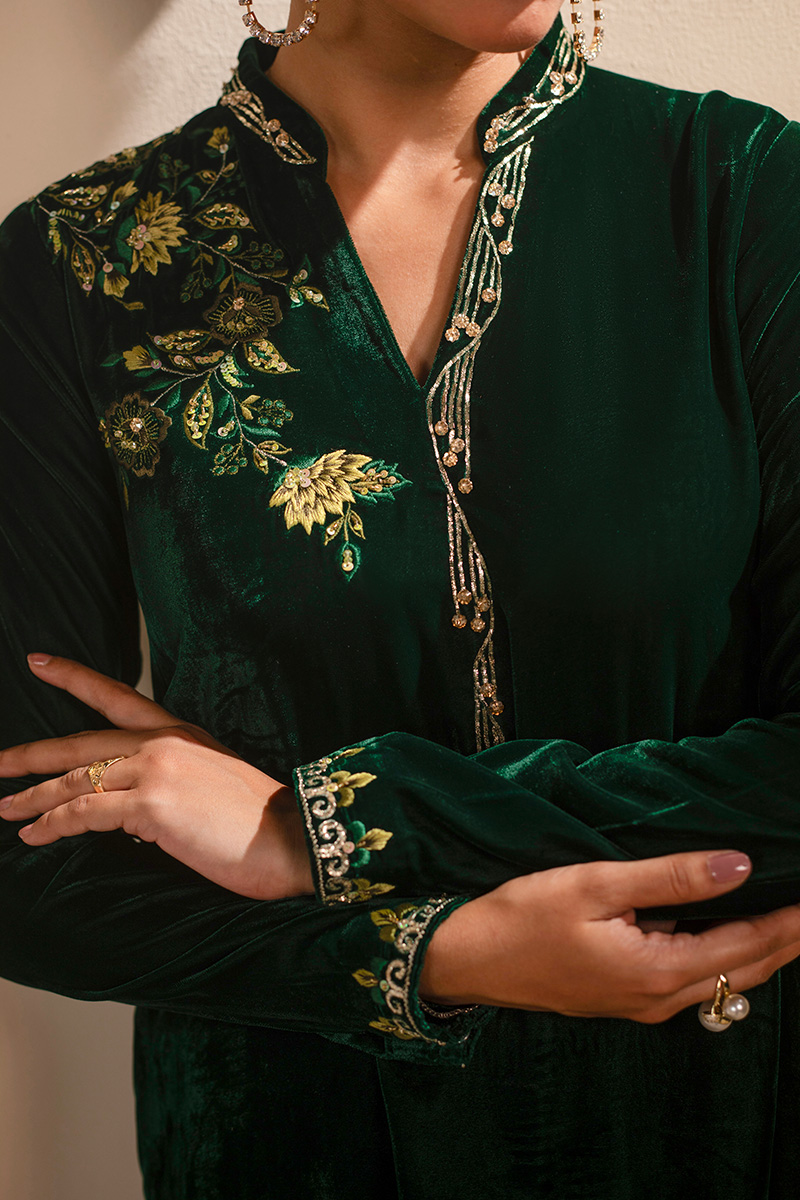 Exude elegance and sophistication in this emeralrd green, long velvet straight shirt. This silhouette features delicate embroidery and the embellishment is filled with dabka, resham, sequins and crystal work, intricately designed into floral vines and ornate motifs in the shade of complimenting antique gold. The closed neckline with a subtle front slit is beautifully edged with timeless work. This design captures the essence of luxury and takes winter festivities to the next level.