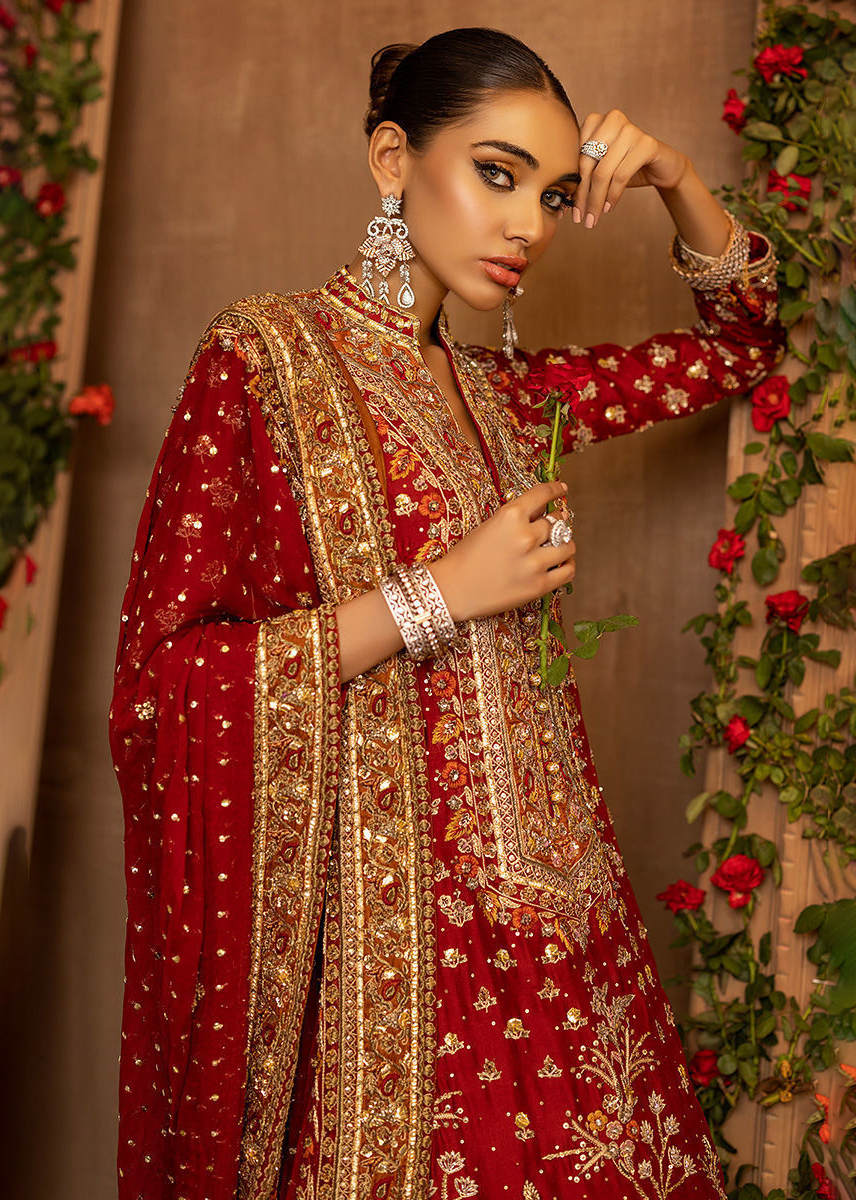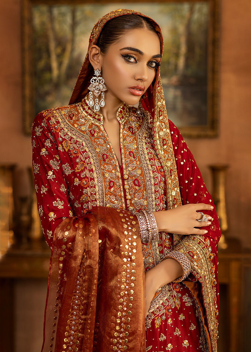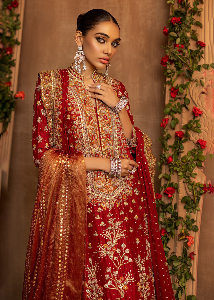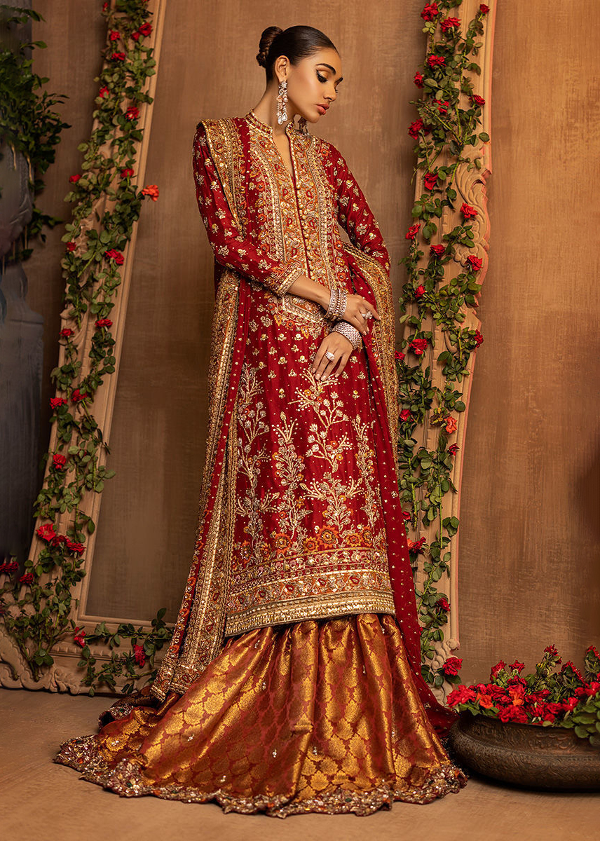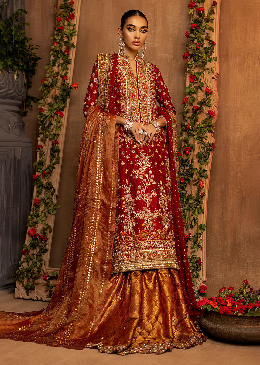 This heavily adorned long shirt with a beautifully embellished neckline has a definite border with floral vines and a rich booti chatta all over. Zardozi, resham, diamanté, tilla as well as kamdaami, gota and crystals further accentuate the outfit. The 4 yard chiffon dupatta is encircled with a rich border all around. Paired with a jamawaar farshi which has small motives all over embodies the perfect traditional etiquette and the kamdaani zari net dupatta.