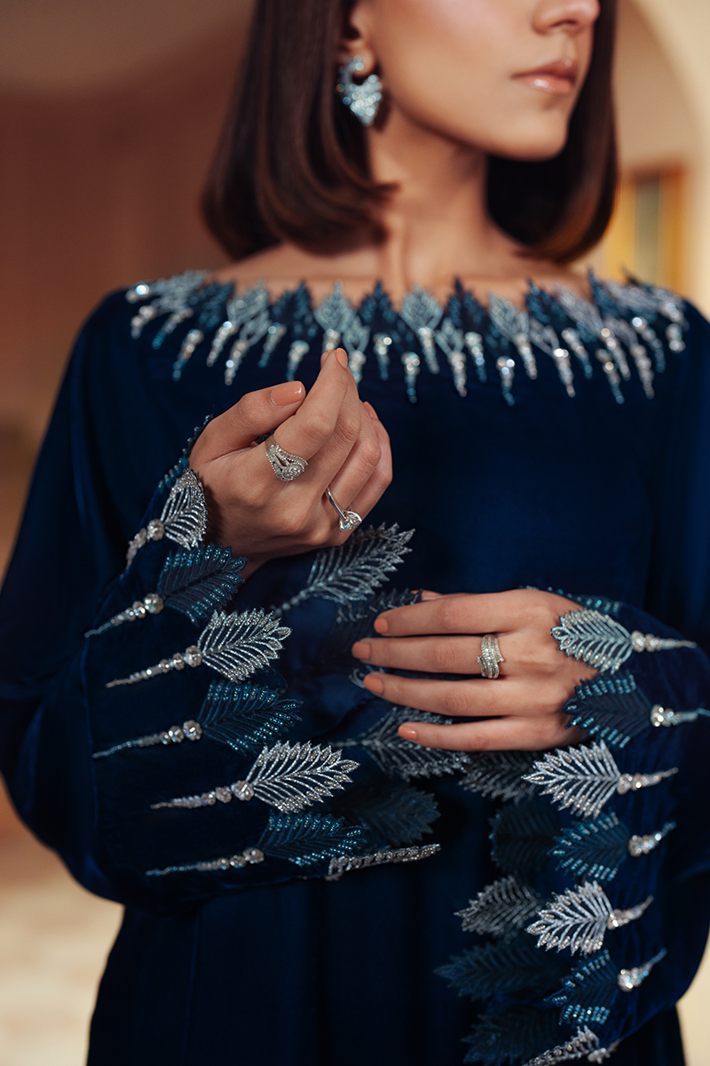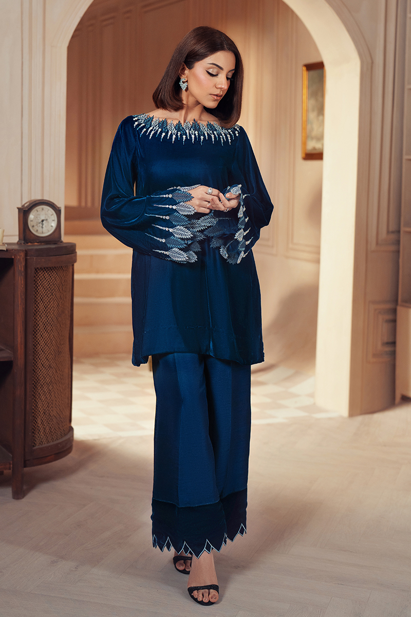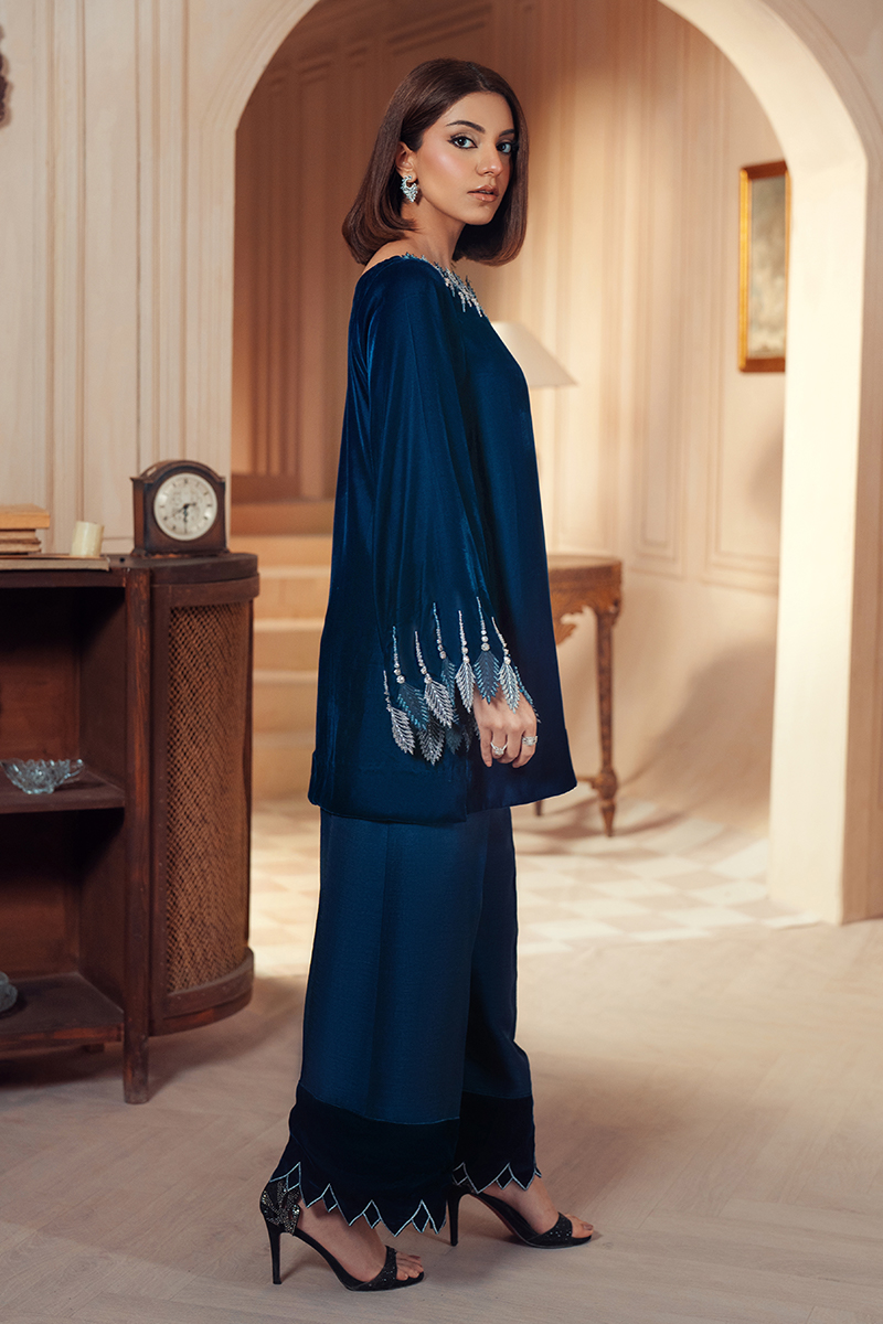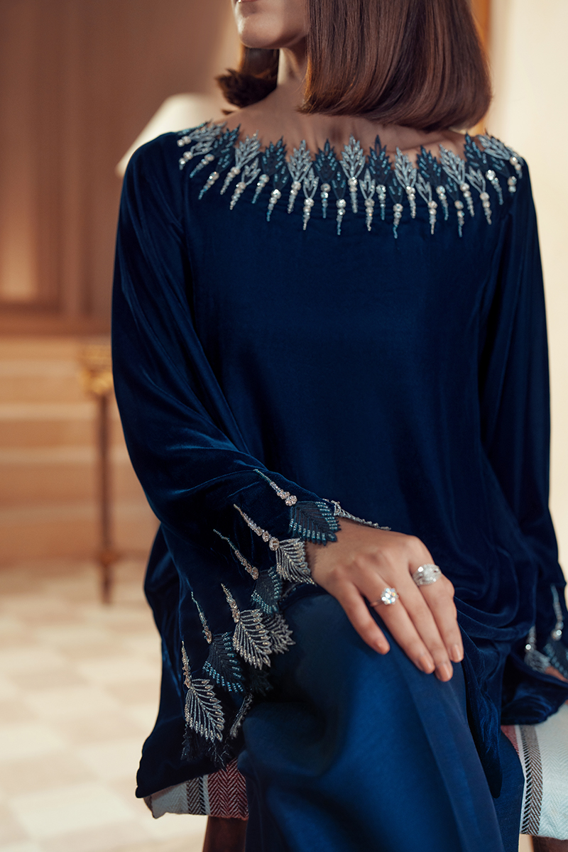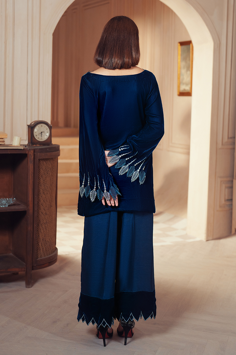 A deep blue velvet short shirt featuring hand-embellished diamanté organza cut work on the neckline and sleeves. Paired with silk culotte trousers adorned with velvet embellishments on the hem, this outfit exudes elegance and sophistication. Perfect for making a statement at any event!