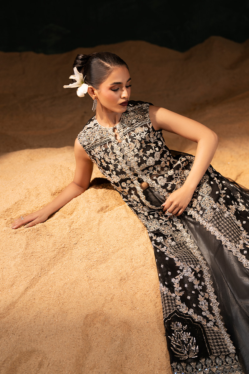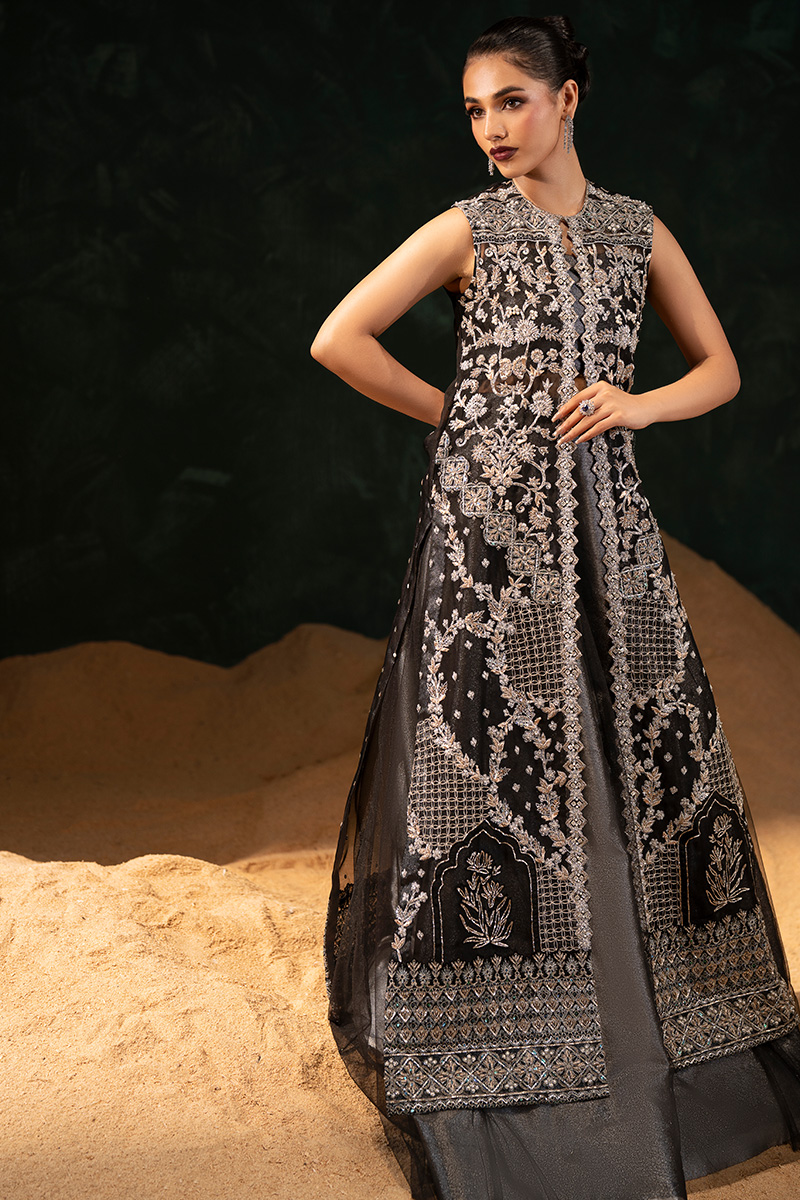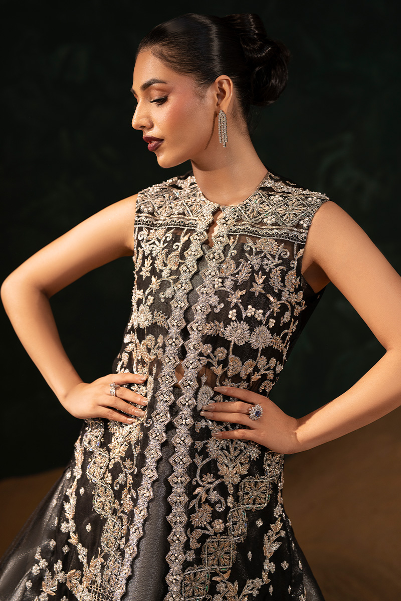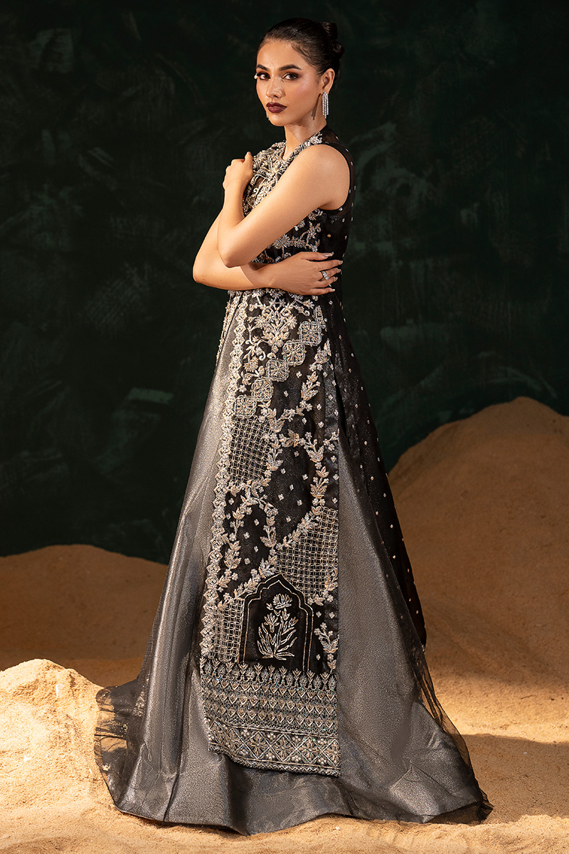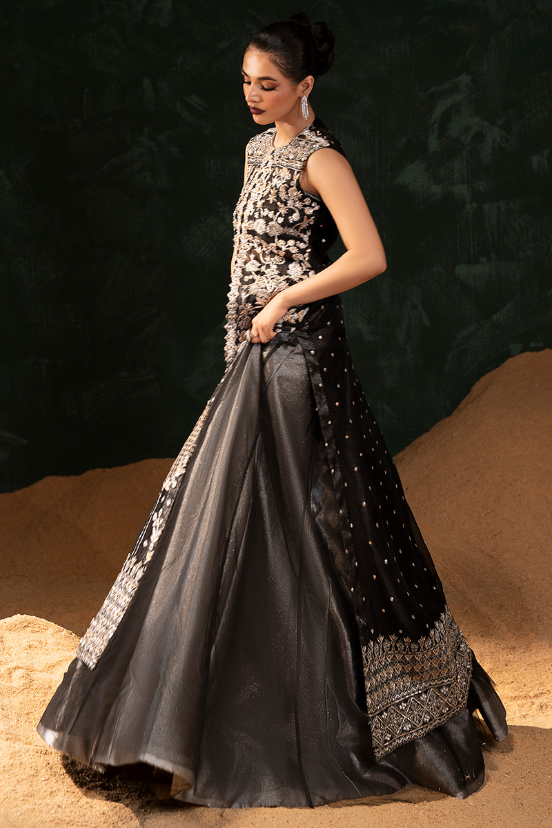 An opulent black organza front-open gown, masterfully adorned with silver and golden nakshi, dabka, kora, crystals, pearls, sitara, and gota patti, all arranged in geometrical patterns. The gown features fine tilla work squared with sequined detailing, while Embroidered block flower motifs are geometrically sequined in parallel along both front edges. Each front panel is Embellished with intricate mehrab and lotus flower designs, framed by multi-head fully Embellished borders on both front and back—lavishly worked with kora, dabka, nakshi, and sitara. The back of the gown is delicately scattered with sitara, adding a subtle shimmer. Paired beneath is a grey tissue lehenga and bustier, elegantly veiled in black net, completing the look with a balance of ethereal grace and regal grandeur.