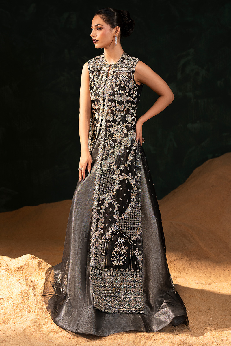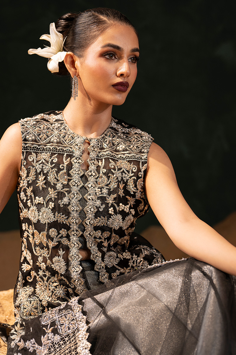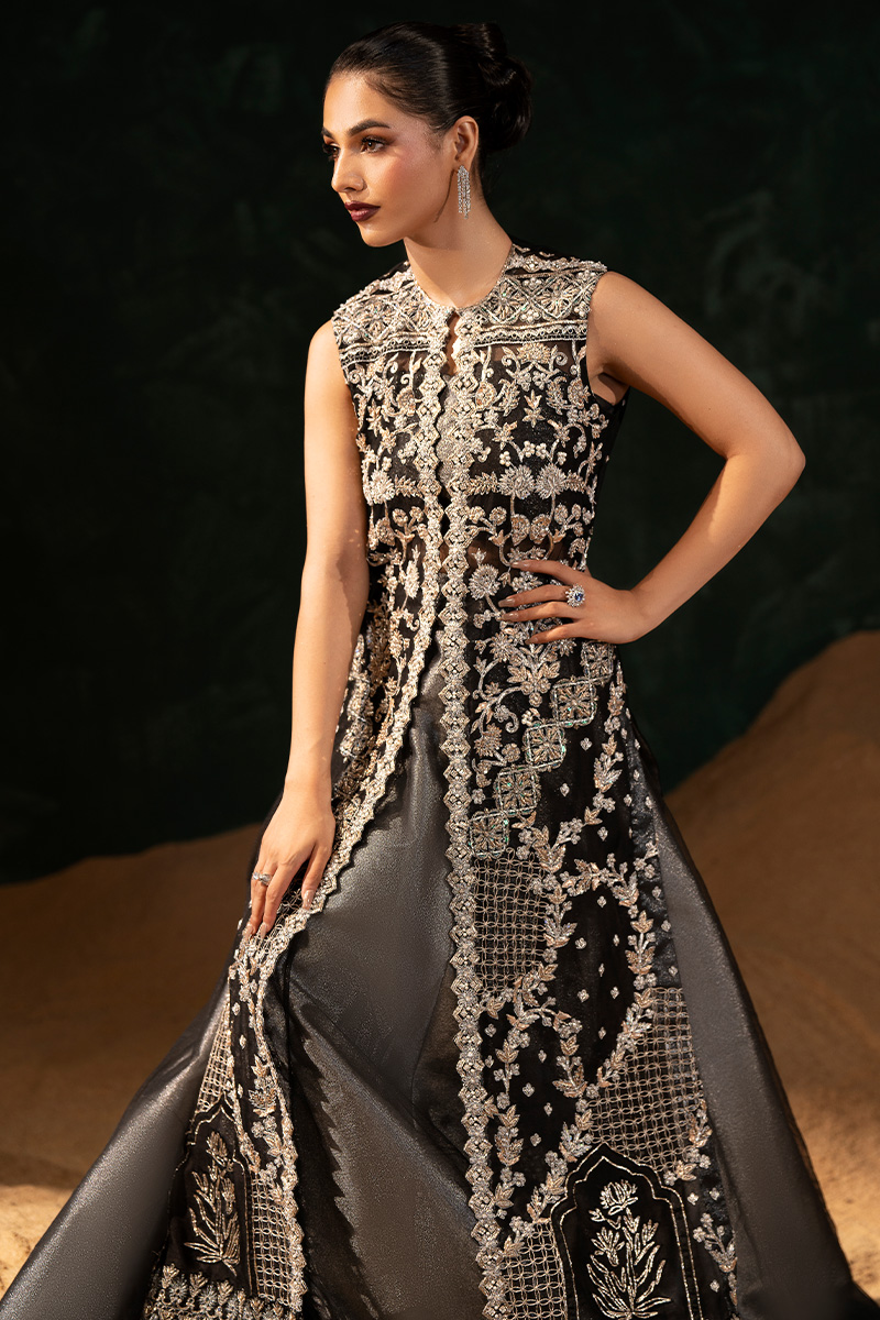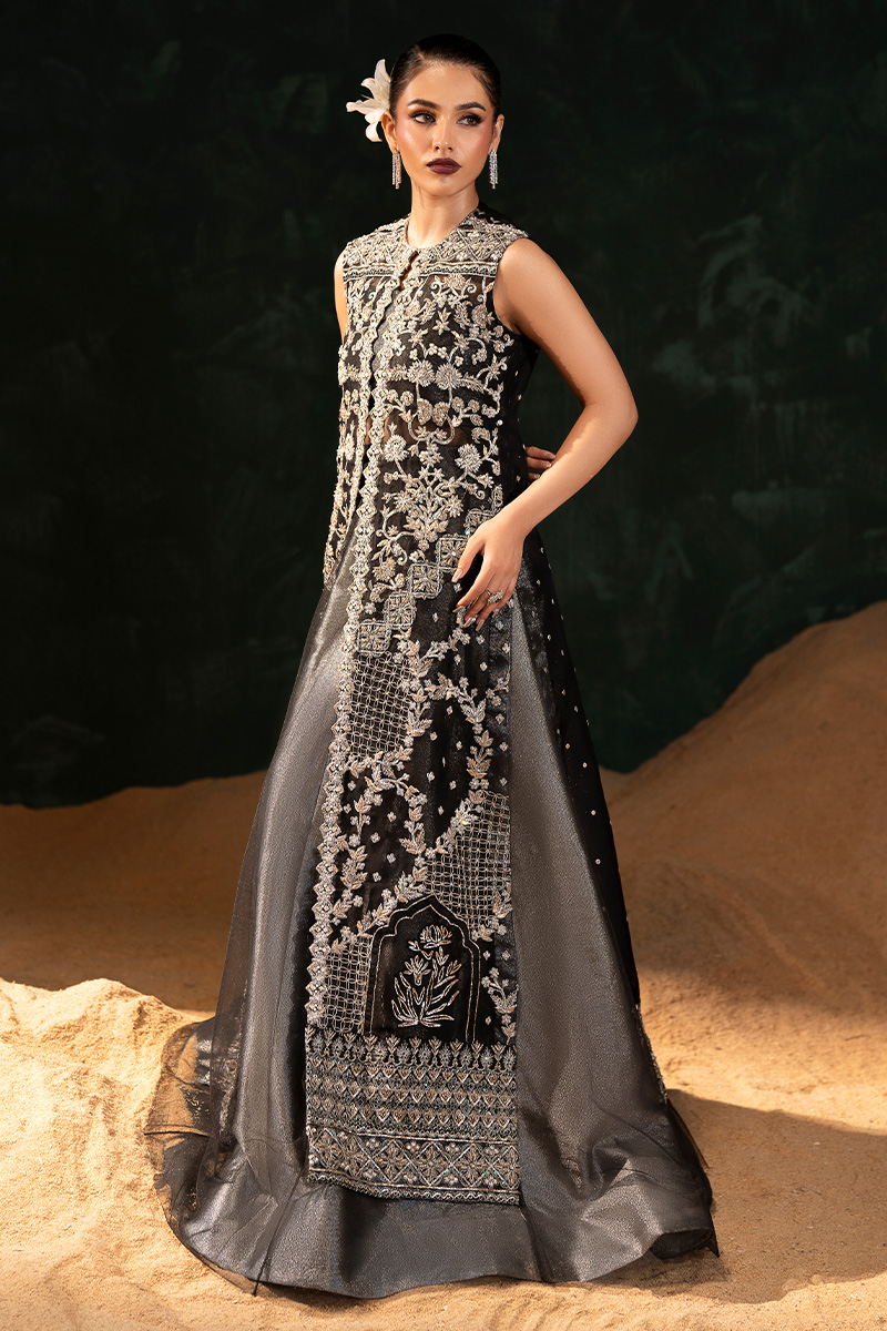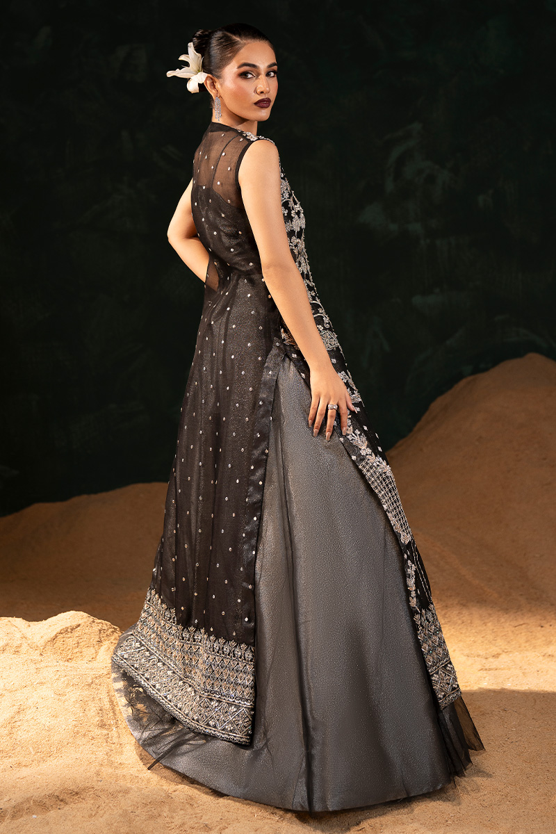 An opulent black organza front-open gown, masterfully adorned with silver and golden nakshi, dabka, kora, crystals, pearls, sitara, and gota patti, all arranged in geometrical patterns. The gown features fine tilla work squared with sequined detailing, while Embroidered block flower motifs are geometrically sequined in parallel along both front edges. Each front panel is Embellished with intricate mehrab and lotus flower designs, framed by multi-head fully Embellished borders on both front and back—lavishly worked with kora, dabka, nakshi, and sitara. The back of the gown is delicately scattered with sitara, adding a subtle shimmer. Paired beneath is a grey tissue lehenga and bustier, elegantly veiled in black net, completing the look with a balance of ethereal grace and regal grandeur.