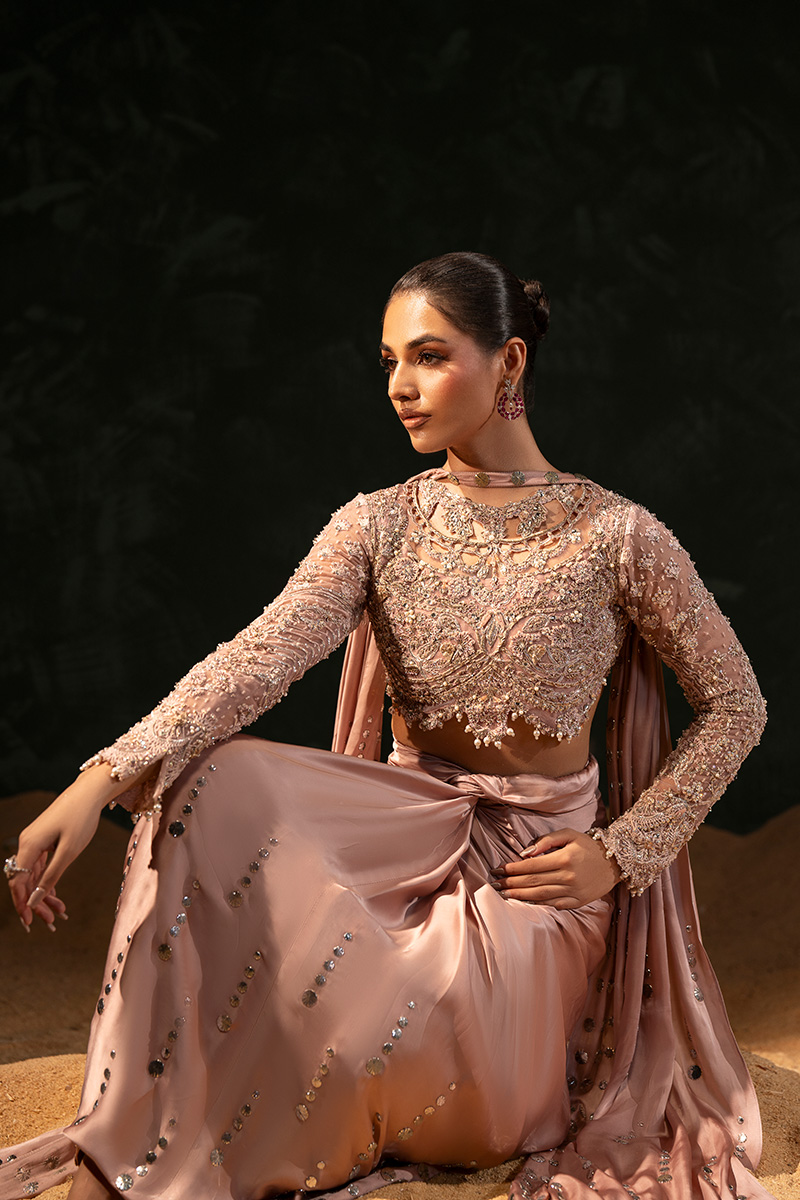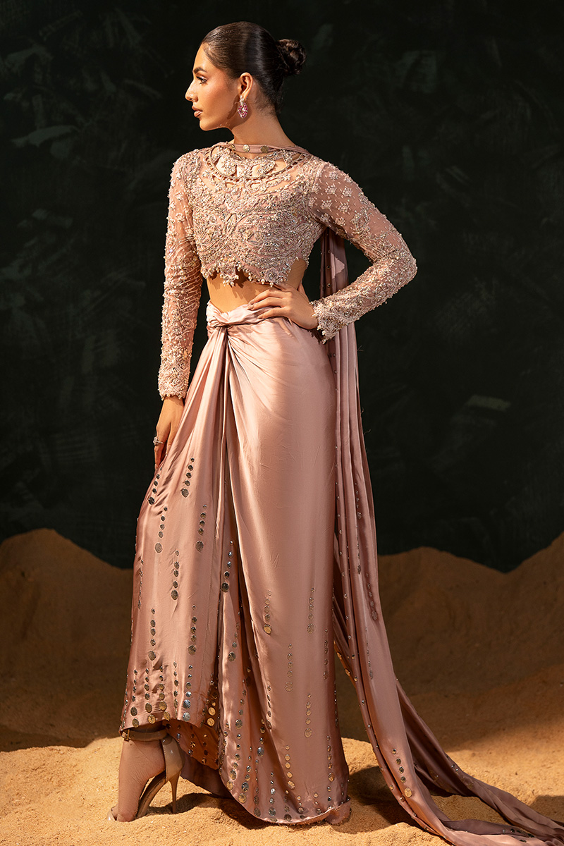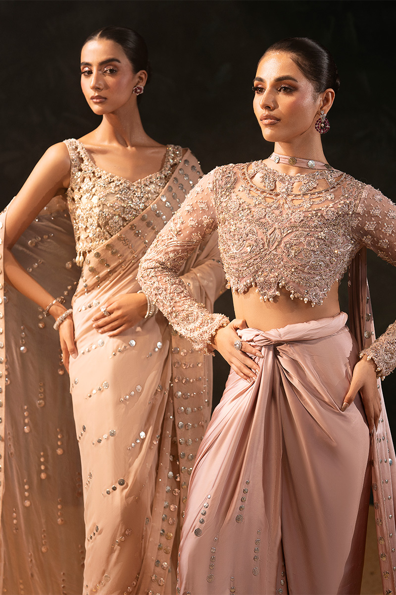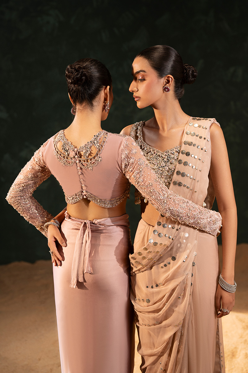 This elegant drape saree is crafted from pure silk, adorned with delicate mukesh work that adds a soft, luminous sheen. Its fluid silhouette offers graceful movement, ideal for formal occasions or festive wear.The blouse, made from sheer net with a silk lining, features intricate embellishments including kora, dabka, gota patti, crystals, sequins, and sitara. Floral and leaf motifs are densely Embroidered, while the neckline is highlighted with artisanal cutwork for added depth and charm. Finished with long sleeves and a high neckline, the look balances modesty with couture sophistication.