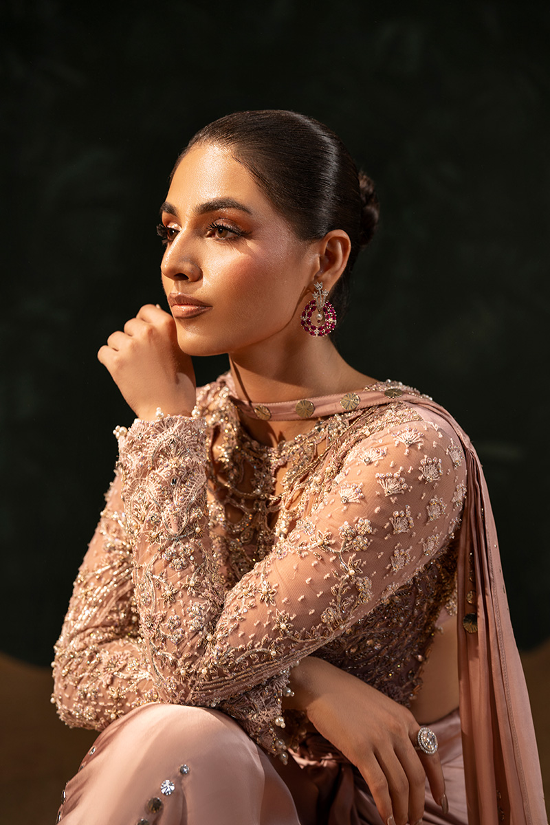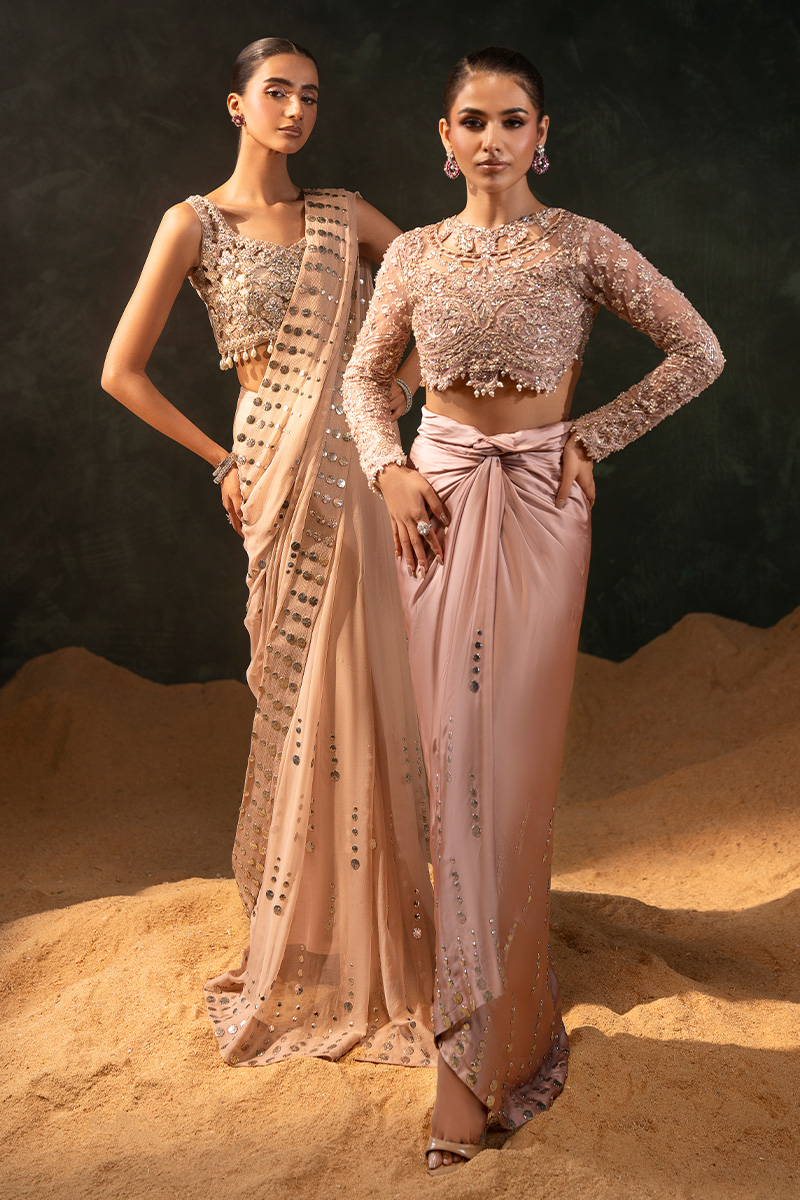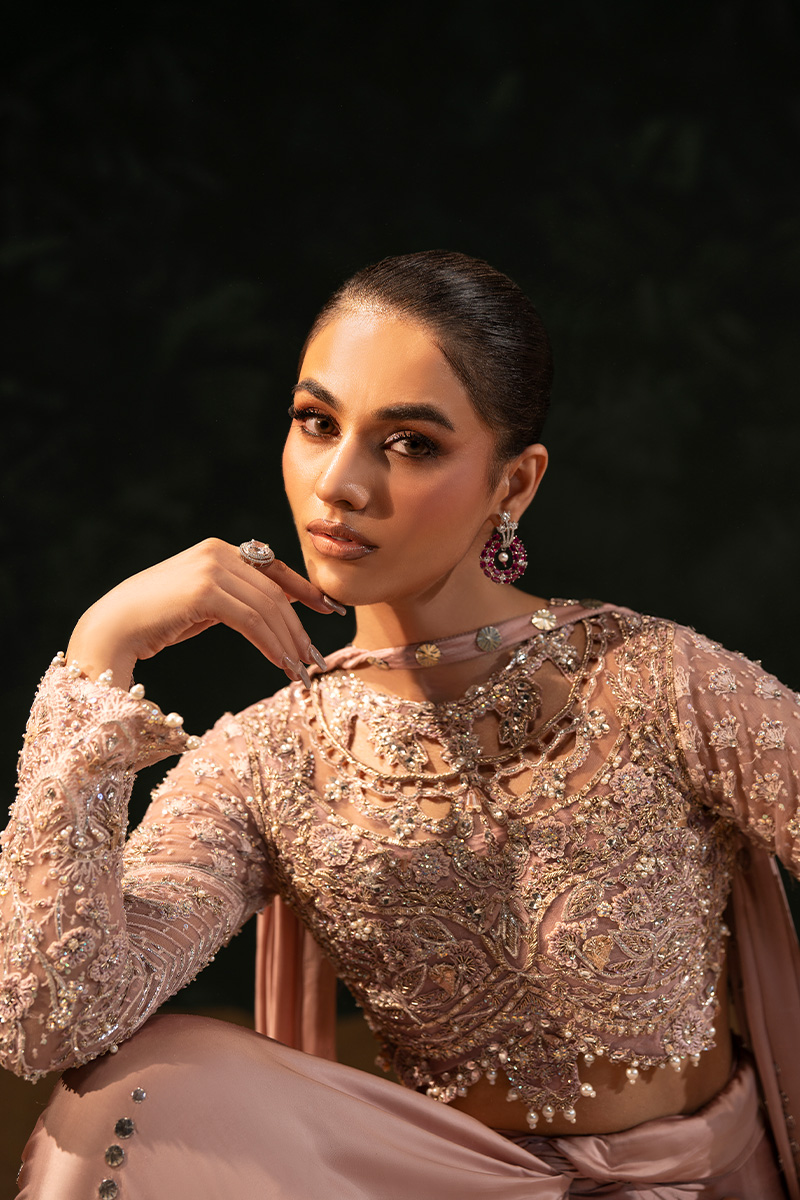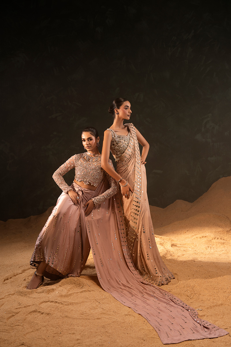 This elegant drape saree is crafted from pure silk, adorned with delicate mukesh work that adds a soft, luminous sheen. Its fluid silhouette offers graceful movement, ideal for formal occasions or festive wear.The blouse, made from sheer net with a silk lining, features intricate embellishments including kora, dabka, gota patti, crystals, sequins, and sitara. Floral and leaf motifs are densely Embroidered, while the neckline is highlighted with artisanal cutwork for added depth and charm. Finished with long sleeves and a high neckline, the look balances modesty with couture sophistication.