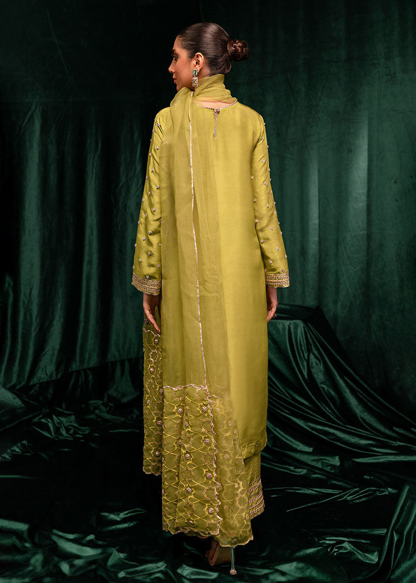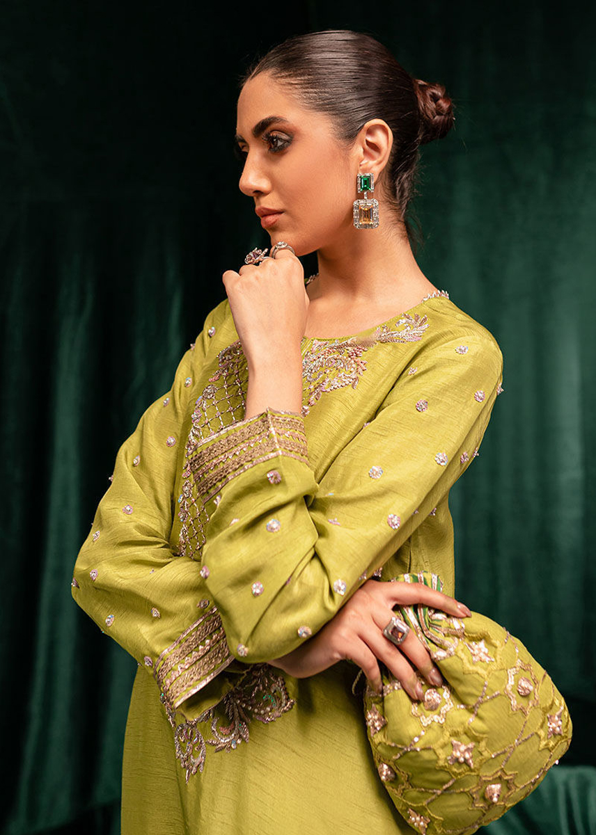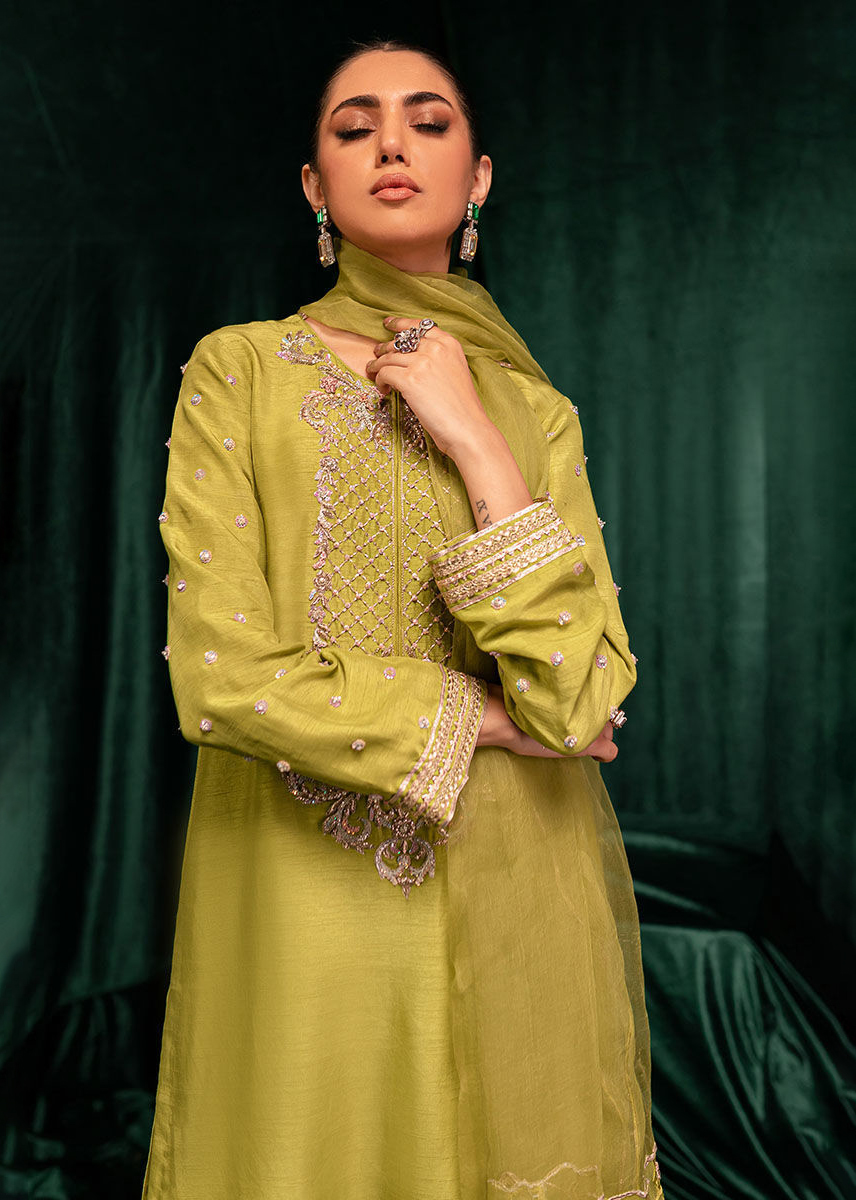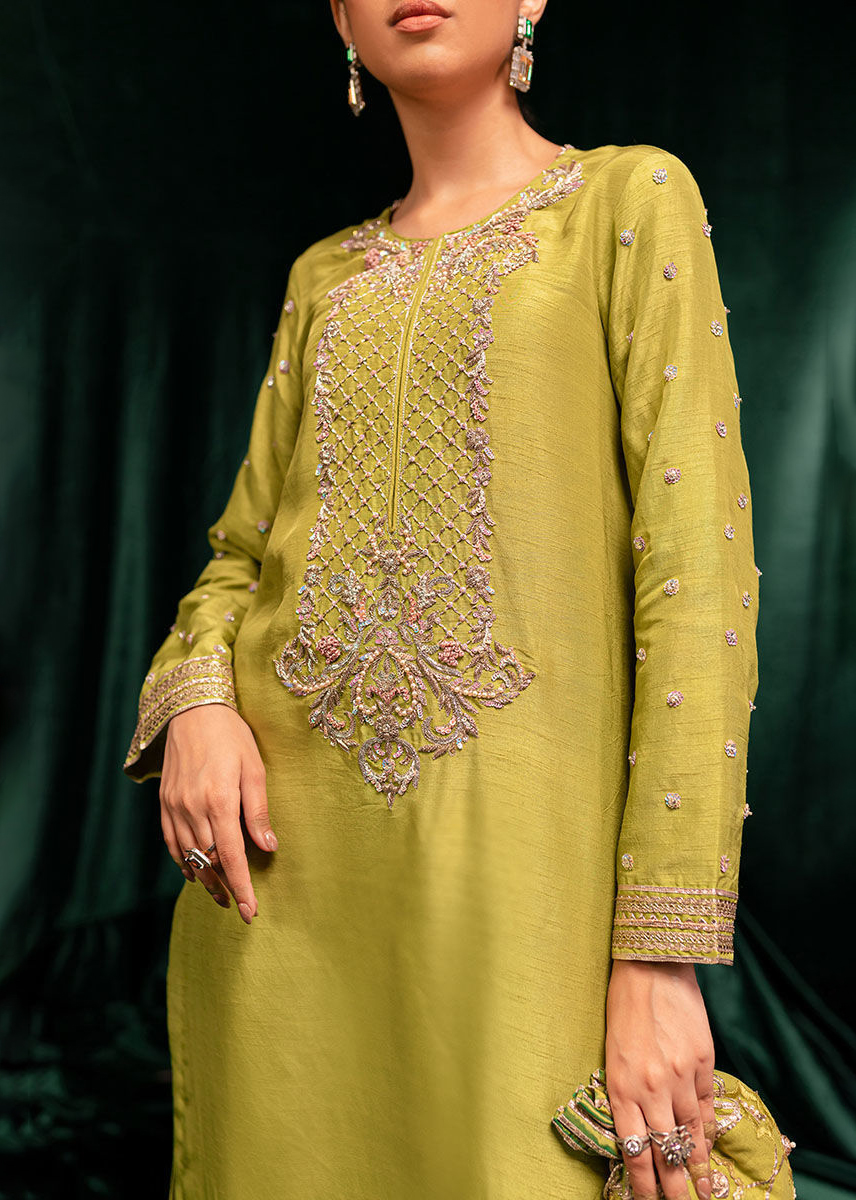 Exquisite neckline with intricately hand embellished floral and geometric patterns in rose gold on green silk. The neckline and sleeves feature dakba, resham, sequin, crystal and gota work. The outfit comes an organza dupatta embellished with gota, sequin and tilla palu. The gota and tilla worked culotte can be added separately.