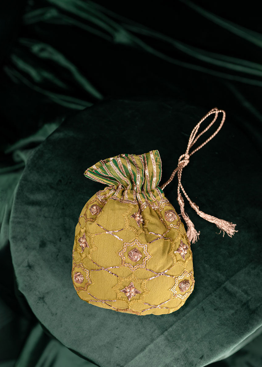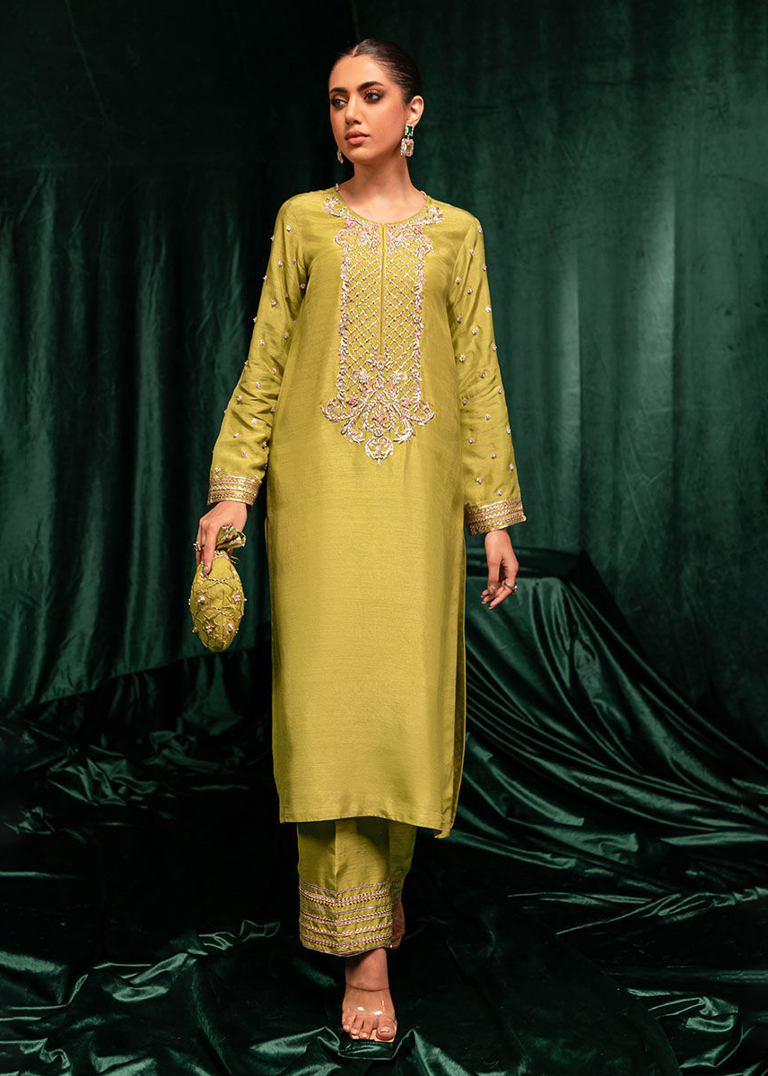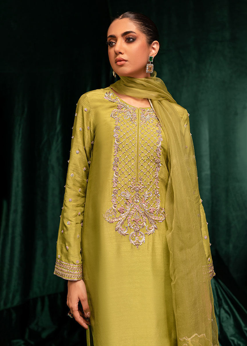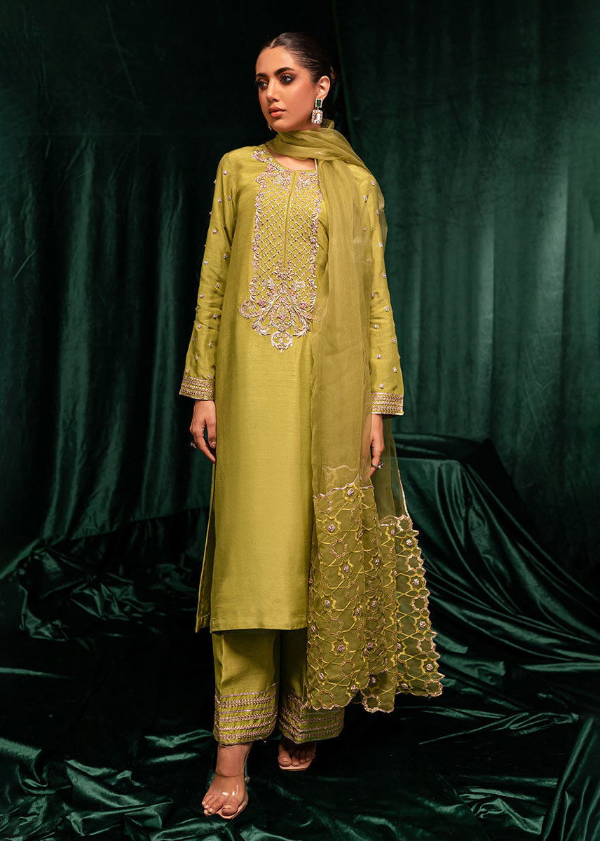 Exquisite neckline with intricately hand embellished floral and geometric patterns in rose gold on green silk. The neckline and sleeves feature dakba, resham, sequin, crystal and gota work. The outfit comes an organza dupatta embellished with gota, sequin and tilla palu. The gota and tilla worked culotte can be added separately.