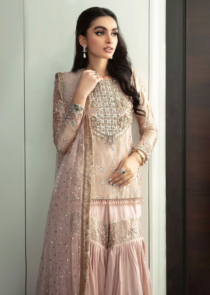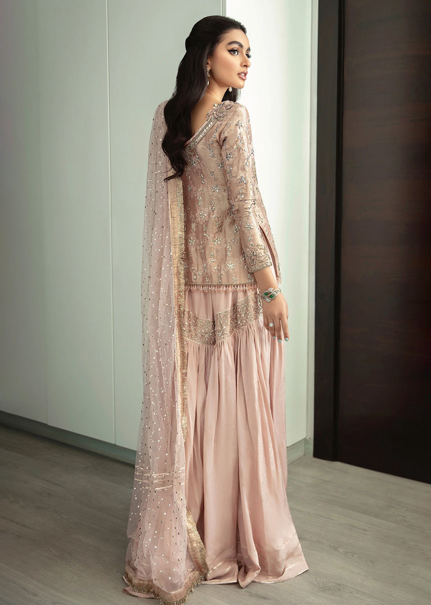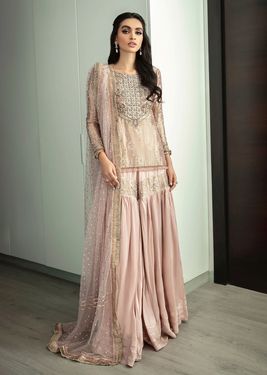 A blend of tradition and modern fusion, the sharara incorporates an exquisite appeal. The three-piece formal ensemble consisting of a raw Silk gharara, rose gold tissue shirt and a tulle kamdani dupatta is embellished in the most intricate ways which exudes leisure and elegance with its breathtaking detailing.