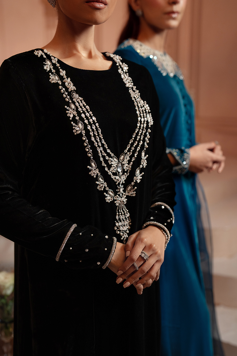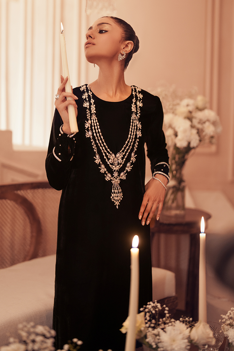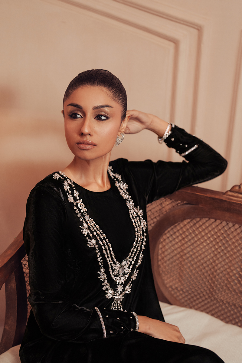 A black velvet kaftan shirt adorned with a silver hand-embellished Victorian rani haar inspired neckline and sleeves, highlighted with a diamante detailing. Paired with elegant silk trousers, this outfit combines traditional charm with modern sophistication.