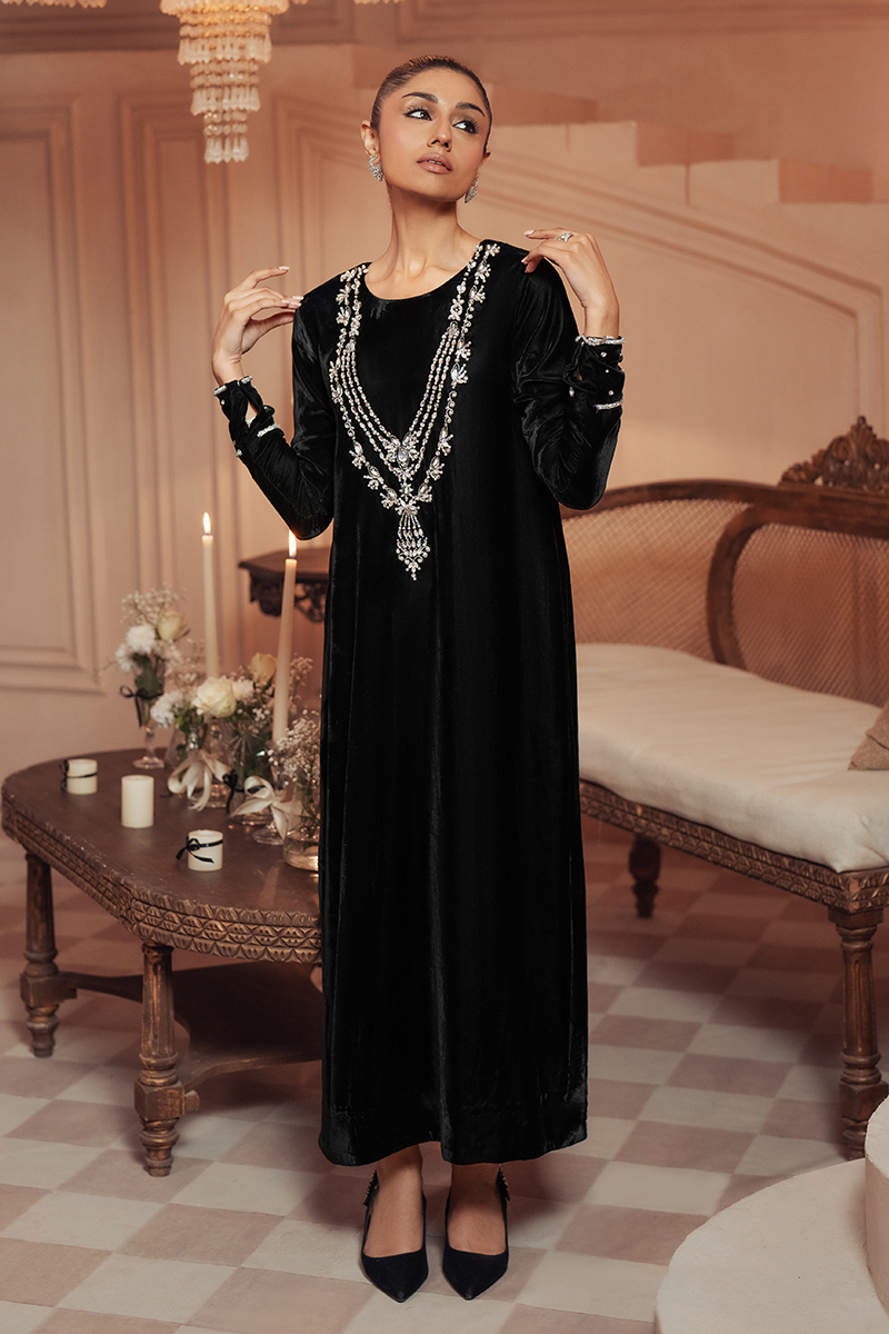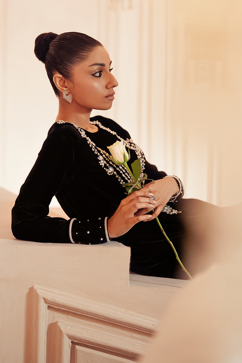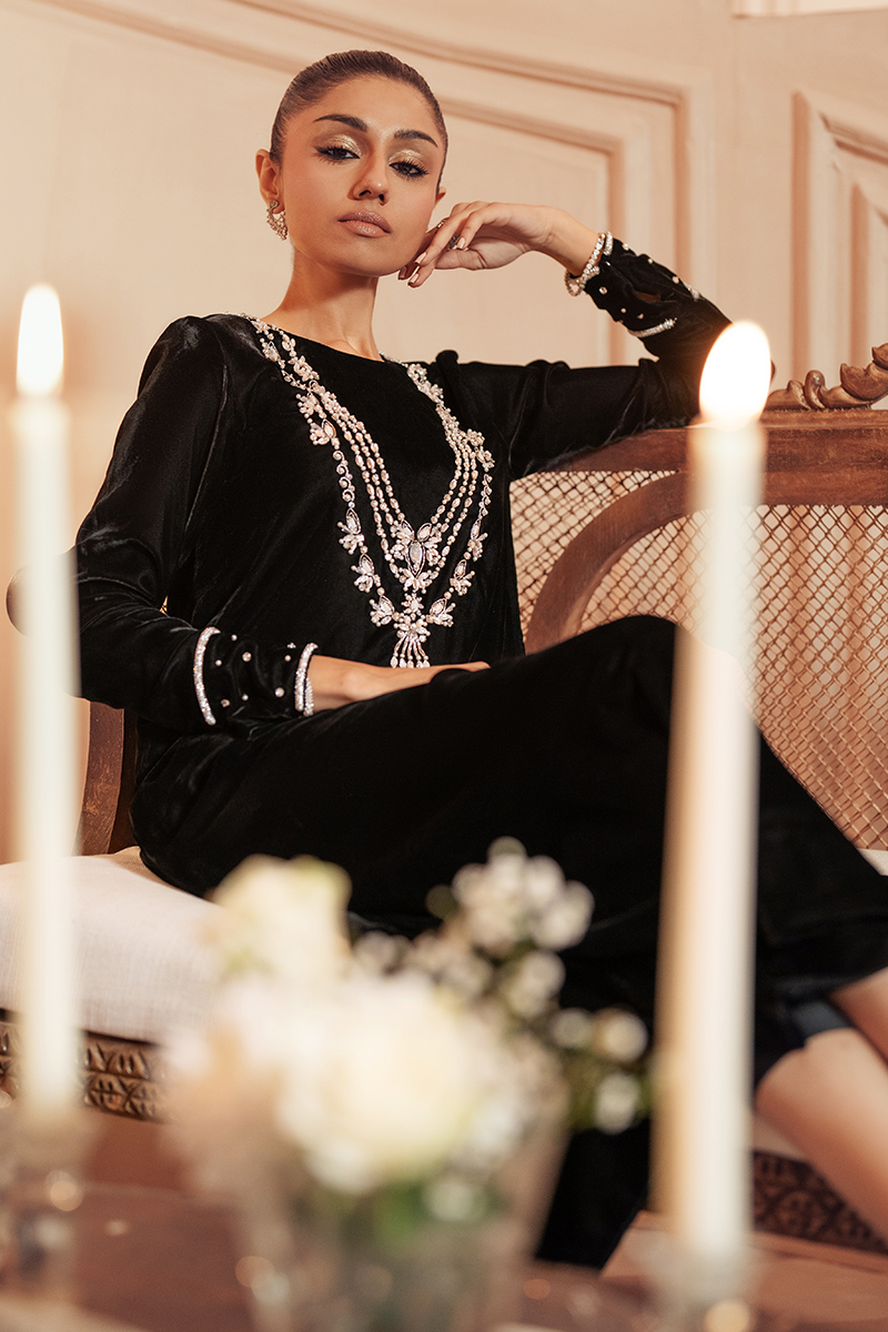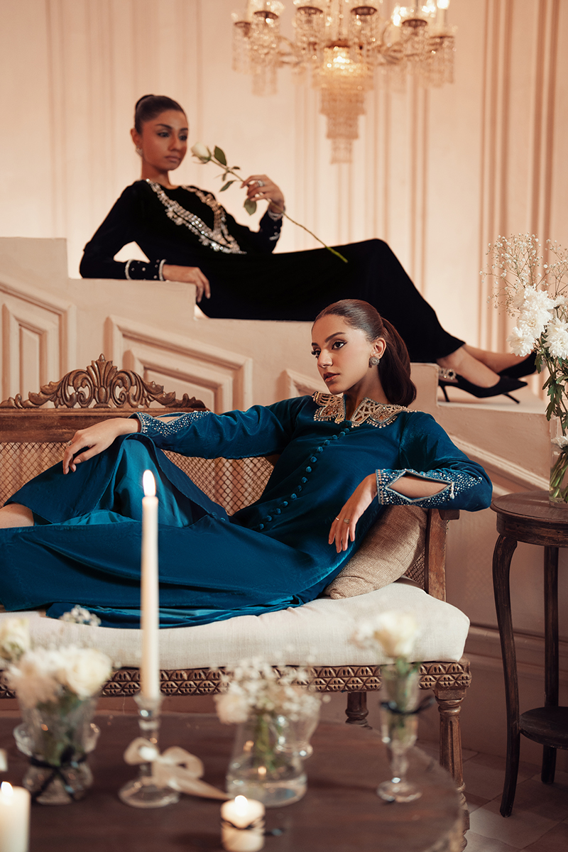 A black velvet kaftan shirt adorned with a silver hand-embellished Victorian rani haar inspired neckline and sleeves, highlighted with a diamante detailing. Paired with elegant silk trousers, this outfit combines traditional charm with modern sophistication.